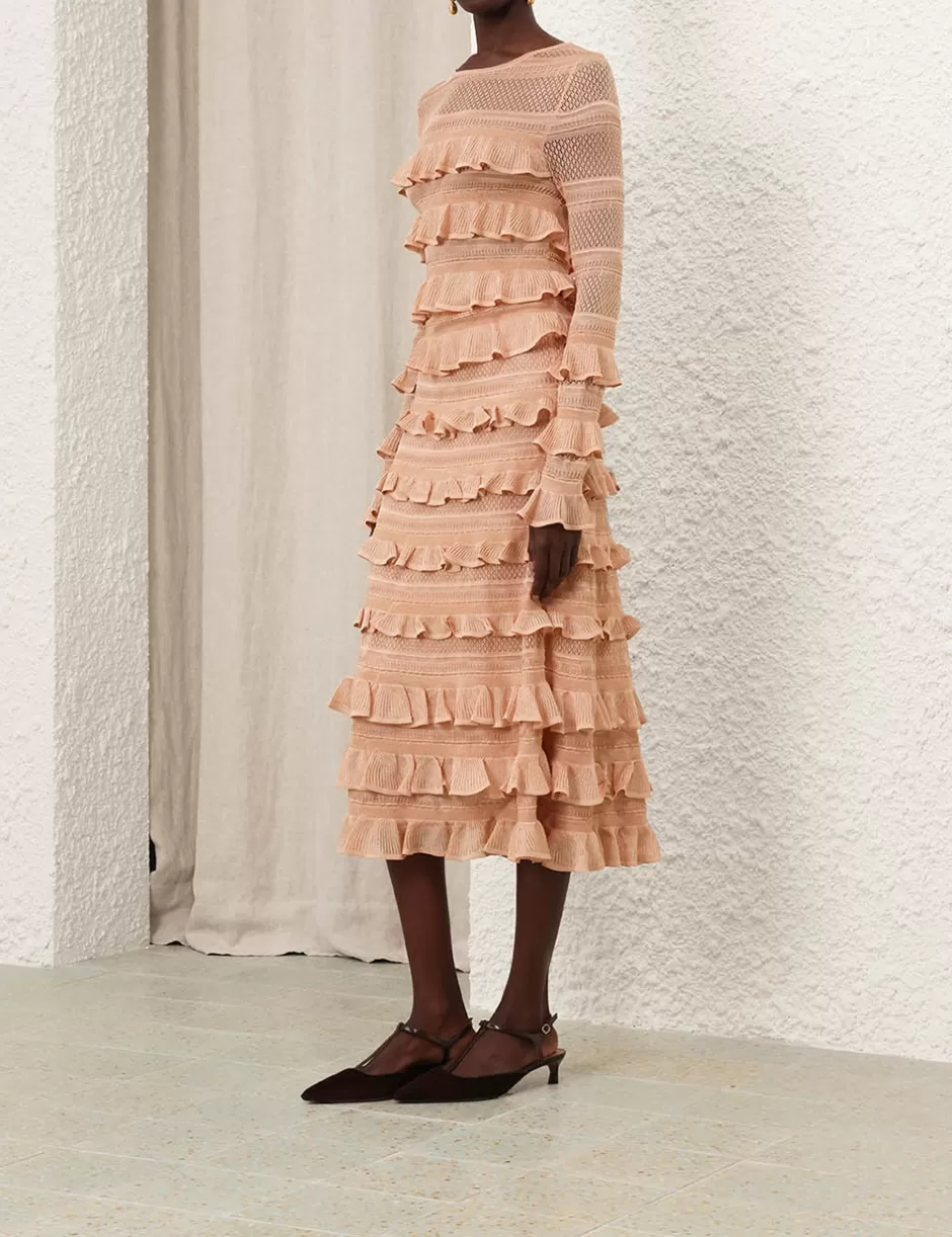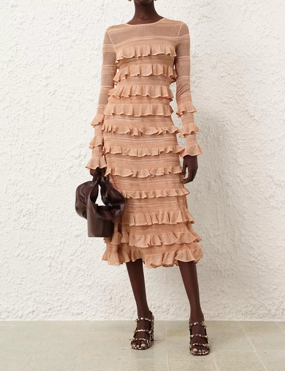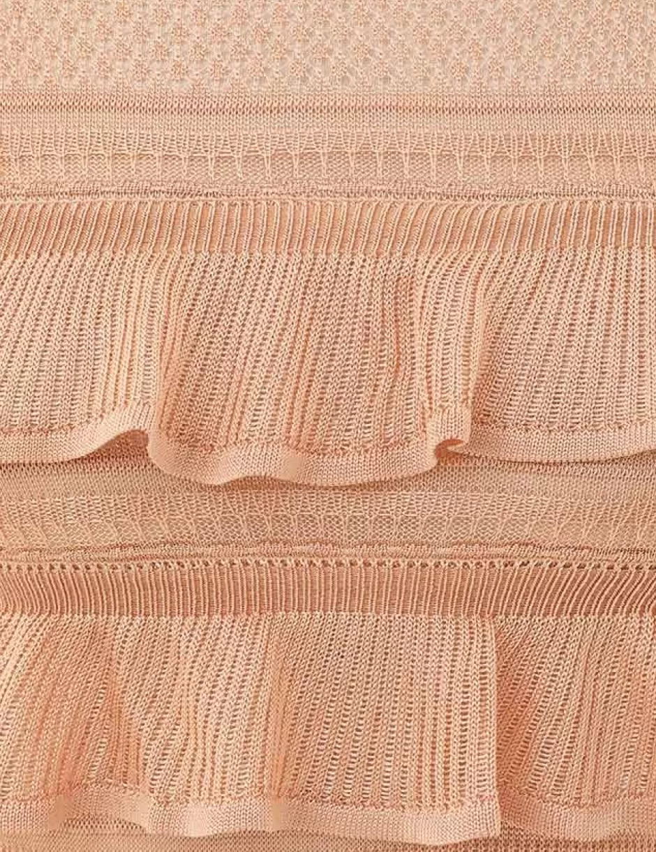 The Illustration Frilled Top in Champagne from our Fall 2024 Collection, In Illustration. A knit top featuring long sleeves and a scoop neck; finished with ruffles throughout.