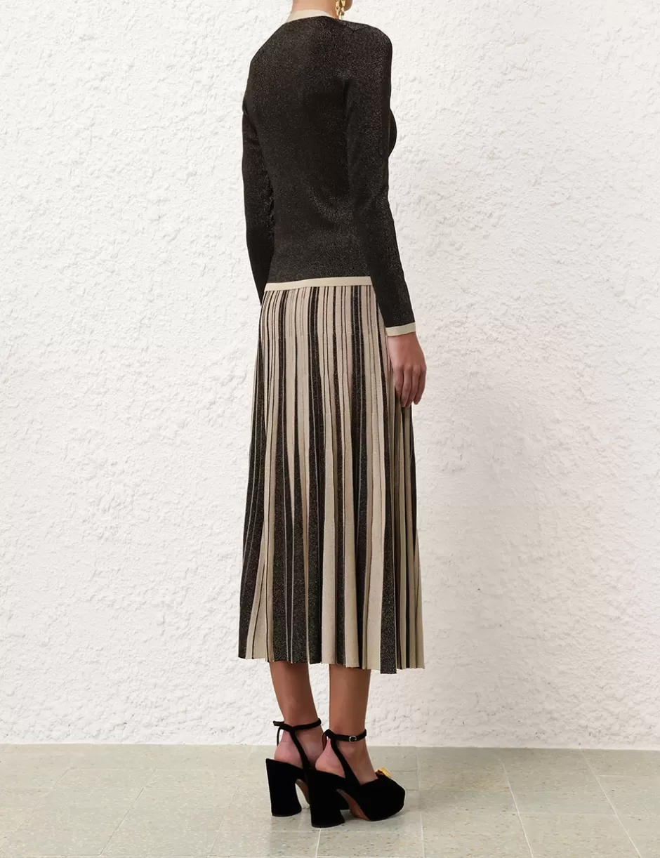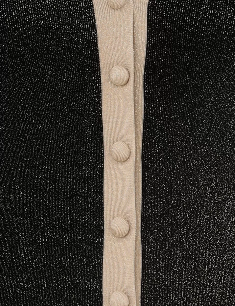 The Illustration Metallic Cardigan in Black/Gold from our Fall 2024 Collection, In Illustration. A long sleeve cardigan featuring a metallic finish, buttons down the centre front, and contrast neckline, cuffs, and hem edge.