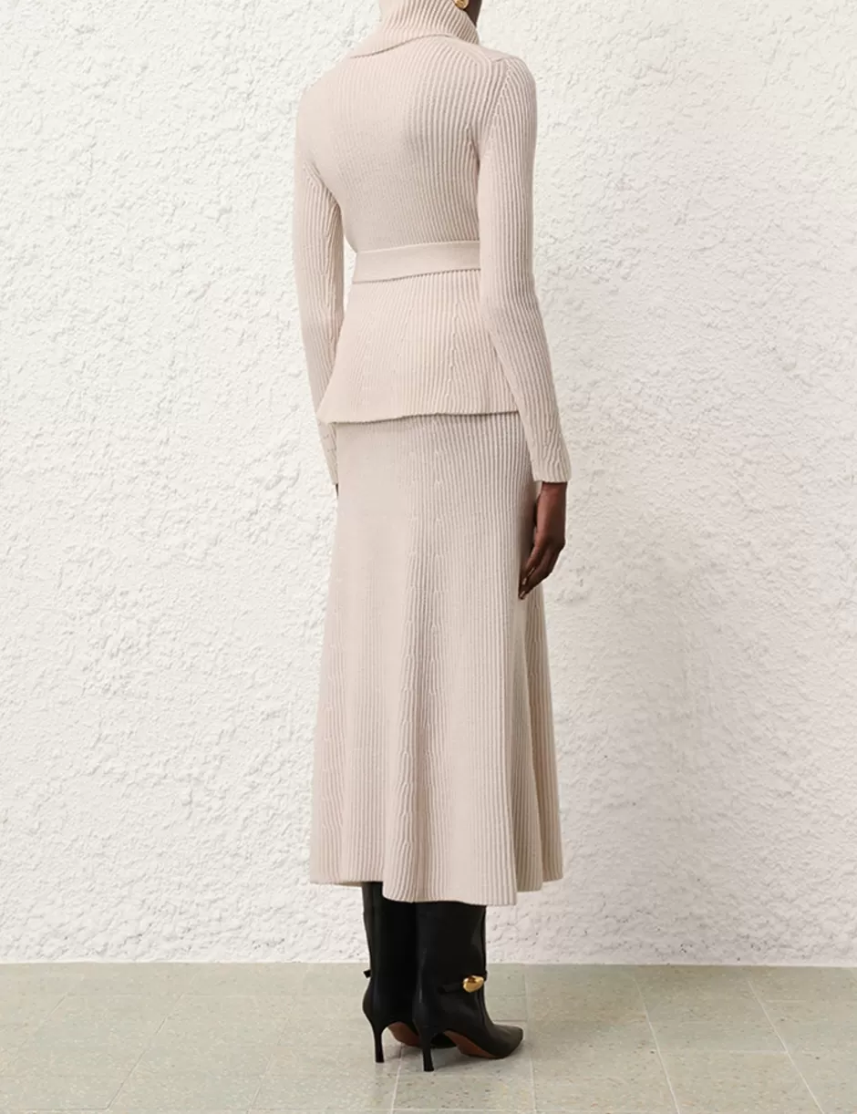 The Illustration Peplum Sweater in Cream from our Fall 2024 Collection, In Illustration. A ribbed peplum long sleeve sweater featuring a high rolled neck and a self tie waist belt.