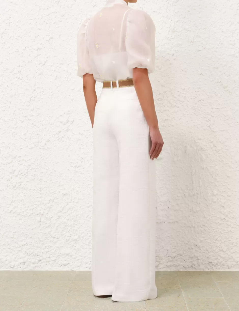 The Acacia Flare Pant in Ivory from our Resort Swim 2025 Collection. A high waisted linen pant featuring centre front leg tucks, side hip pockets and a removable raffia belt.
