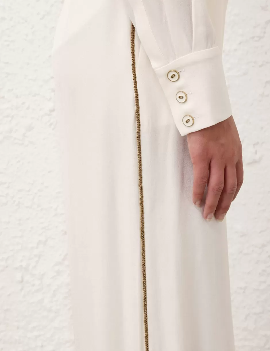 The Belted Chain Pant in Cream from our Fall 2024 Collection, In Illustration. A wide leg pant featuring gold trim, side seam pockets and a self cover buckle belt.