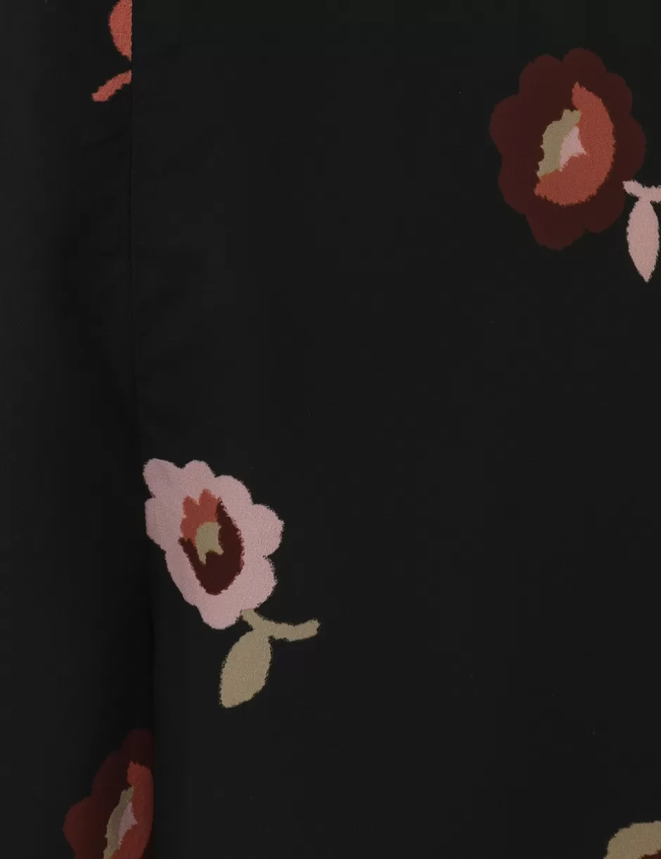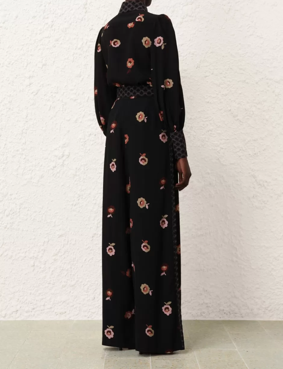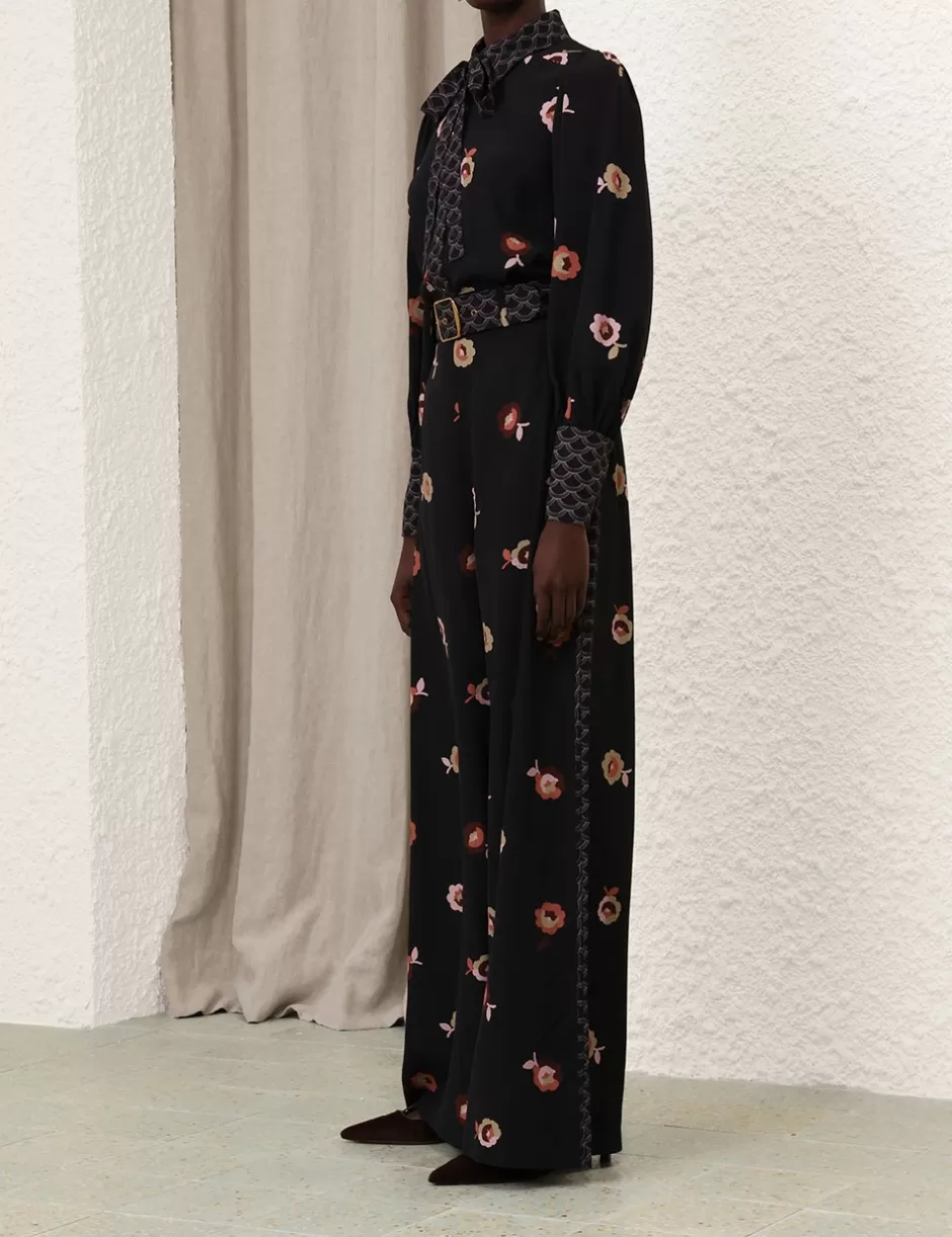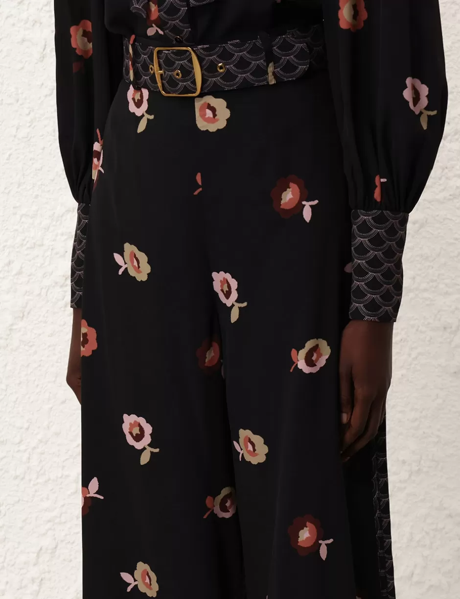 The Belted Wide Leg Pant in Black Floral from our Fall 2024 Collection, In Illustration. A high waisted, wide leg pant featuring a contrast side seam and a removable buckle belt.