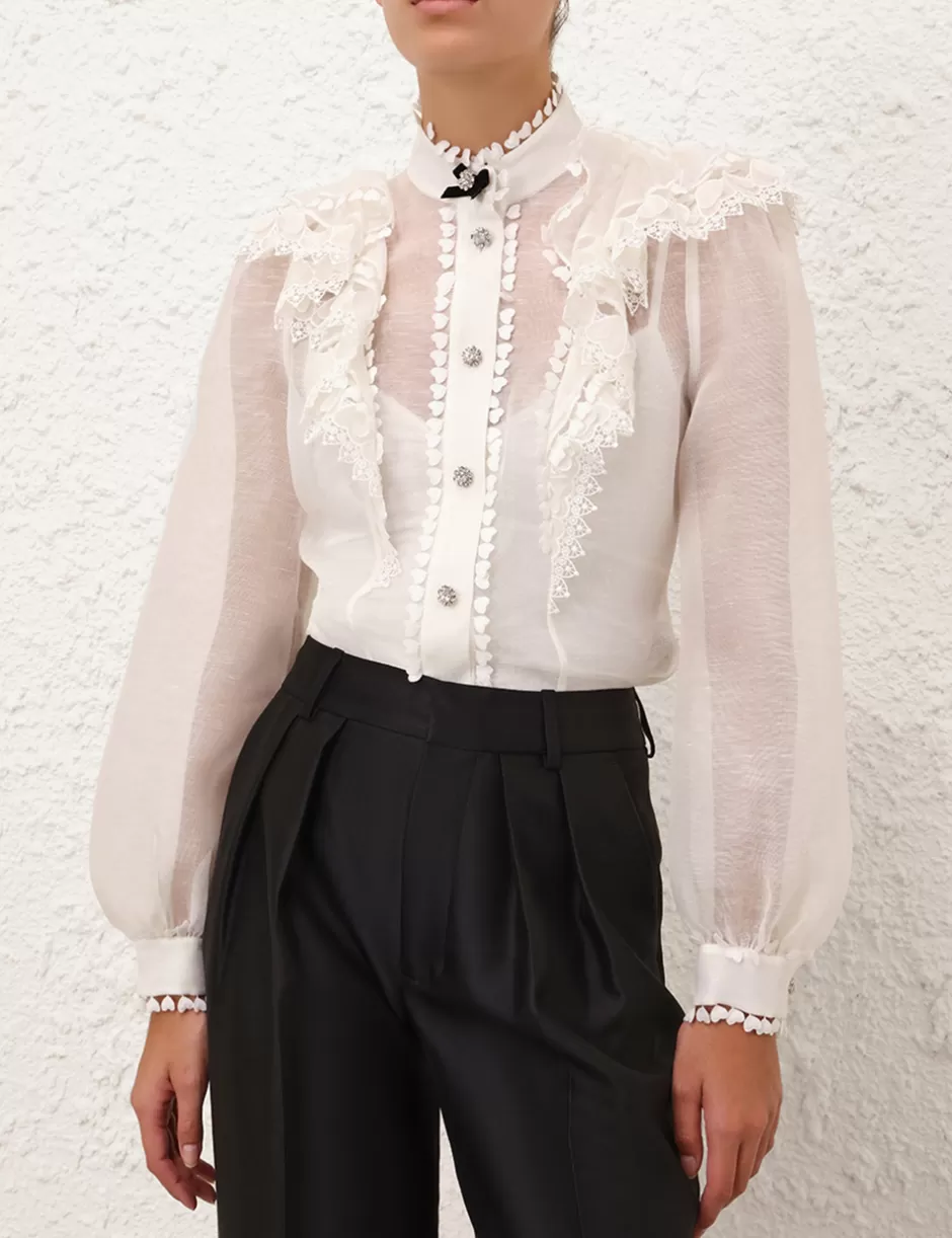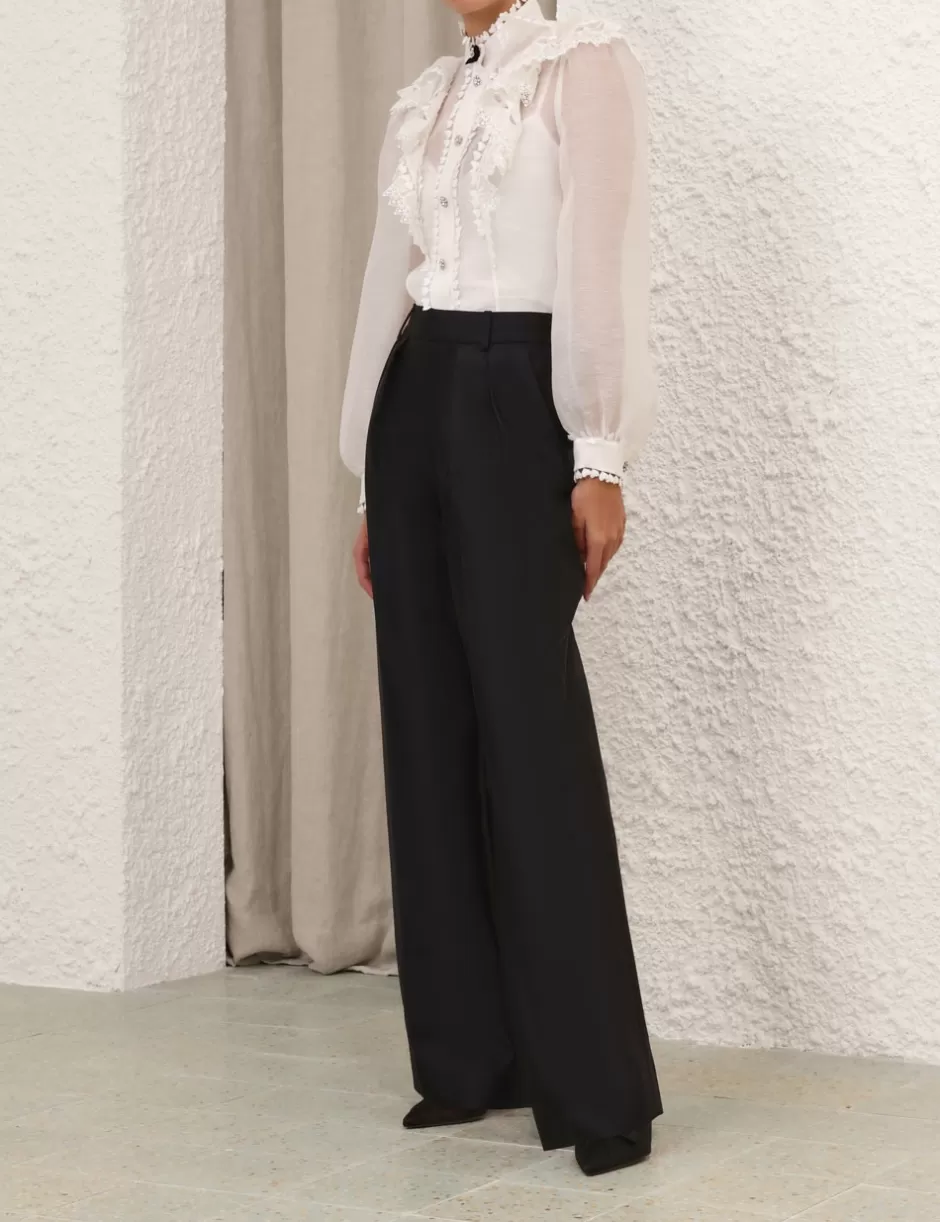 The Crush Tuck Wide Leg Pant in Black from our Resort 2025 Collection, Crush. A silk wool blend wide leg, mid rise pant featuring side seam pockets and a front fly closure.