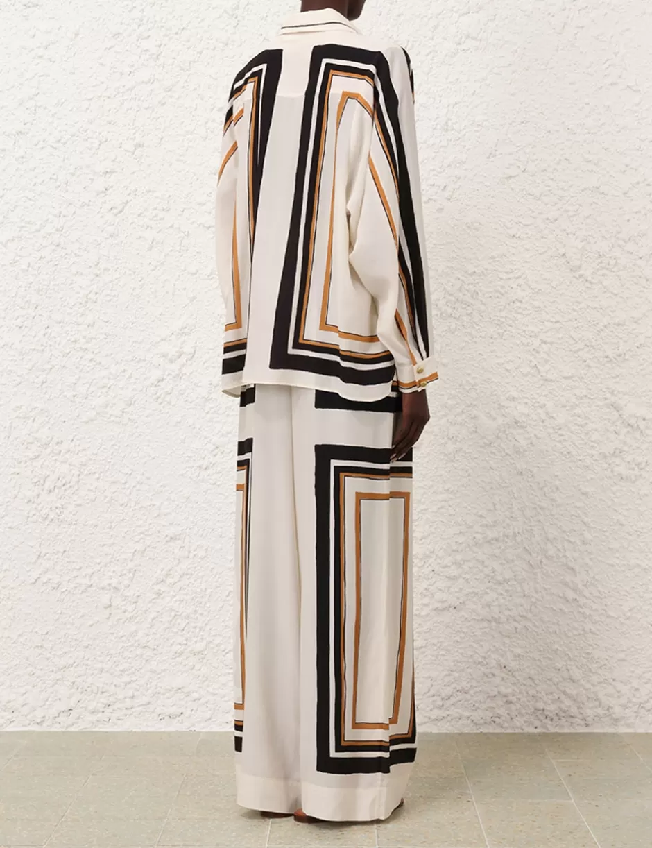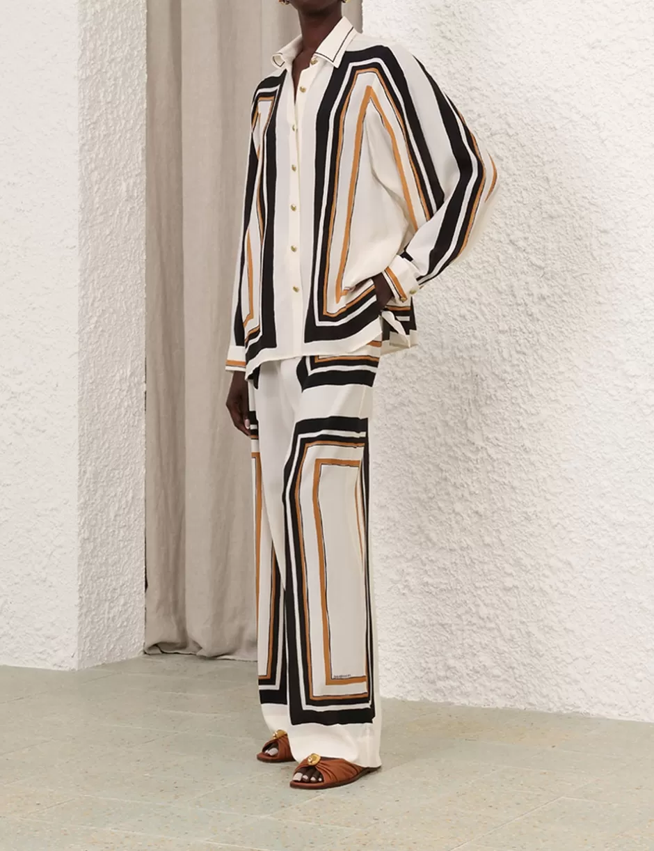 The Draw Waist Pant in Stripe from our Resort 2025 Collection, Crush. A silk blend wide leg pant featuring an elasticated waistband and side seam pockets.