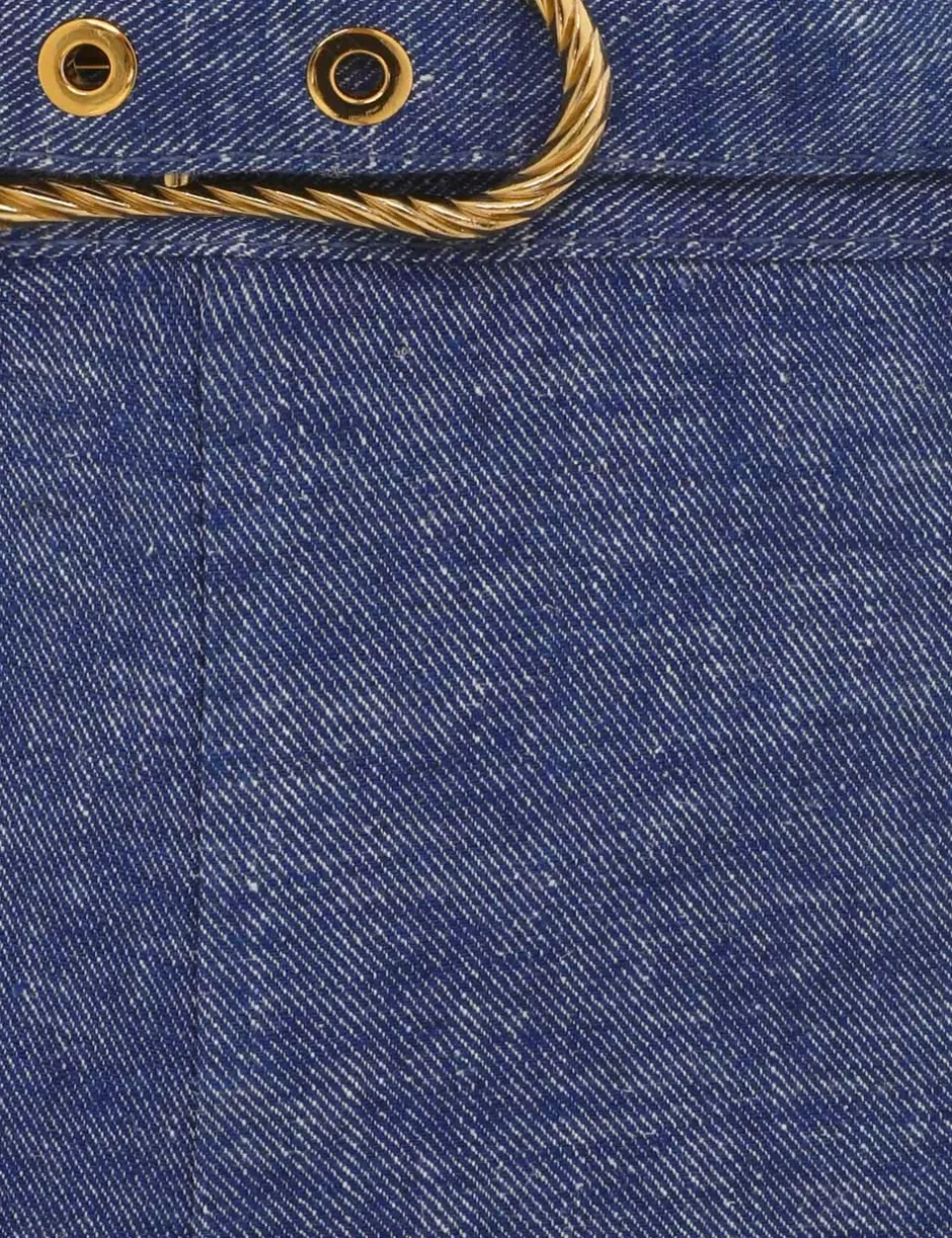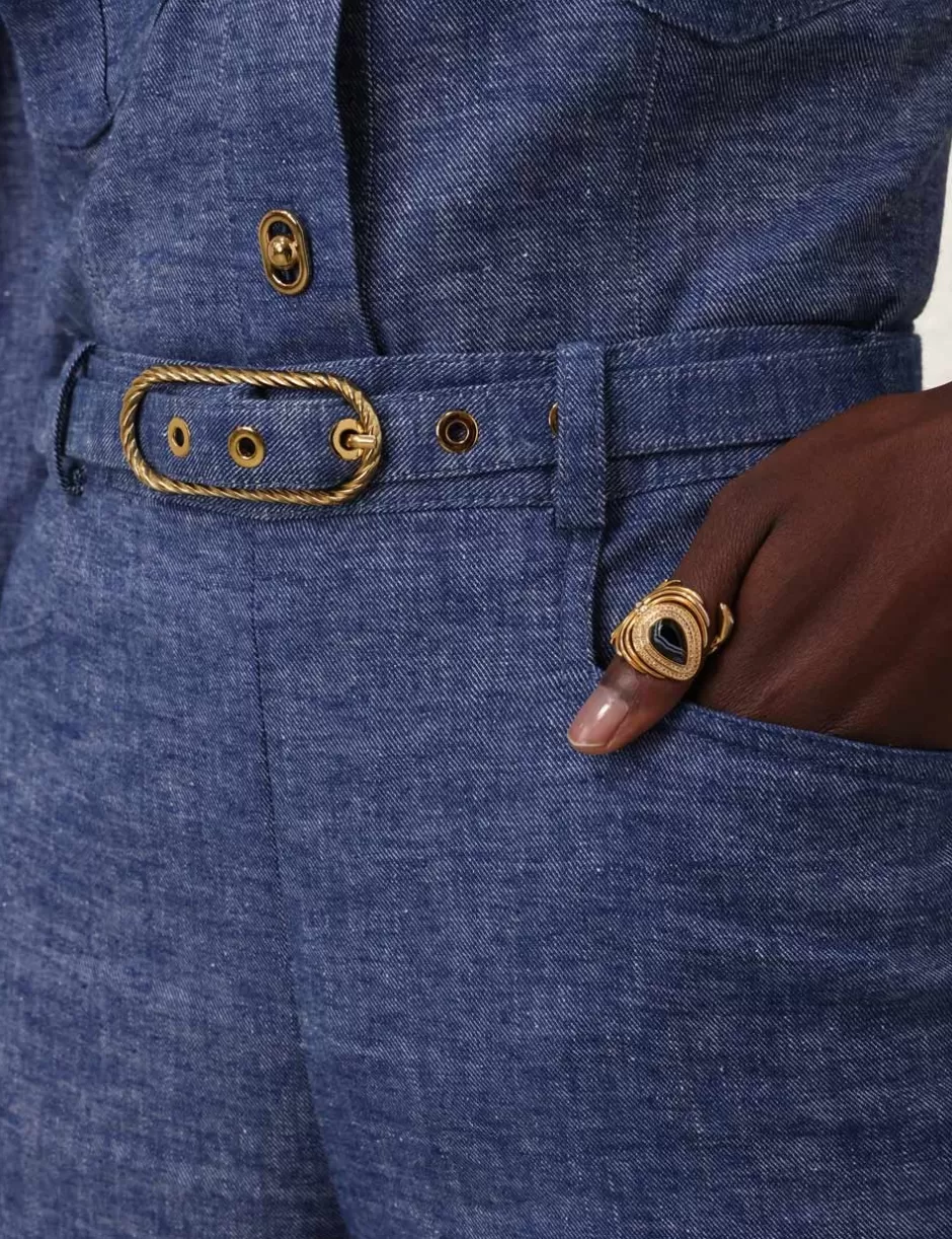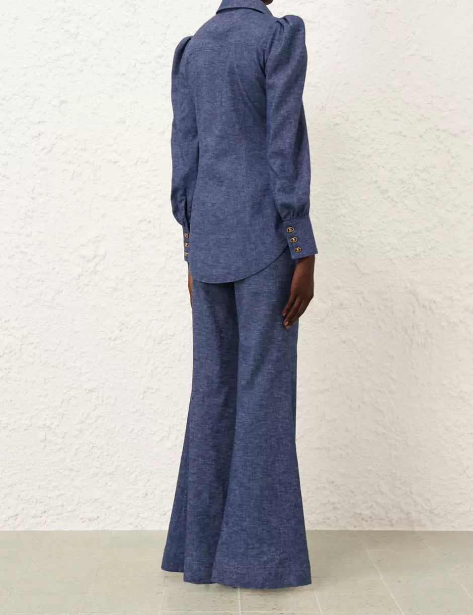 The Eden Chambray Flare Pant in Chambray from our Fall 2024 Collection, In Illustration. A linen flared leg pant featuring front pockets, a self cover buckle belt and a centre back zip.