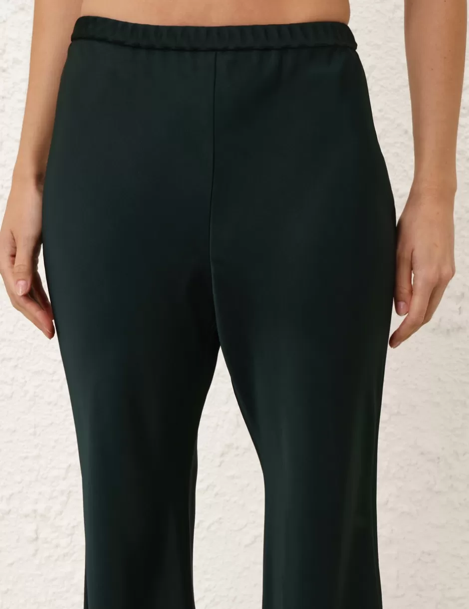The Eden Slouch Flare Pant in Bottle Green from our Fall 2024 Collection, In Illustration. A wide leg flared pant featuring an elasticated waistband.