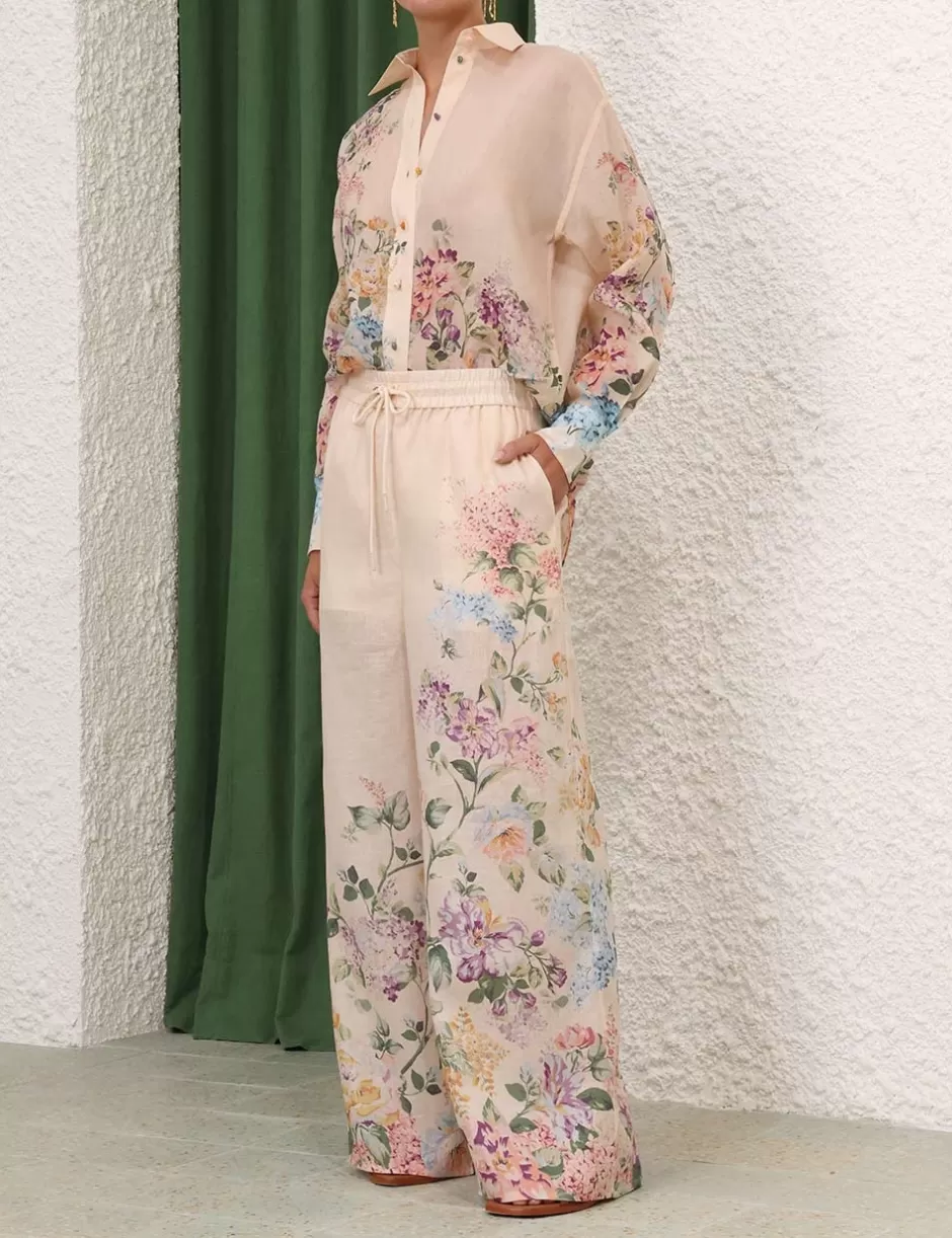 The Halliday Relaxed Pant in Cream Watercolour Floral from our Summer Swim 2024 Collection. A linen wide leg pant featuring a drawcord waistband.