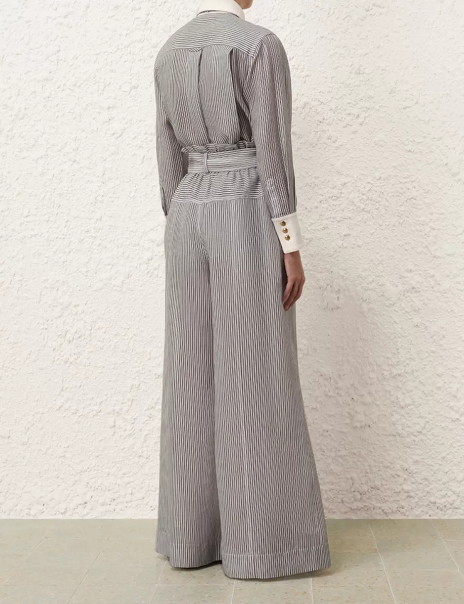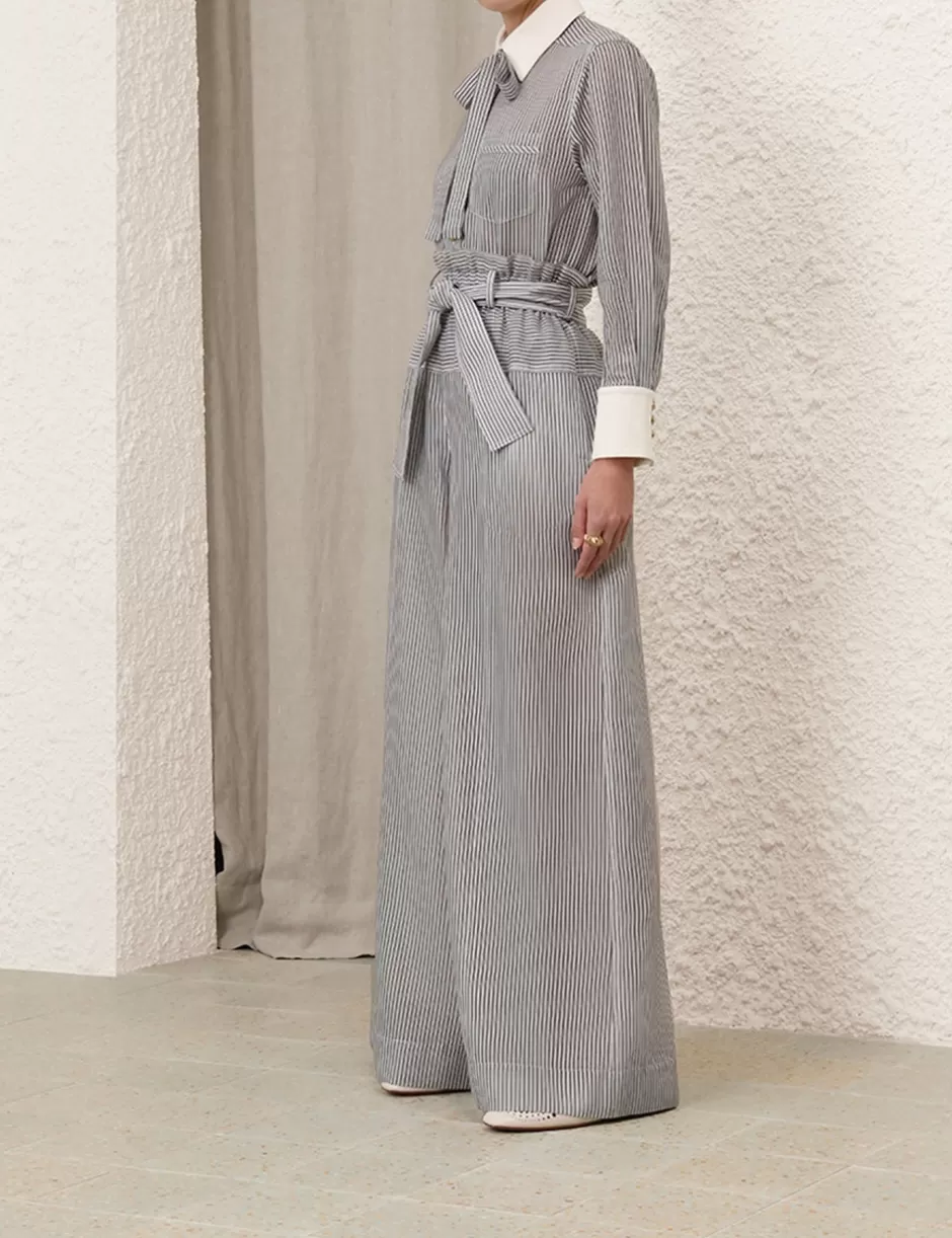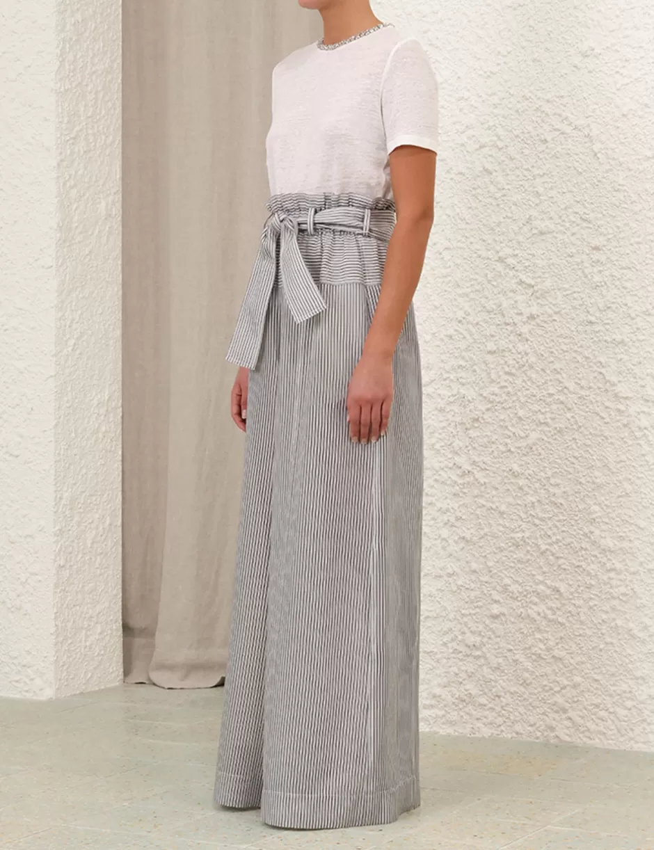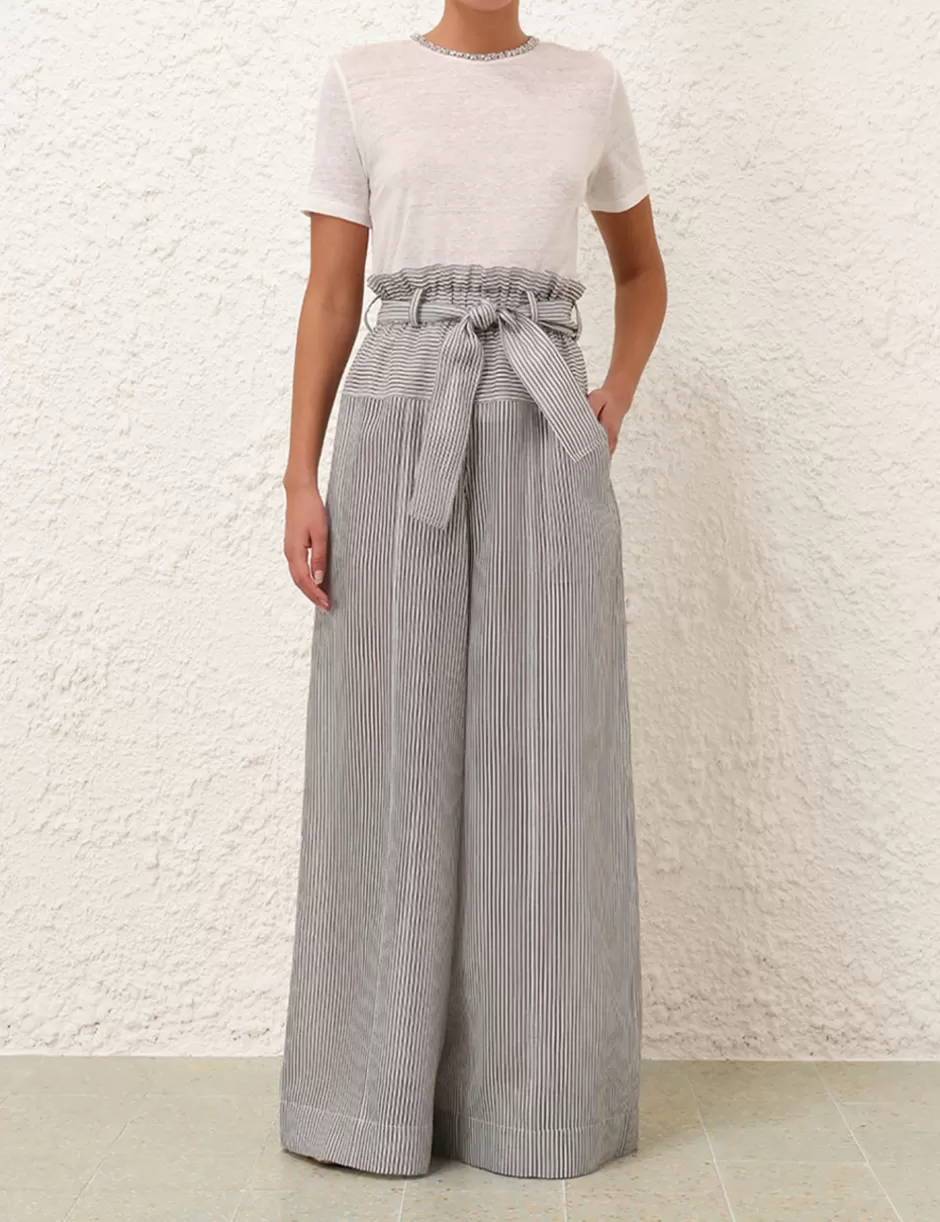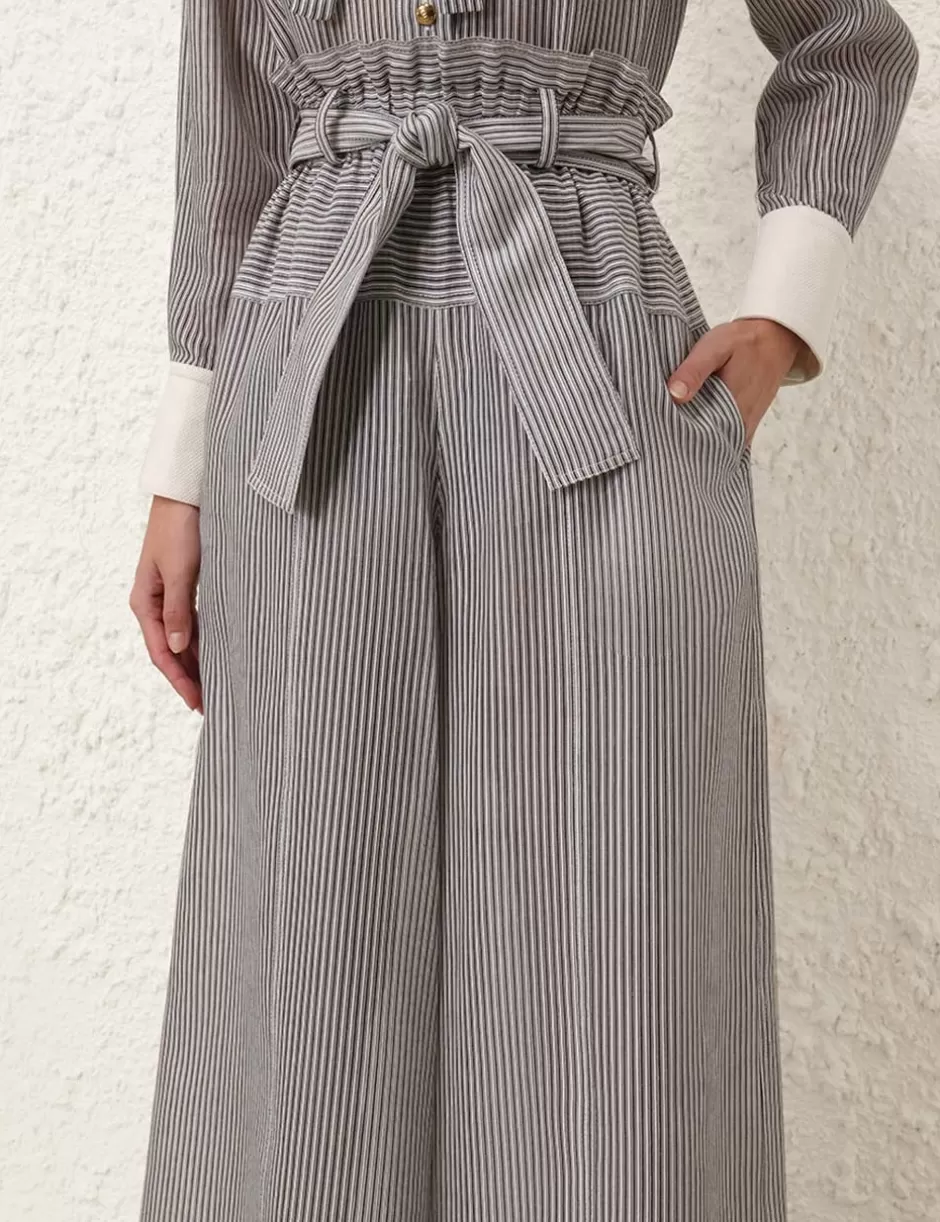 The Illustration Paperbag Pant in Stripe from our Fall 2024 Collection, In Illustration. A high waisted pant featuring a flared silhouette and a self tie waist.