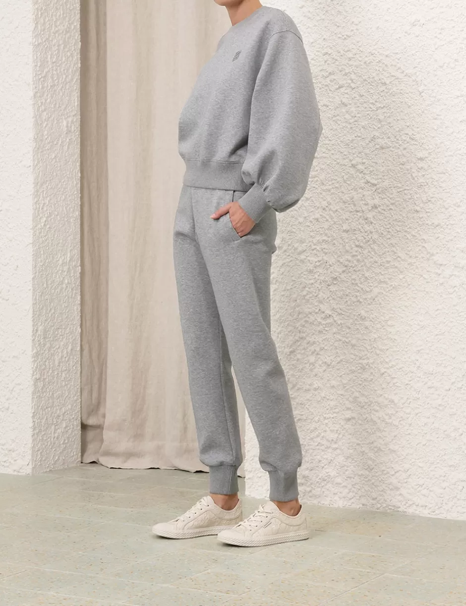 The Illustration Track Pant in Grey Marle from our Fall 2024 Collection, In Illustration. A track pant featuring ribbed detailing on waistband and cuffs.