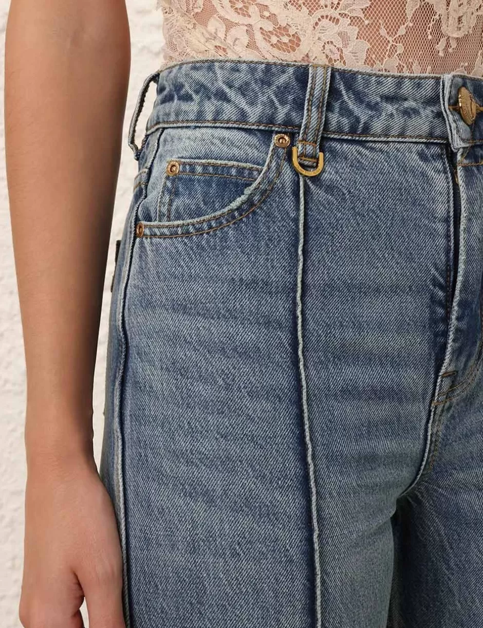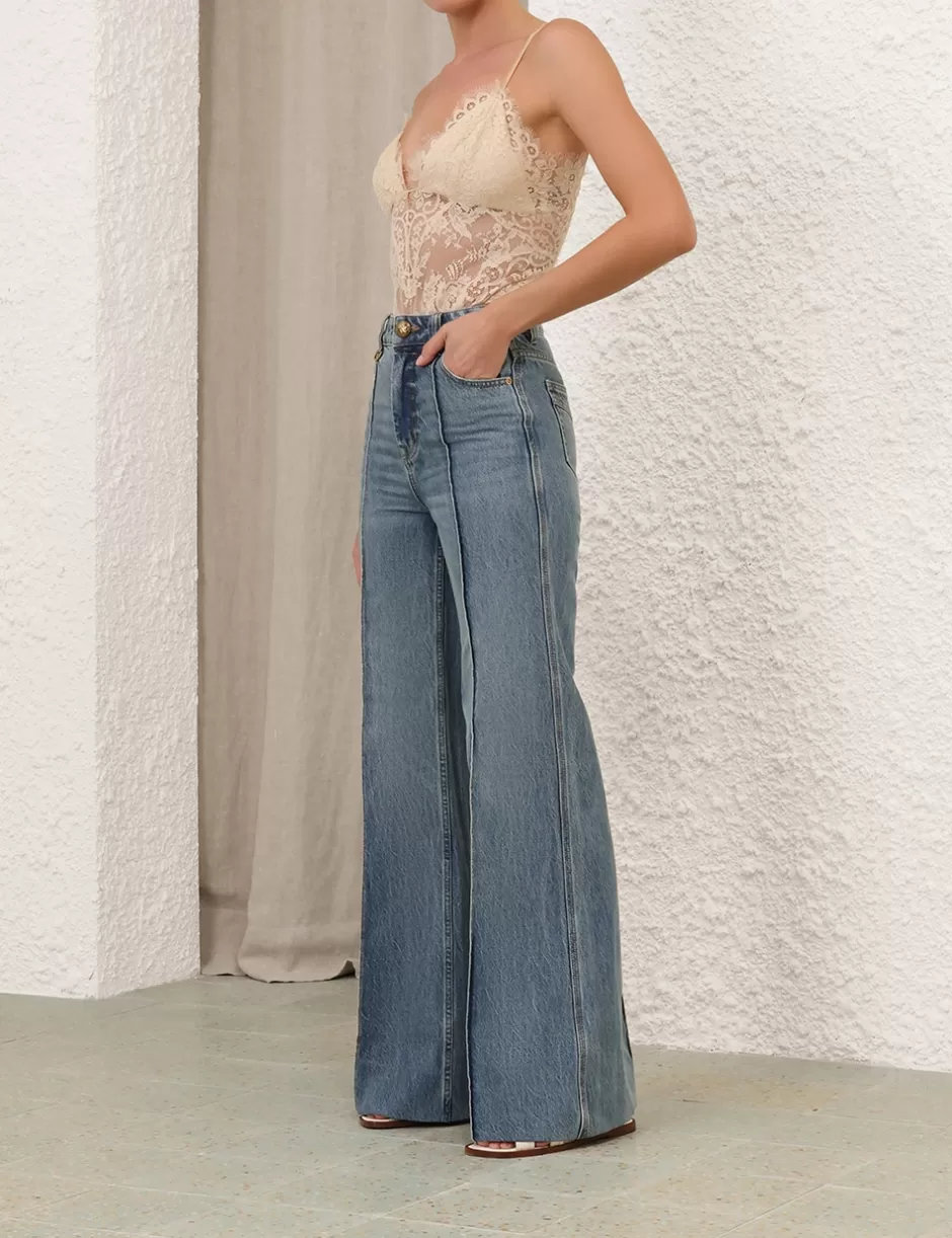 The Illustration Wide Leg Jean in Neptune from our Fall 2024 Collection, In Illustration. A high waisted denim jean featuring a wide flared leg and pin stitched centre leg creases.