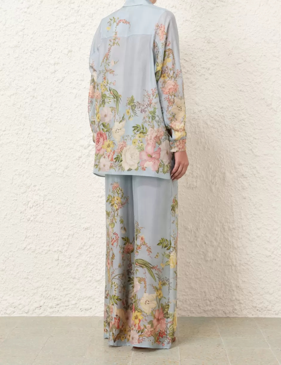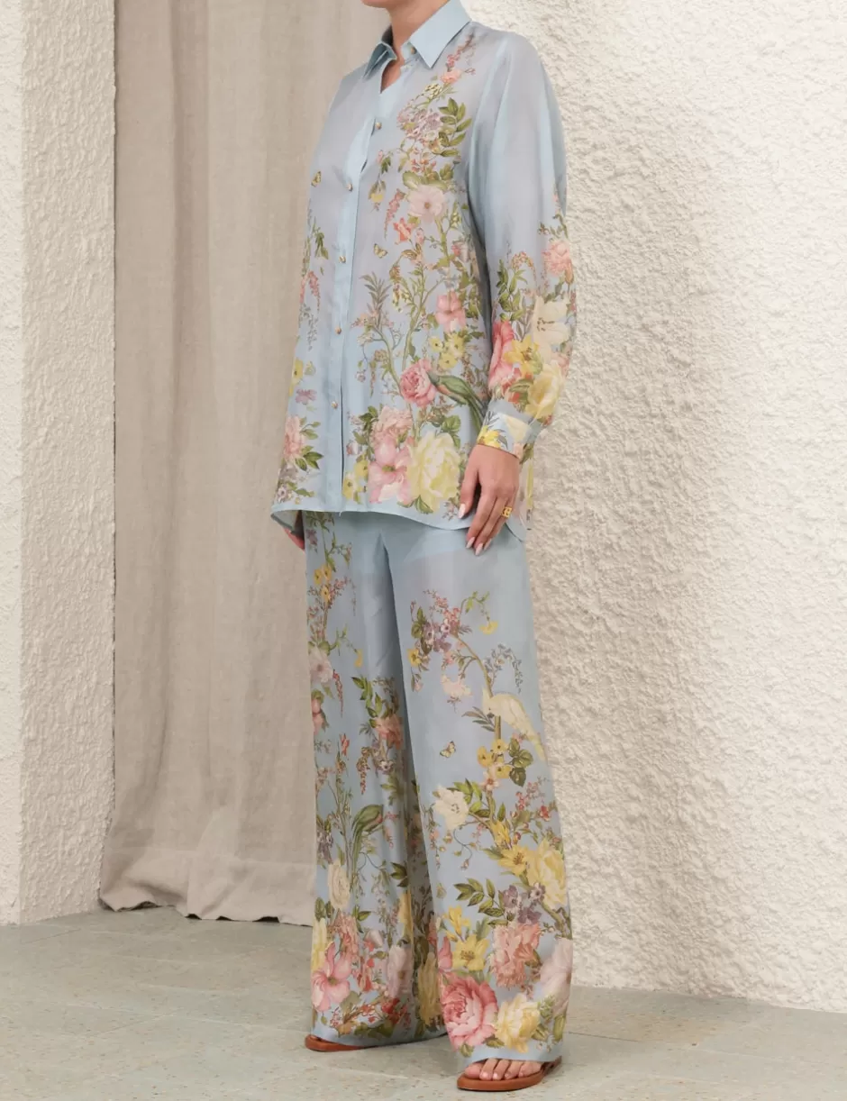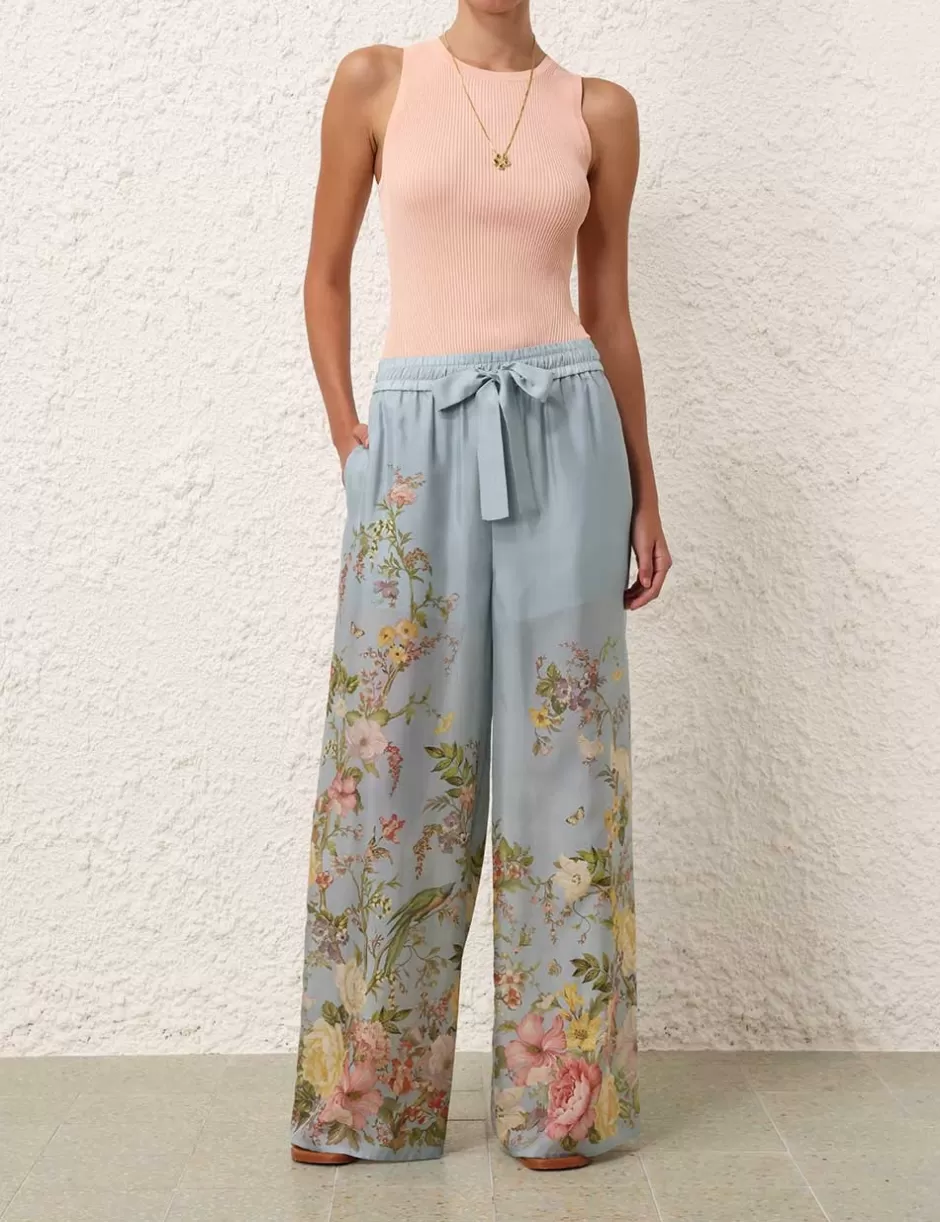 The Waverly Relaxed Pant in Blue Floral from our Summer Swim 2024 Collection. A silk wide leg pant featuring an elasticated waistband and side seam pockets.