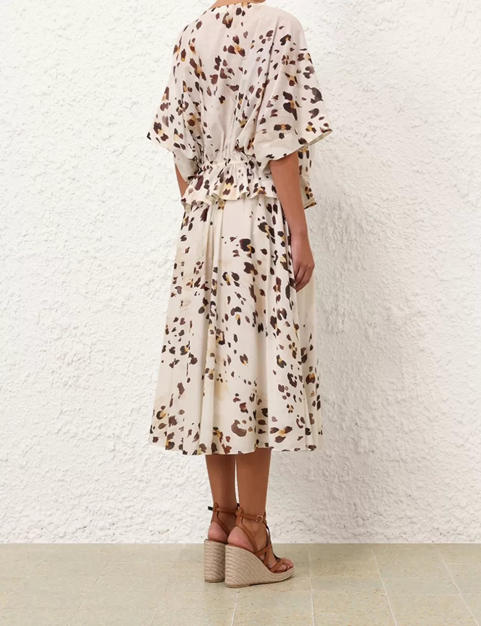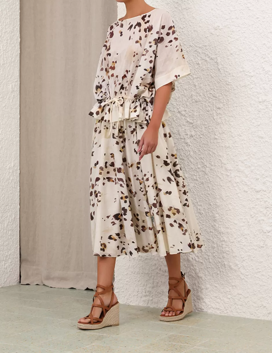 The Acacia Swing Skirt in Watercolour Leopard from our Resort Swim 2025 Collection. A cotton midi skirt featuring an elasticated waist and side seam pockets.