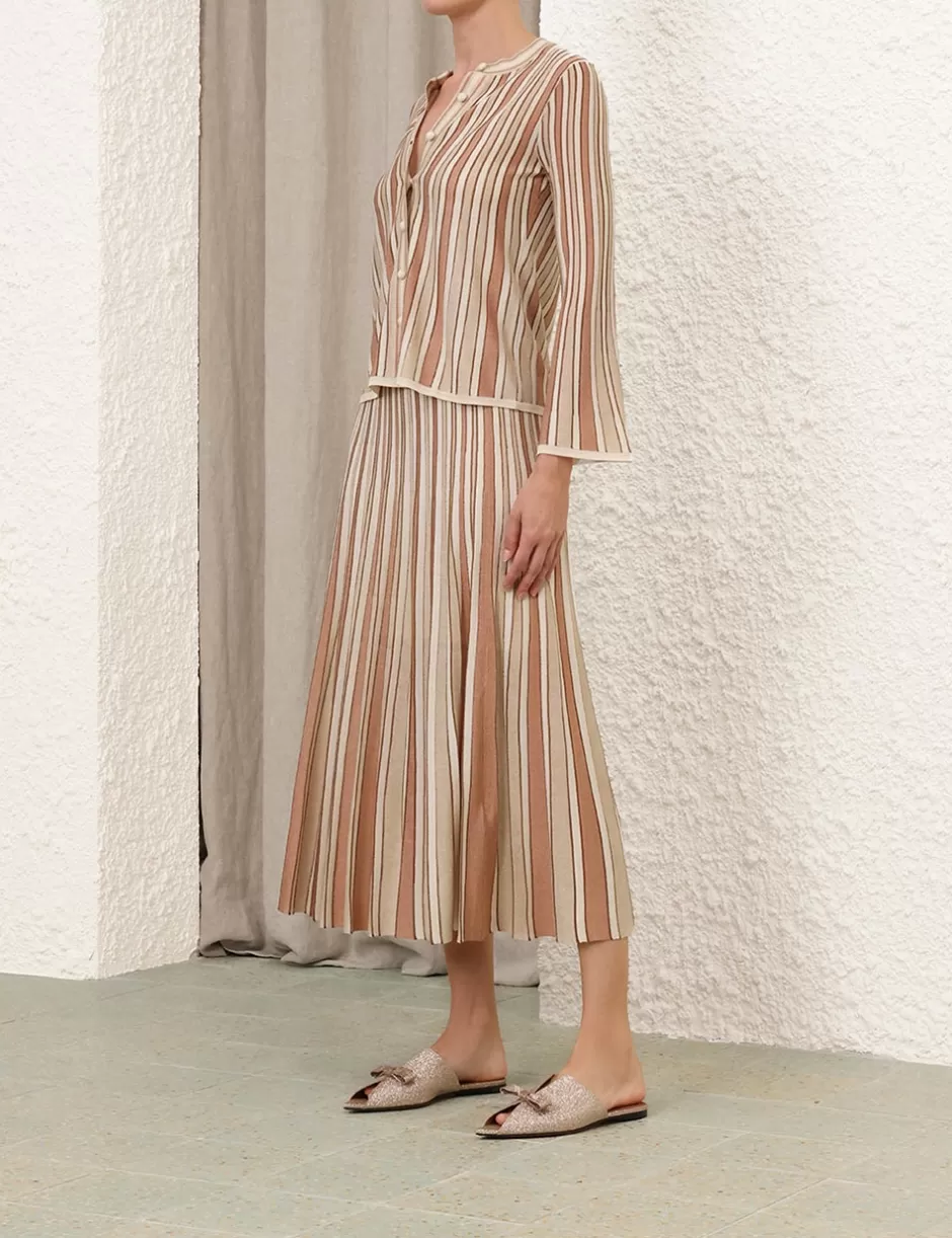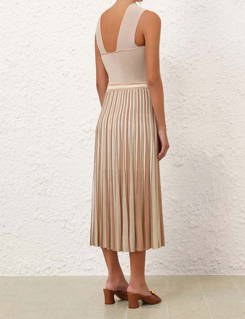 The Crush Metallic Stripe Skirt in Multi from our Resort 2025 Collection, Crush. A knit midi skirt featuring contrast stripes, an elasticated waist and a soft A-line silhouette.