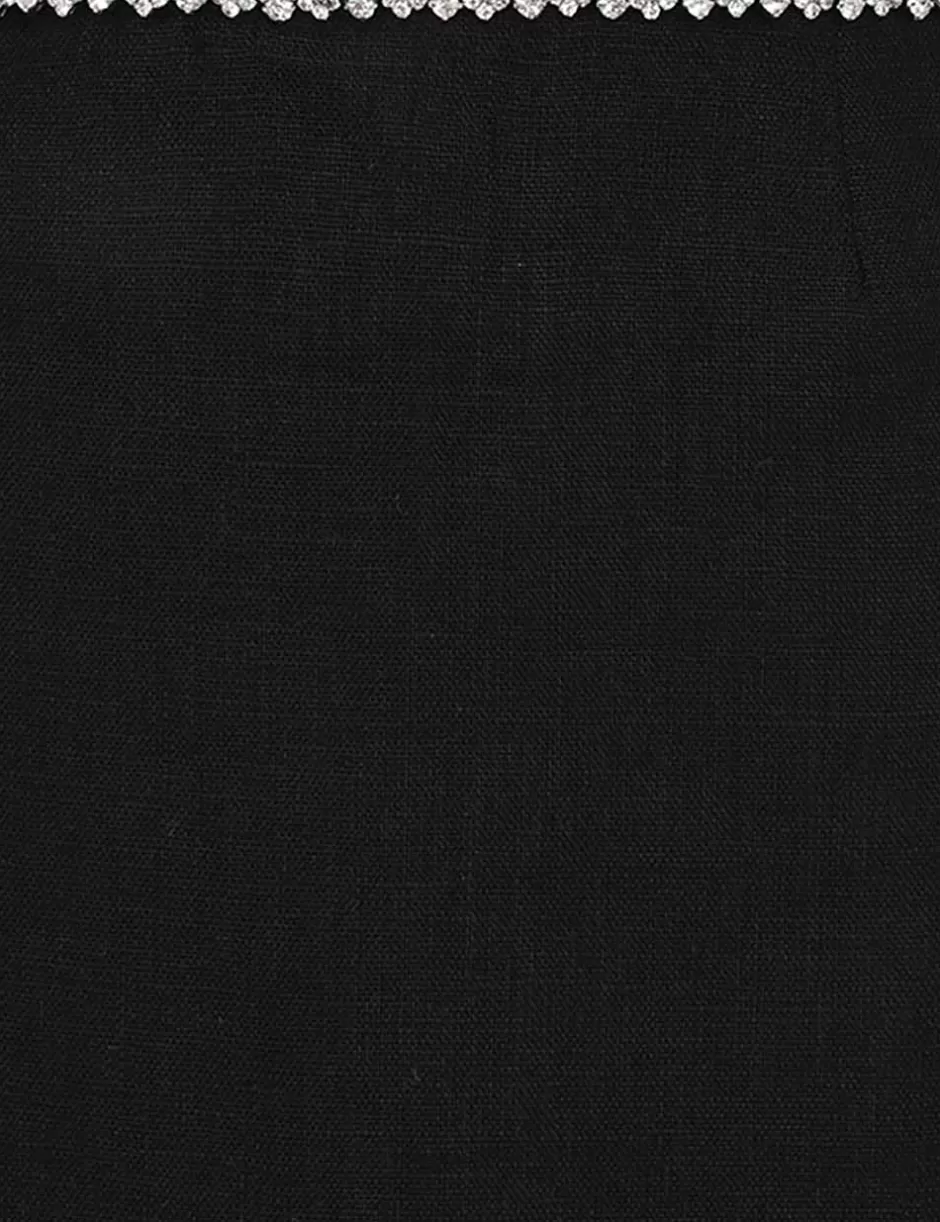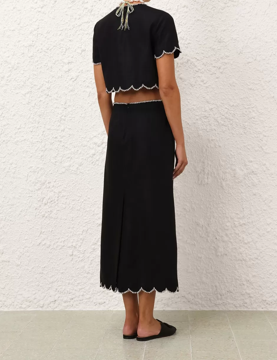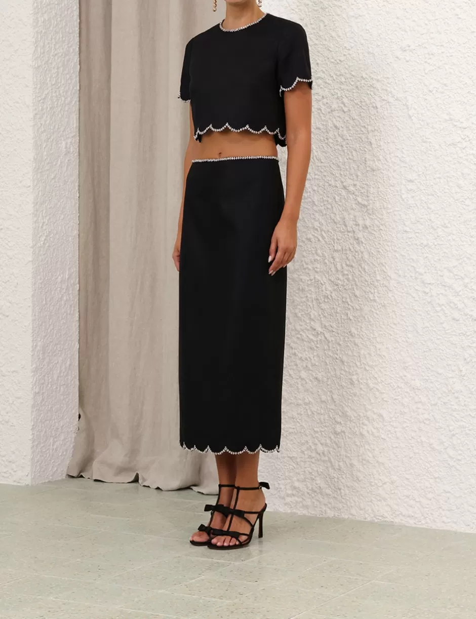 The Crush Scalloped Midi Skirt in Black from our Resort 2025 Collection, Crush. A linen midi skirt featuring centre back zip closure and crystal trims at the hemline and waist.
