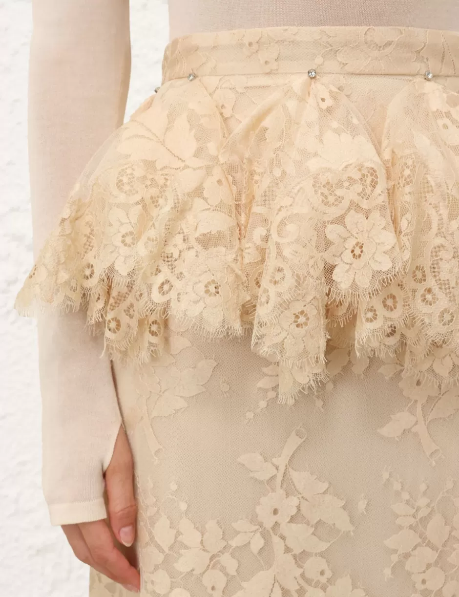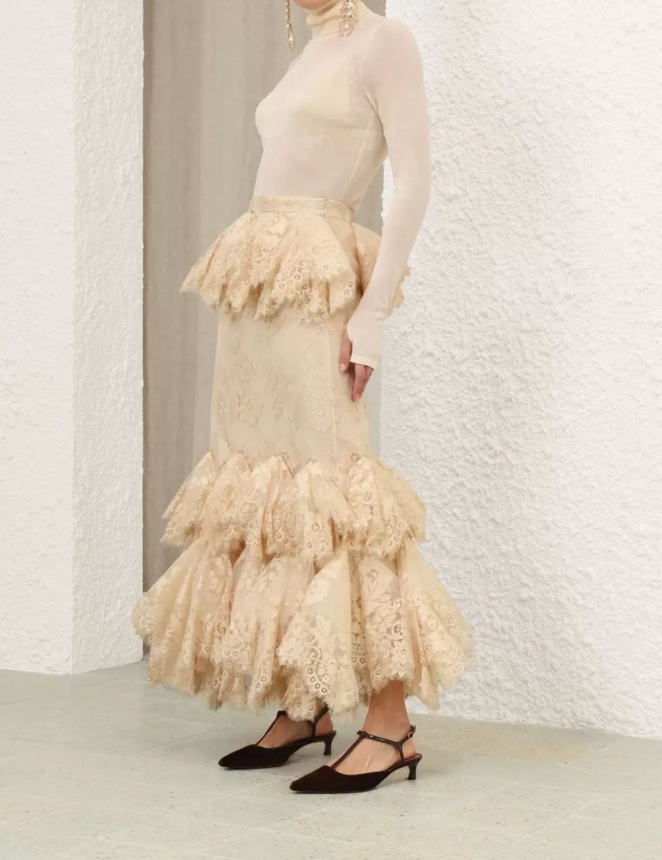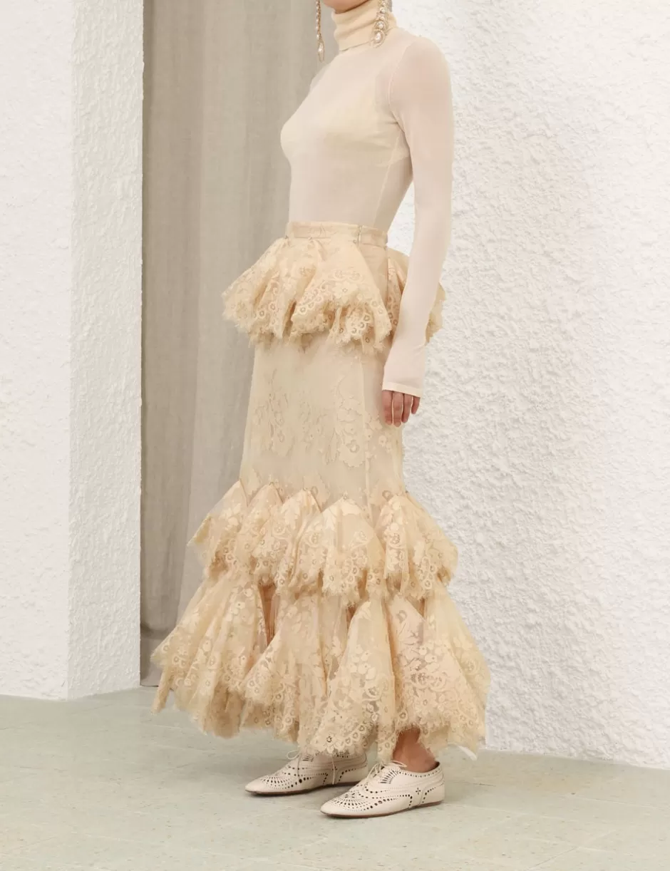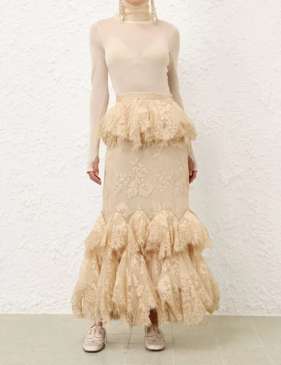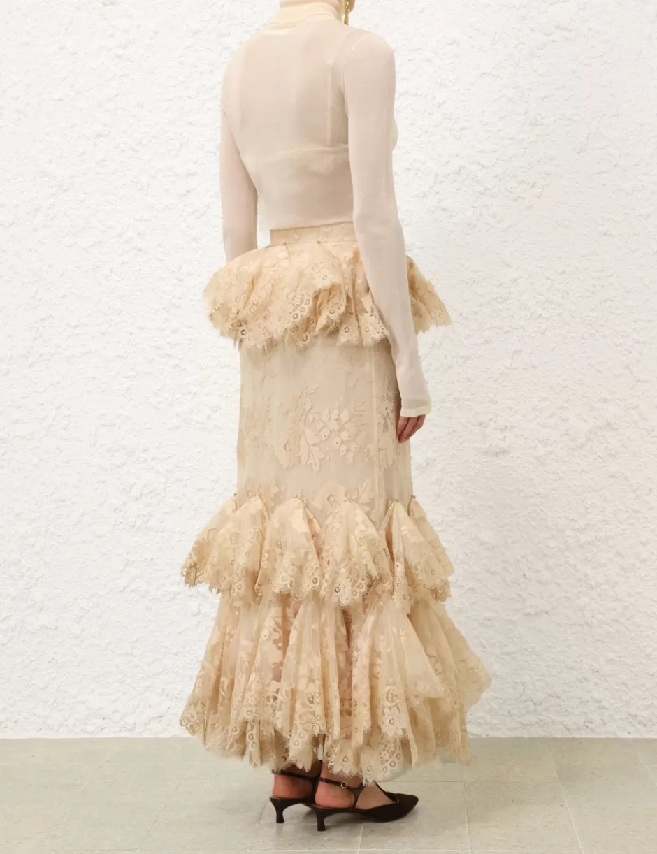 The Eden Lace Handkerchief Skirt in Light Tea from our Fall 2024 Collection, In Illustration. A full-length lace skirt featuring a fixed waistband, lace trim with crystal detail throughout and a hanky style tiers.