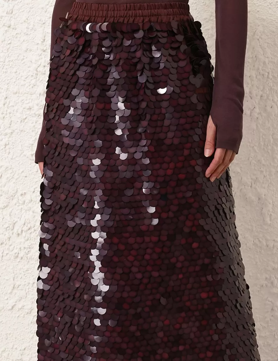 The Eden Sequin Maxi Skirt in Mahogany from our Fall 2024 Collection, In Illustration. A silk maxi skirt featuring a sequin detailing throughout and a centre back split.