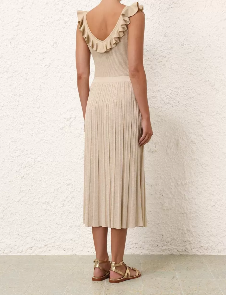 The Halliday Rib Midi Skirt in Cream Lurex from our Summer Swim 2024 Collection. A ribbed knit midi skirt featuring an elasticated waistband and soft A-line silhouette.