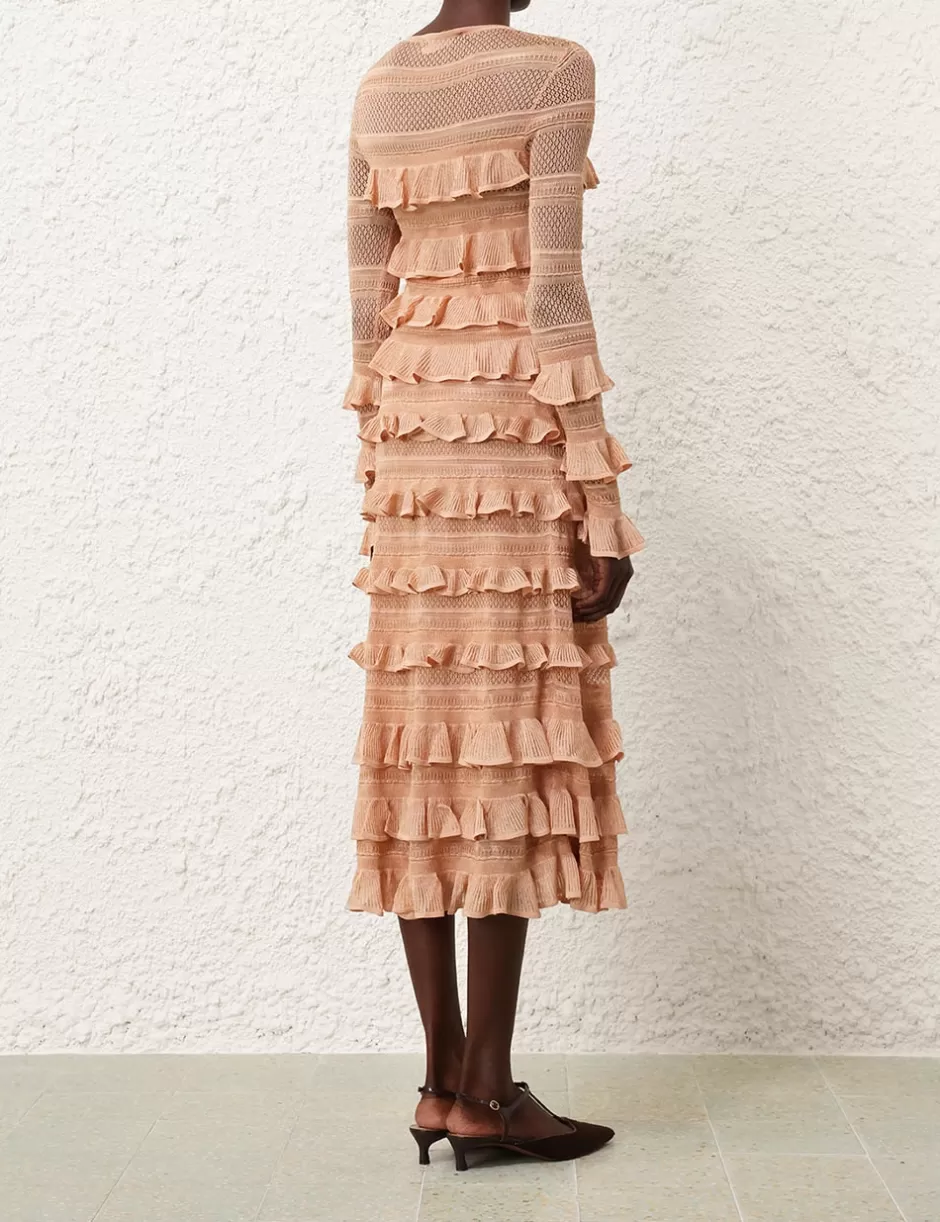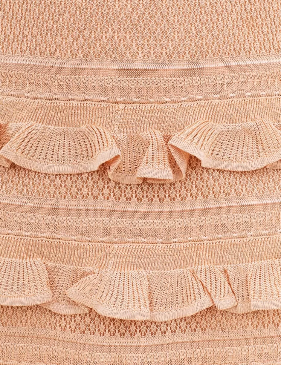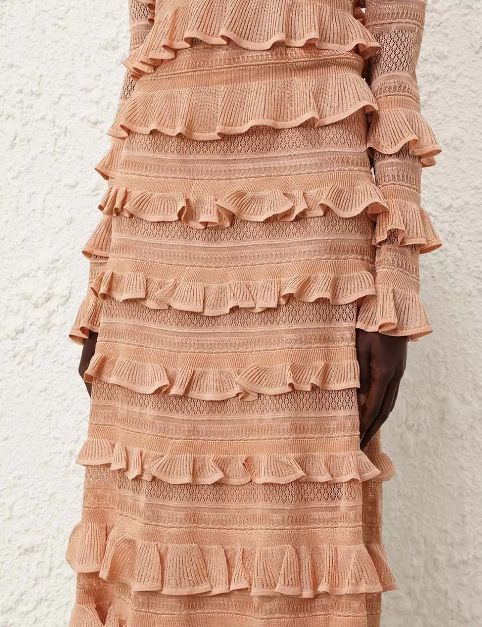 The Illustration Frilled Skirt in Champagne from our Fall 2024 Collection, In Illustration. A knit midi skirt featuring an elasticated waistband and tiered ruffle details throughout.