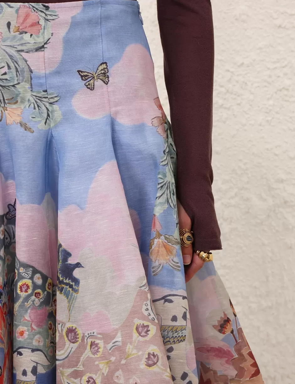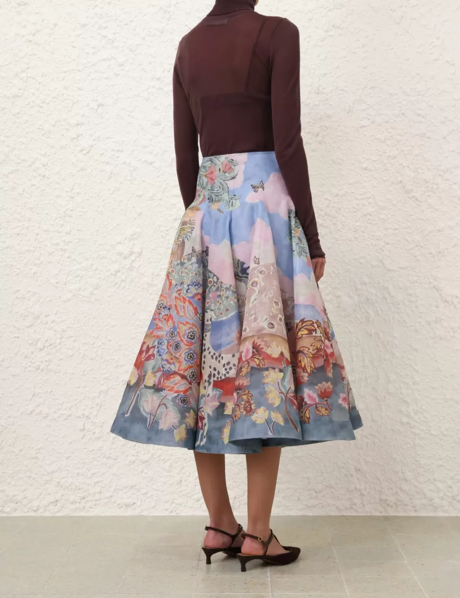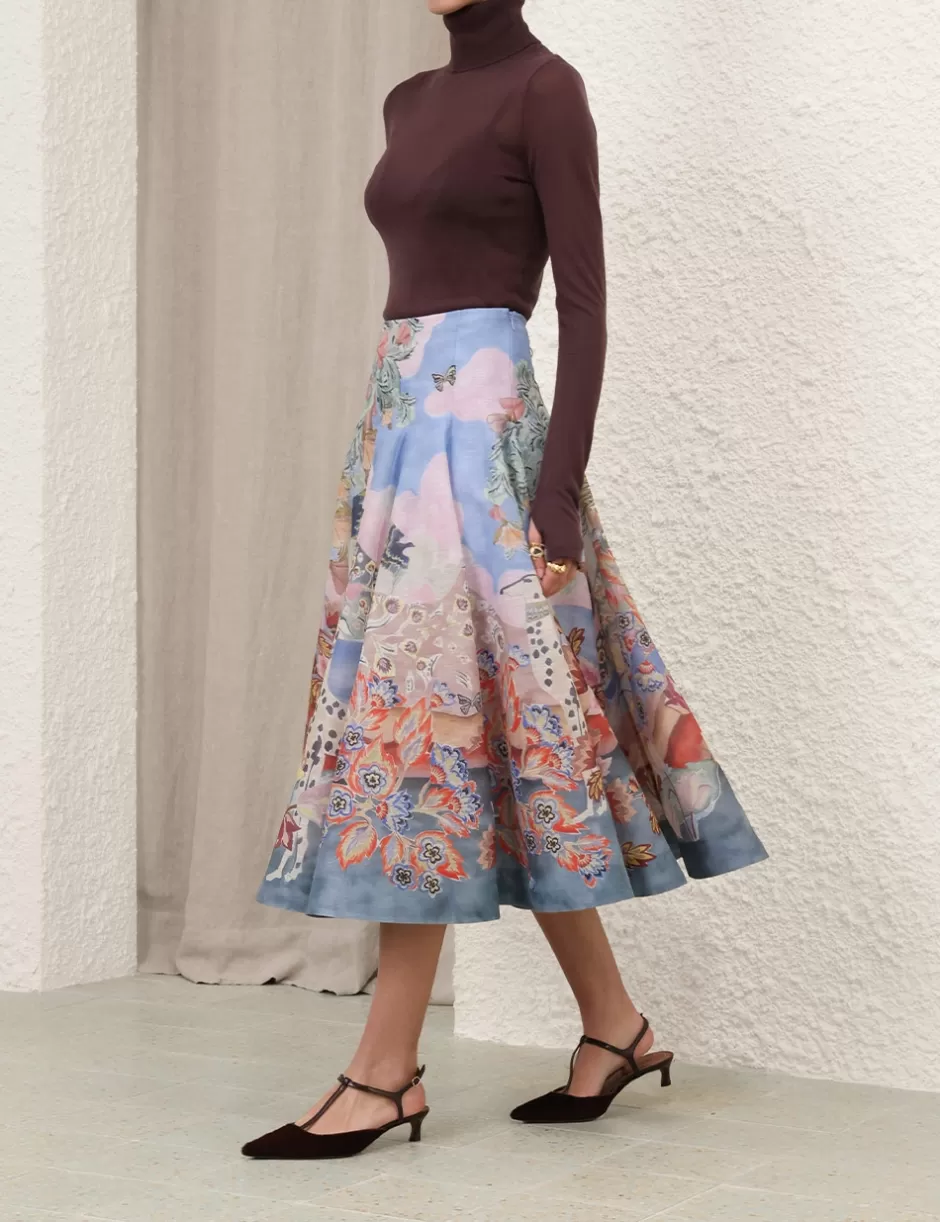The Illustration Godet Skirt in Eden Garden from our Fall 2024 Collection, In Illustration. A placement print midi skirt featuring an A-line silhouette with French seam panels throughout, and an invisible side zip.