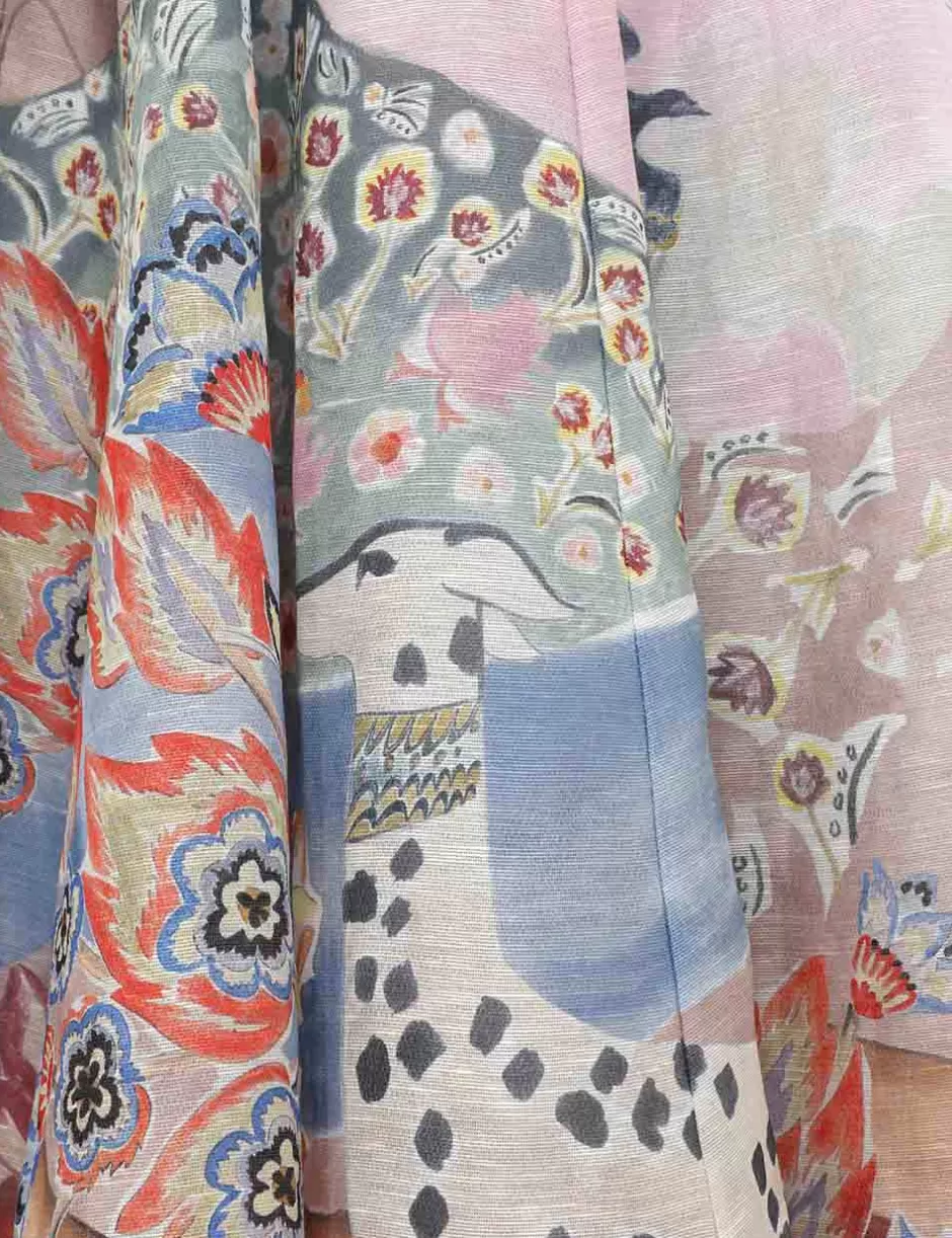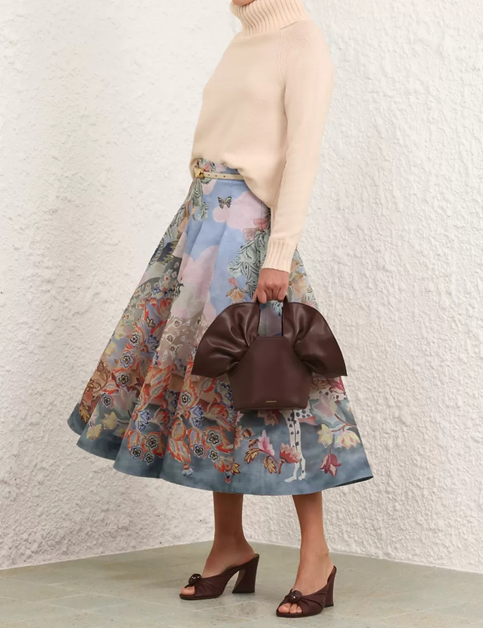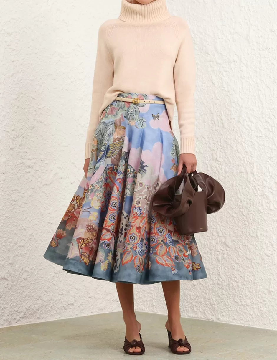 The Illustration Godet Skirt in Eden Garden from our Fall 2024 Collection, In Illustration. A placement print midi skirt featuring an A-line silhouette with French seam panels throughout, and an invisible side zip.
