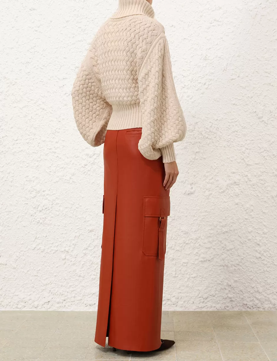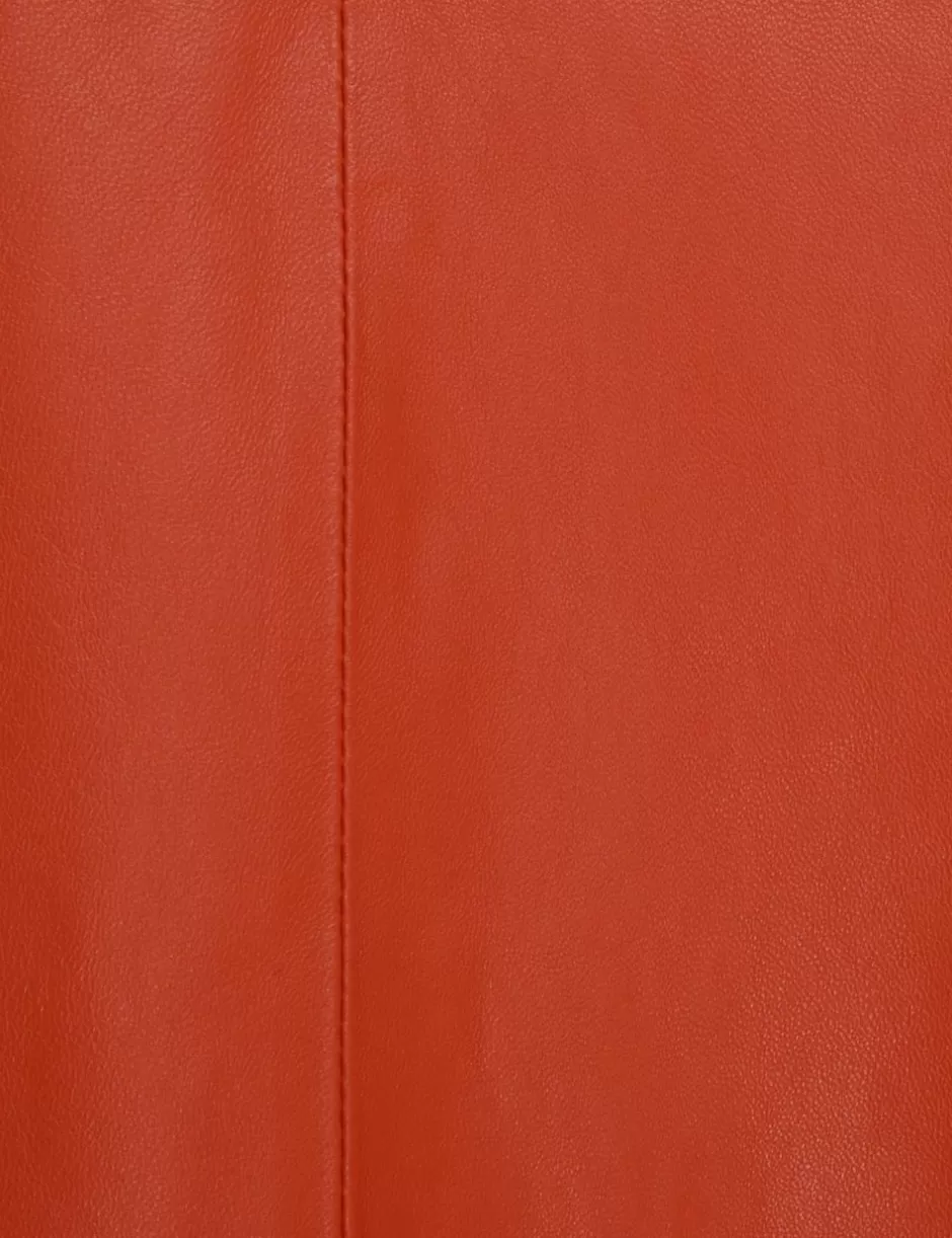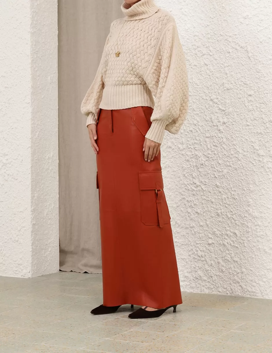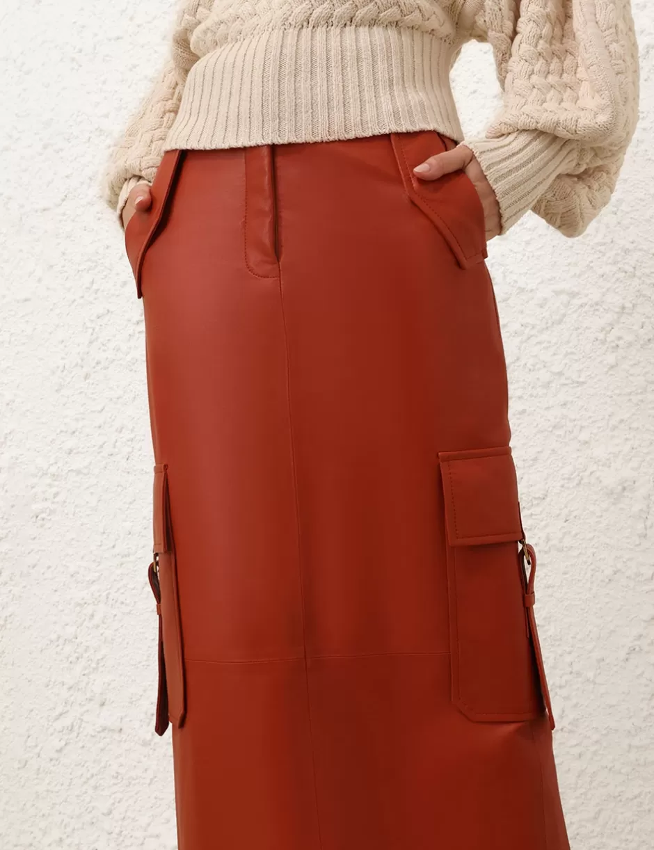 The Illustration Leather Skirt in Spice from our Fall 2024 Collection, In Illustration. A leather maxi skirt featuring pockets throughout and a centre back split.