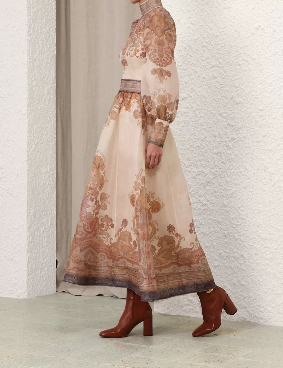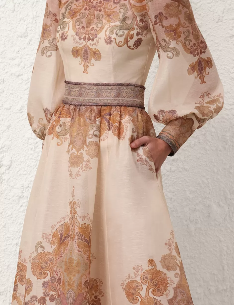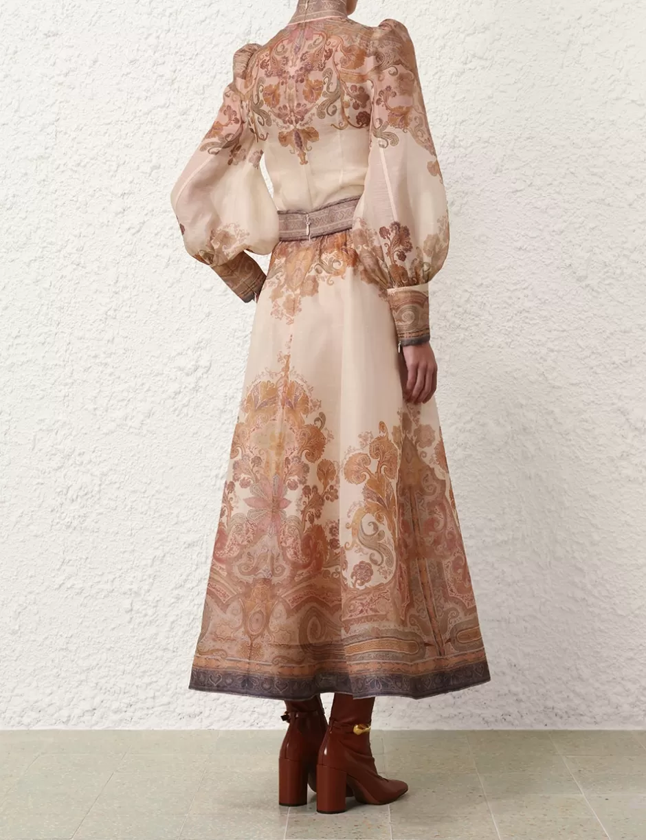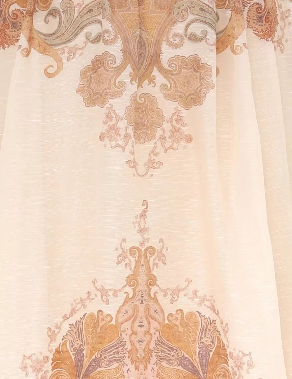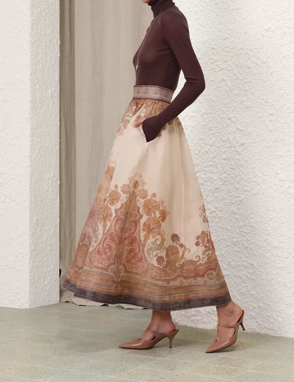The Illustration Midi Skirt in Cream Paisley from our Fall 2024 Collection, In Illustration. A silk linen organza midi skirt featuring a full skirt silhouette and centre back zip closure.