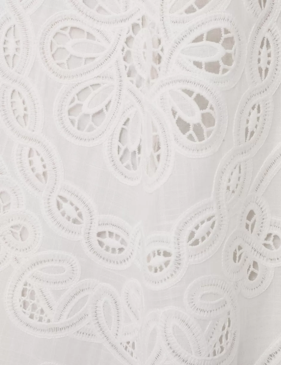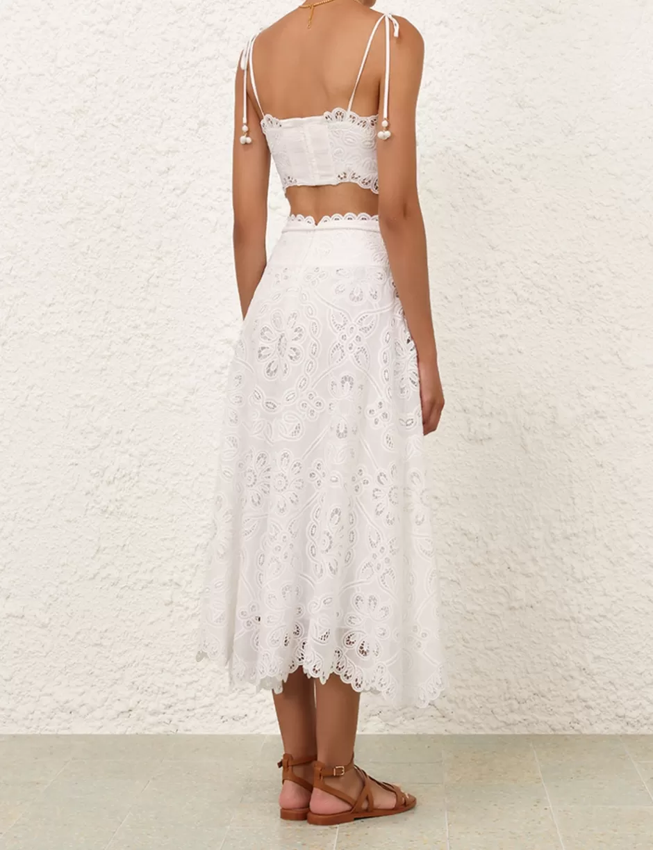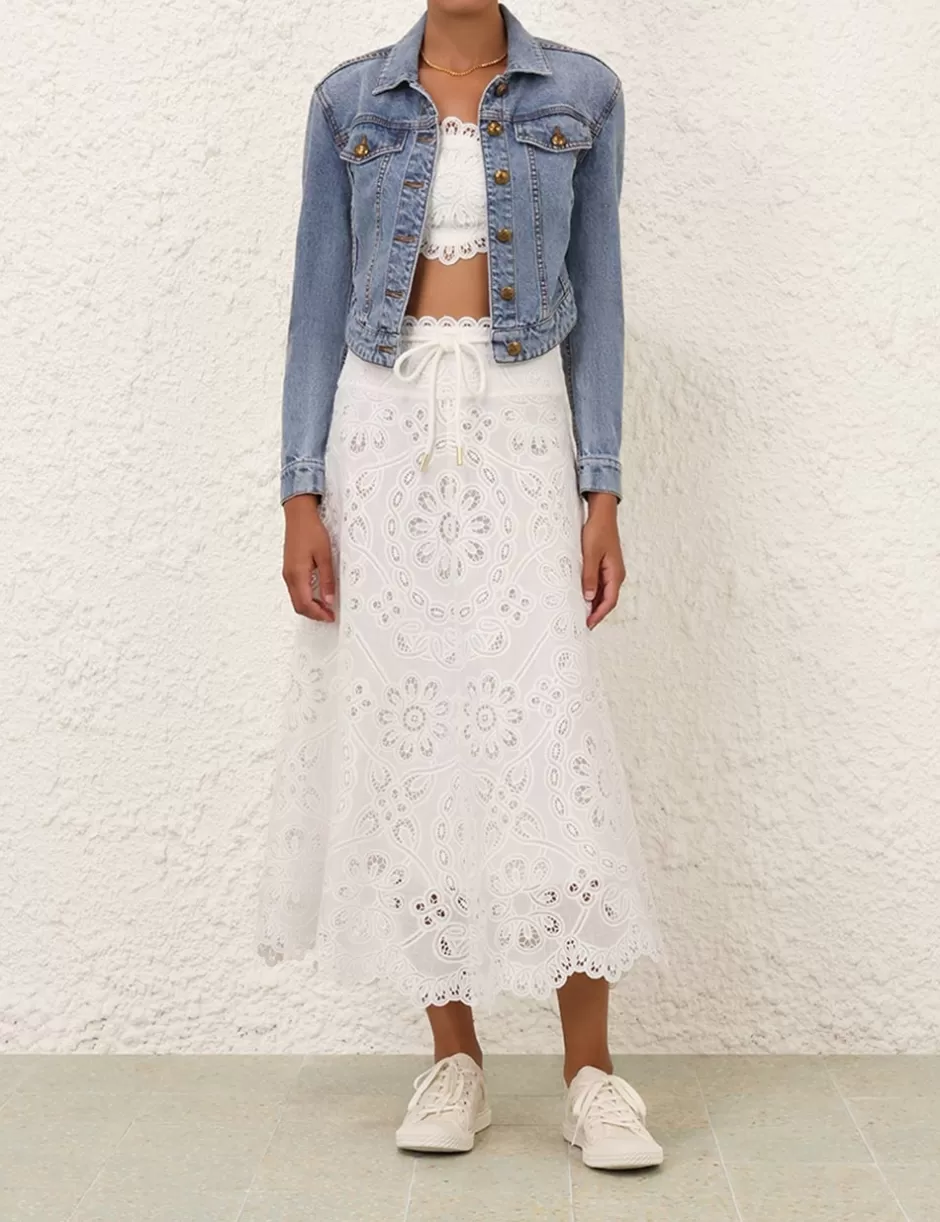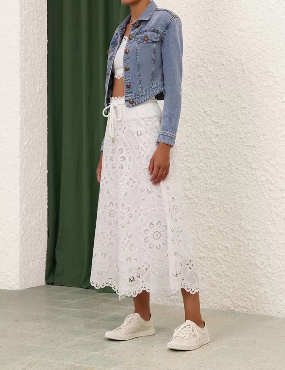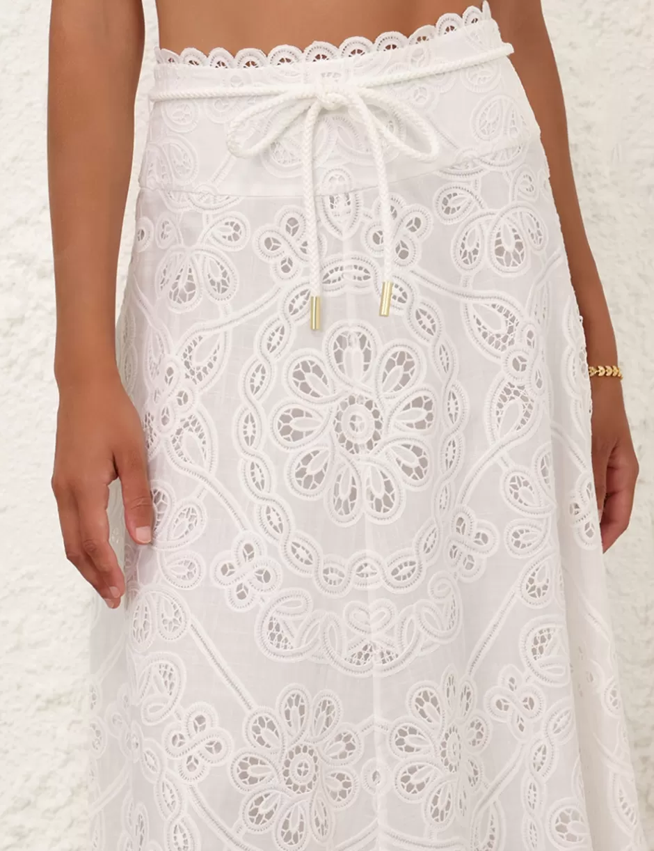 The Ottie Flared Skirt in Ivory from our Summer Swim 2024 Collection. Cotton midi skirt featuring a scalloped hem and a removable belt.