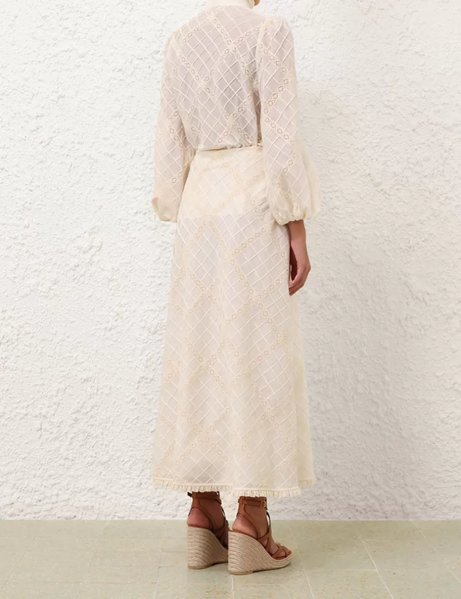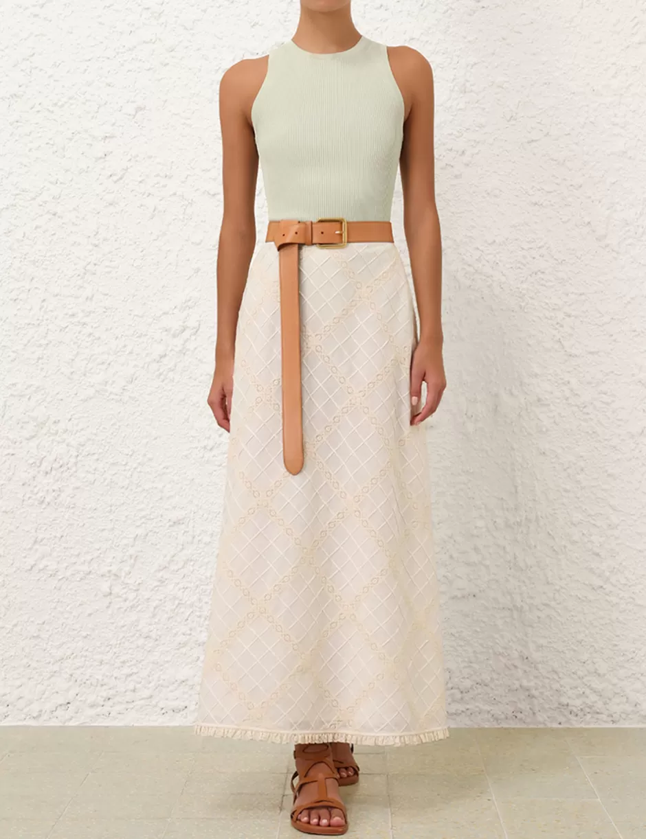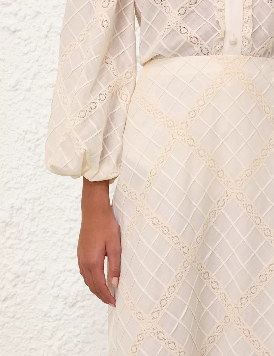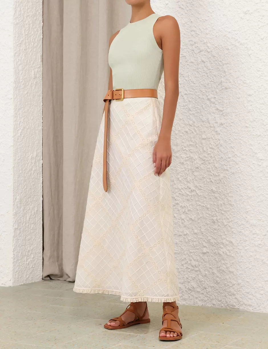 The Tallow Lace Trim Bias Skirt in Tea from our Resort Swim 2025 Collection. A lace midi skirt featuring fixed waist, lace trim throughout and a side seam zip closure.