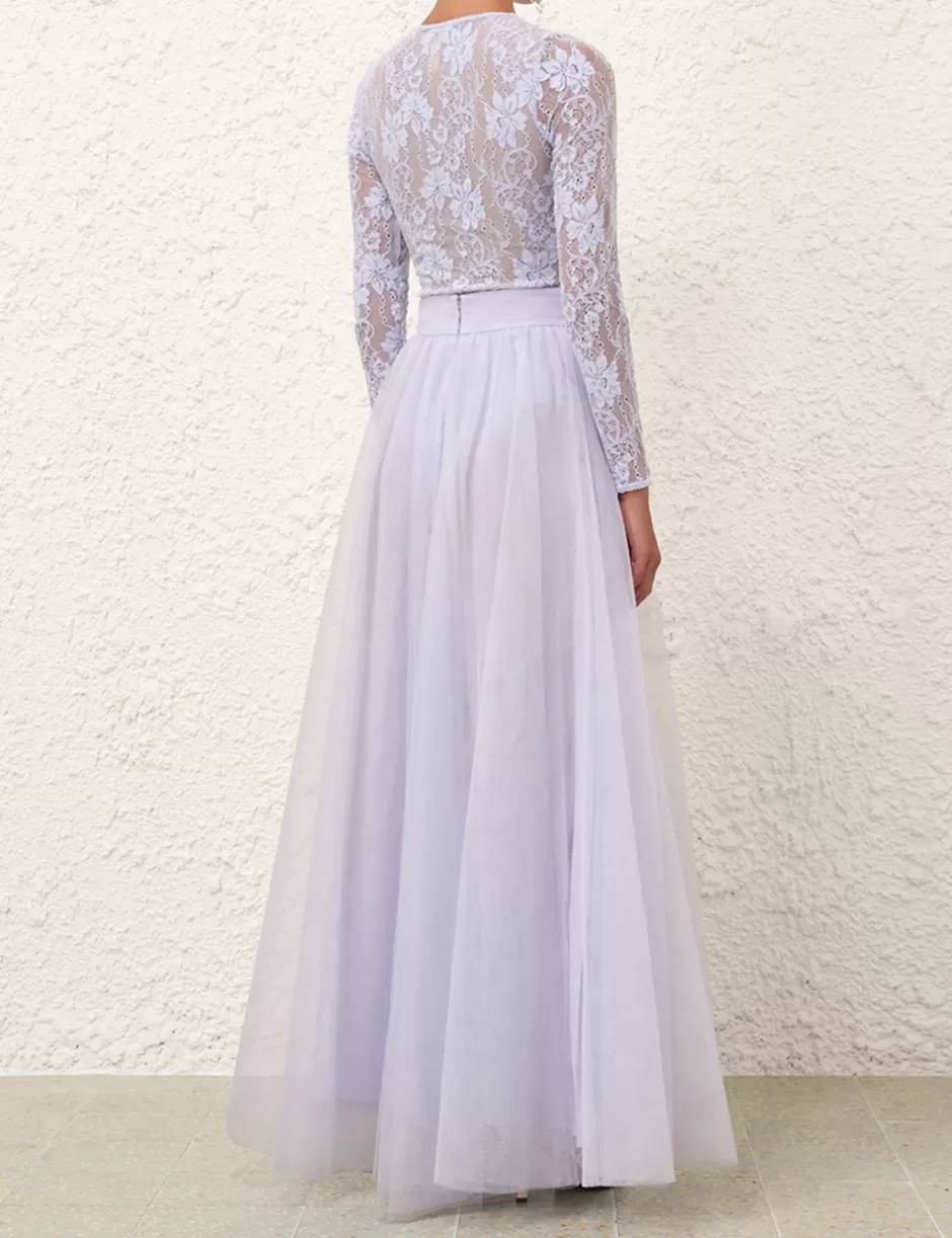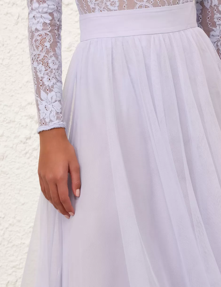 The Tulle Midi Skirt in Light Blue from our Resort 2025 Collection, Crush. A midi skirt featuring gathered flocked tulle and fitted waistband.