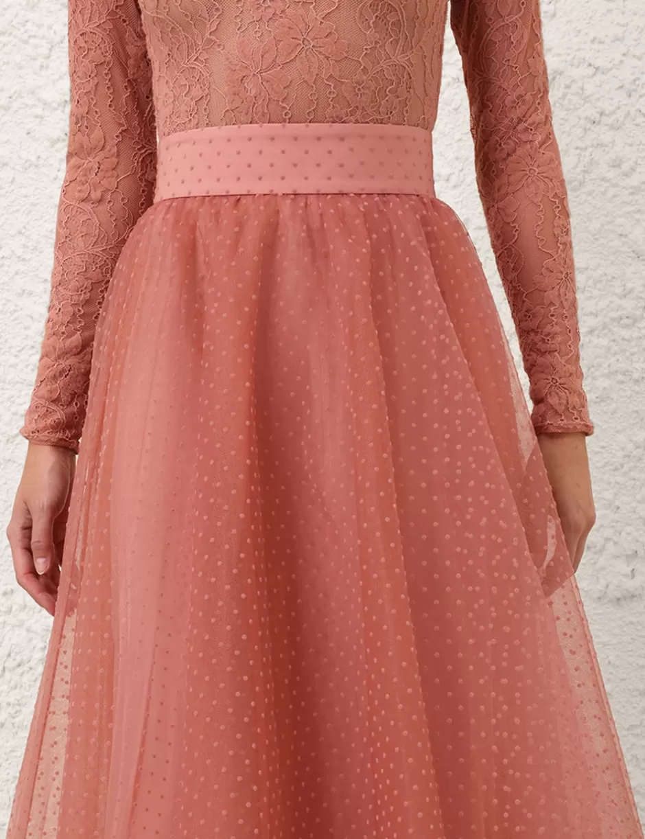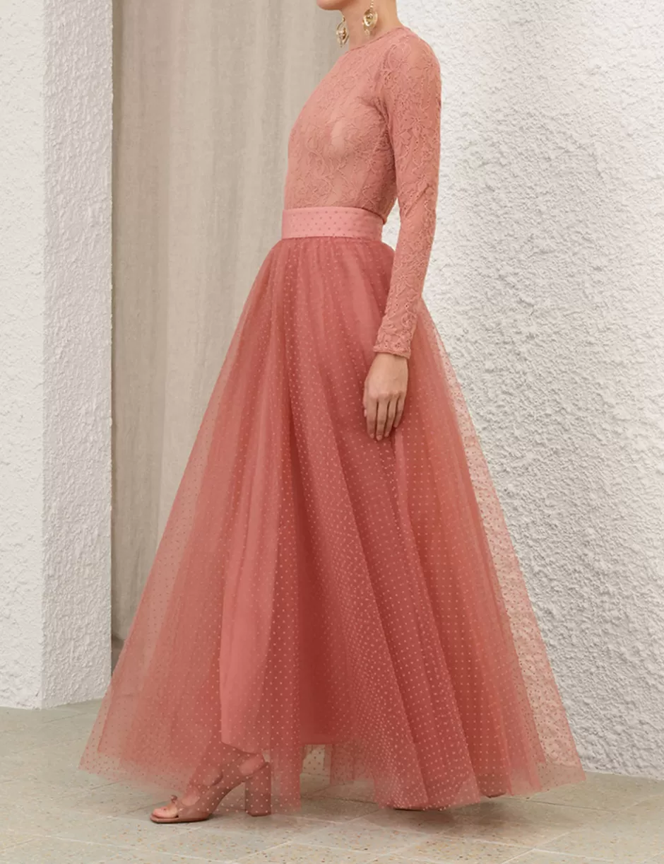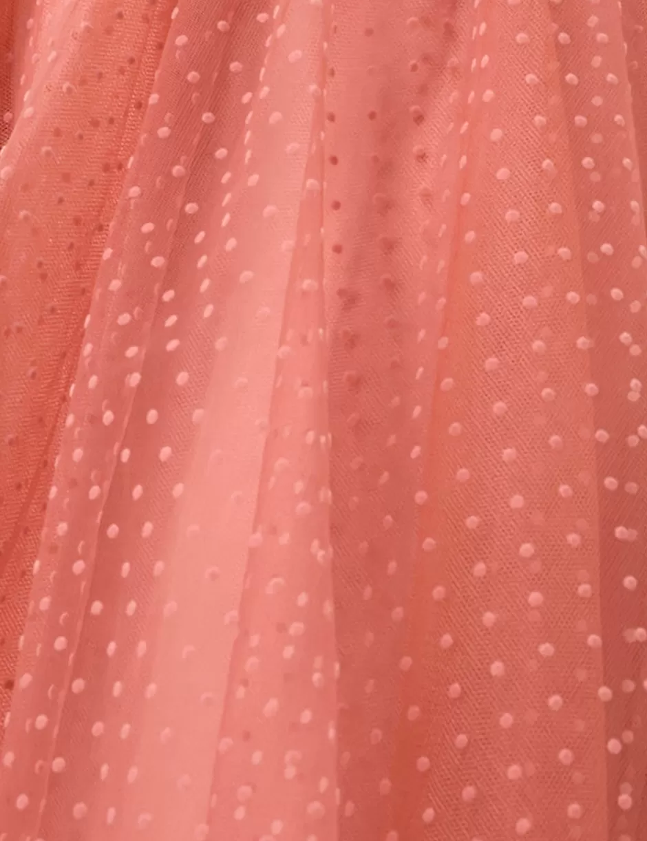 The Tulle Skirt in Blush from our Fall 2024 Collection, In Illustration. A midi skirt featuring flocked tulle and raw hem.