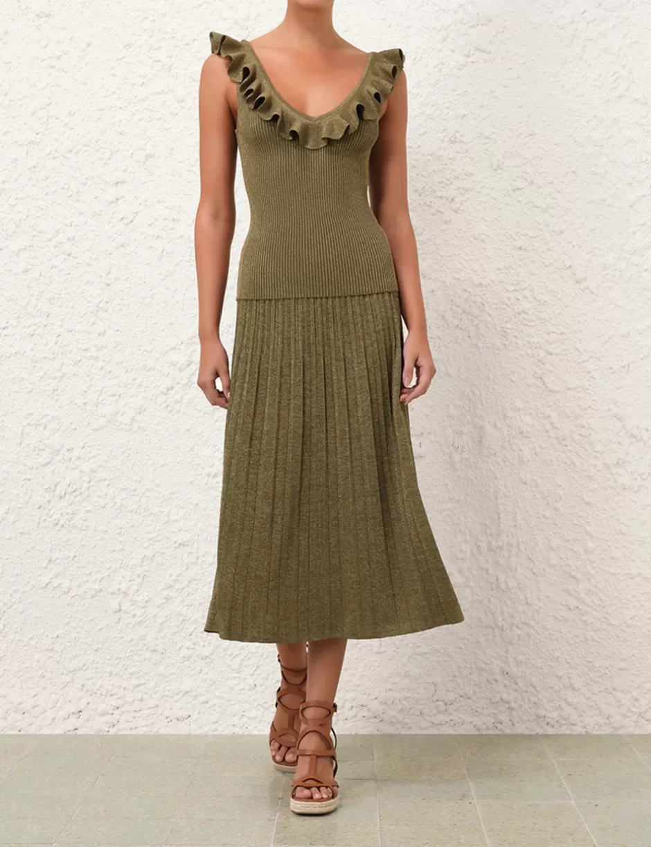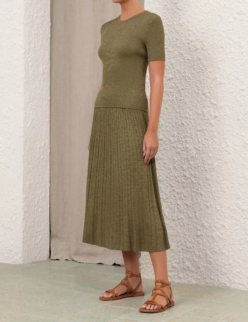 The Wylie Rib Midi Skirt in Dusty Olive/Gold from our Resort Swim 2025 Collection. A ribbed knit midi skirt featuring an elasticated waistband and soft A-line silhouette.