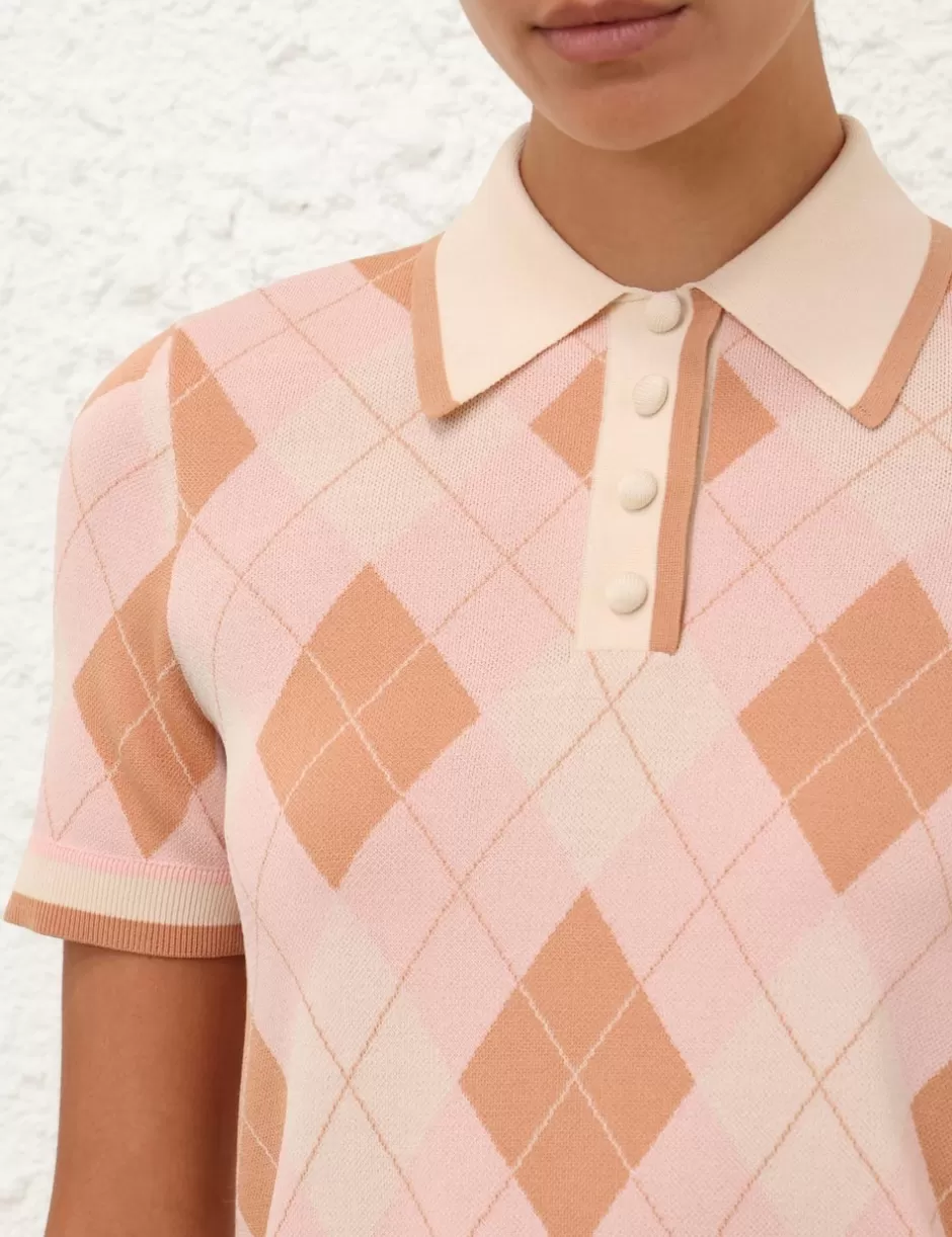 The Acacia Argyle Knit Polo in Pink Argyle from our Resort Swim 2025 Collection. A polo top featuring a classic collar and buttons down the top front opening.