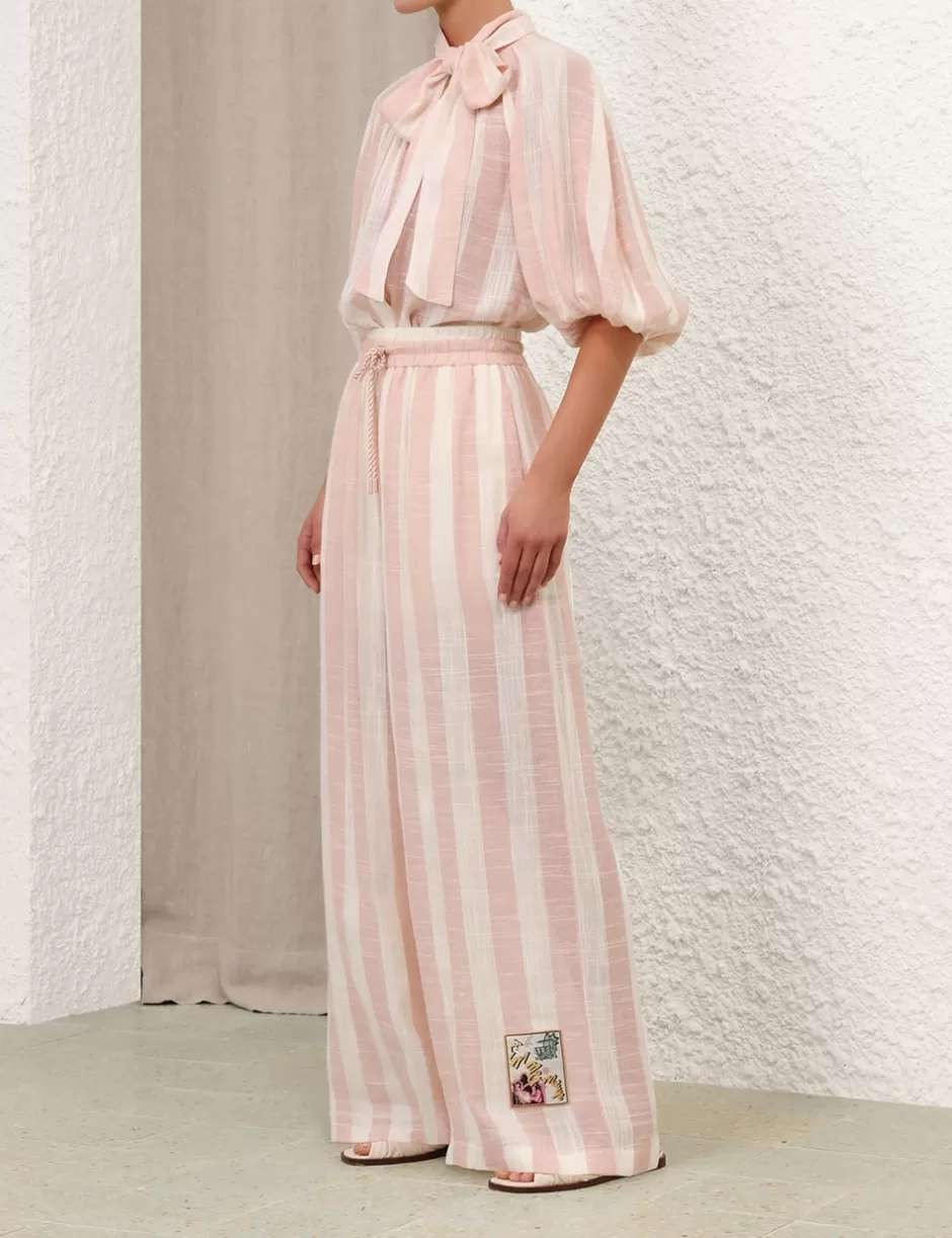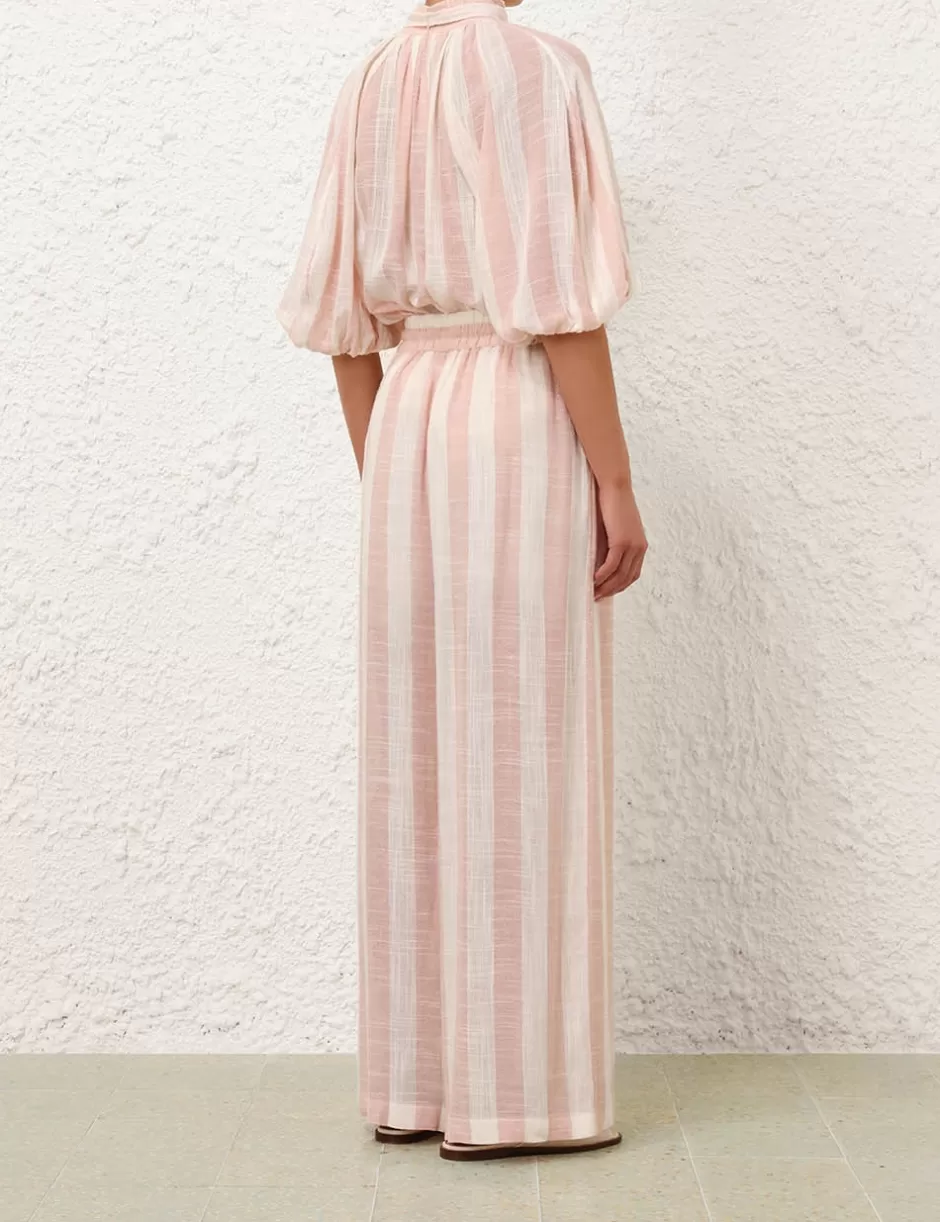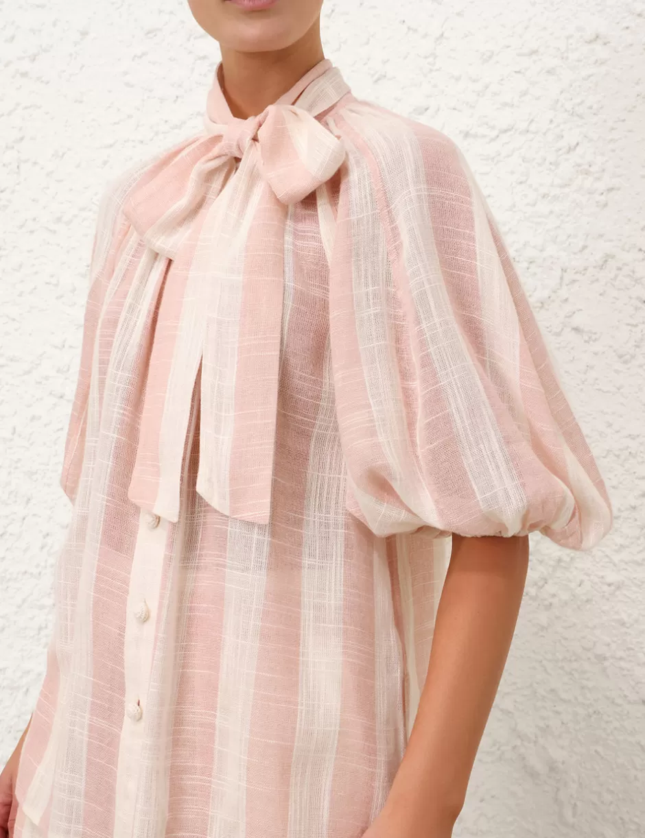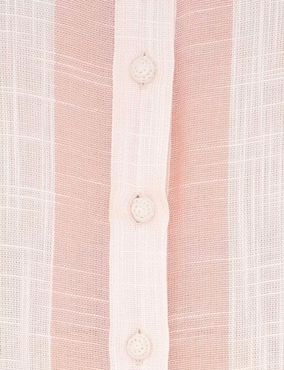 The Acacia Blouson Shirt in Pink/Cream Stripe from our Resort Swim 2025 Collection. A short sleeve blouse featuring a self tie neckline, finished with rouleau loops and crochet buttons down the centre front.
