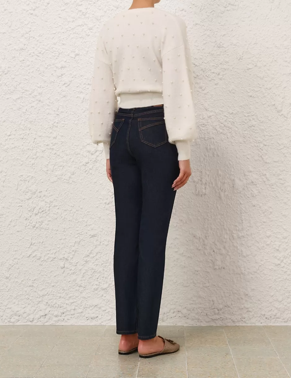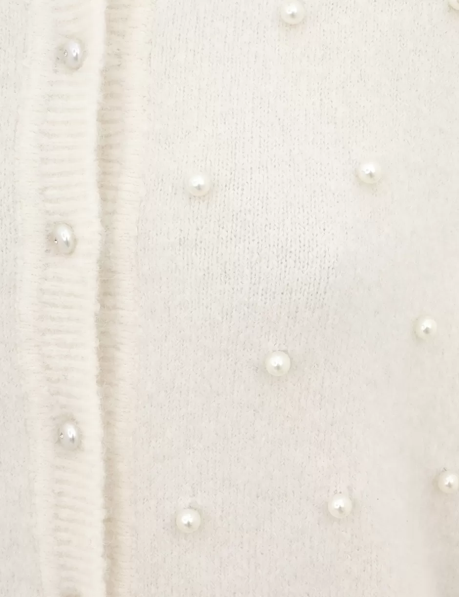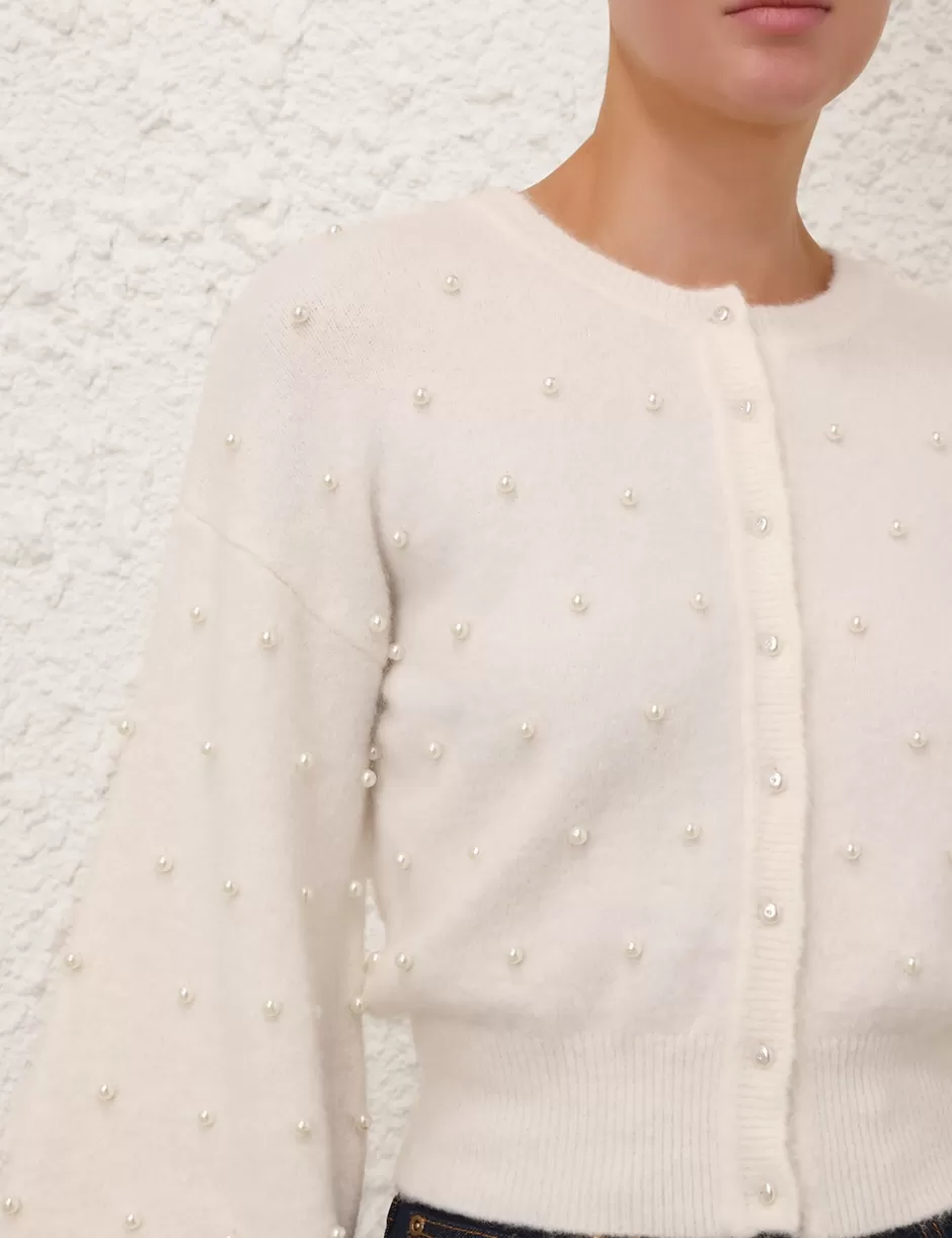 The Crush Beaded Cardigan in Ivory/Pearl from our Resort 2025 Collection, Crush. A wool cardigan featuring long blouson sleeves with ribbed cuffs, buttons down the centre front and pearl detailing throughout.