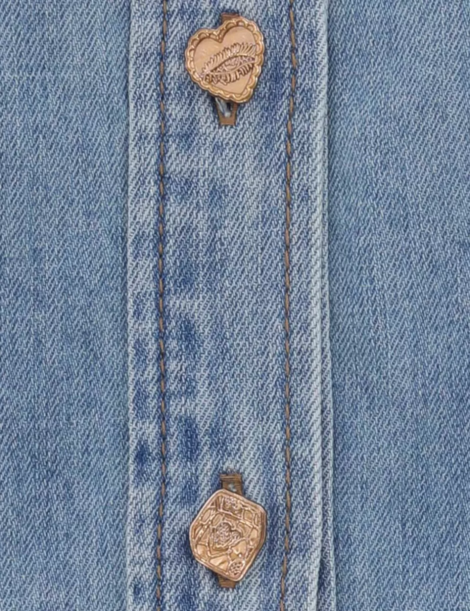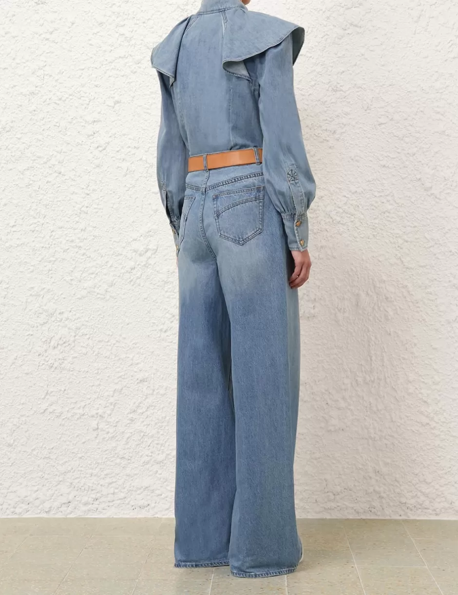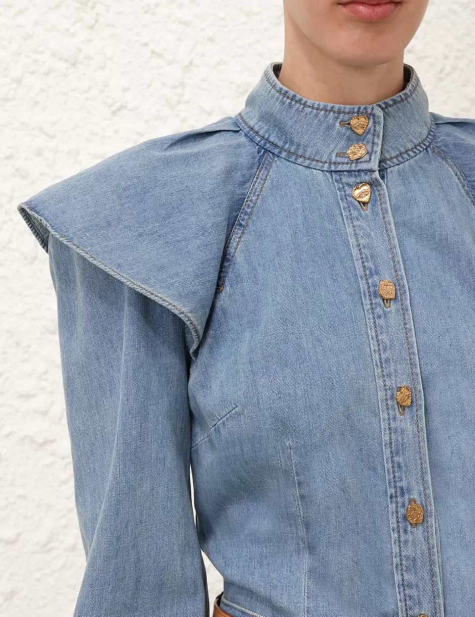 The Crush Denim Blouse in Blue Moon from our Resort 2025 Collection, Crush. A denim blouse featuring a stand collar, buttons down the centre front and long blouson sleeves with elongated cuffs.