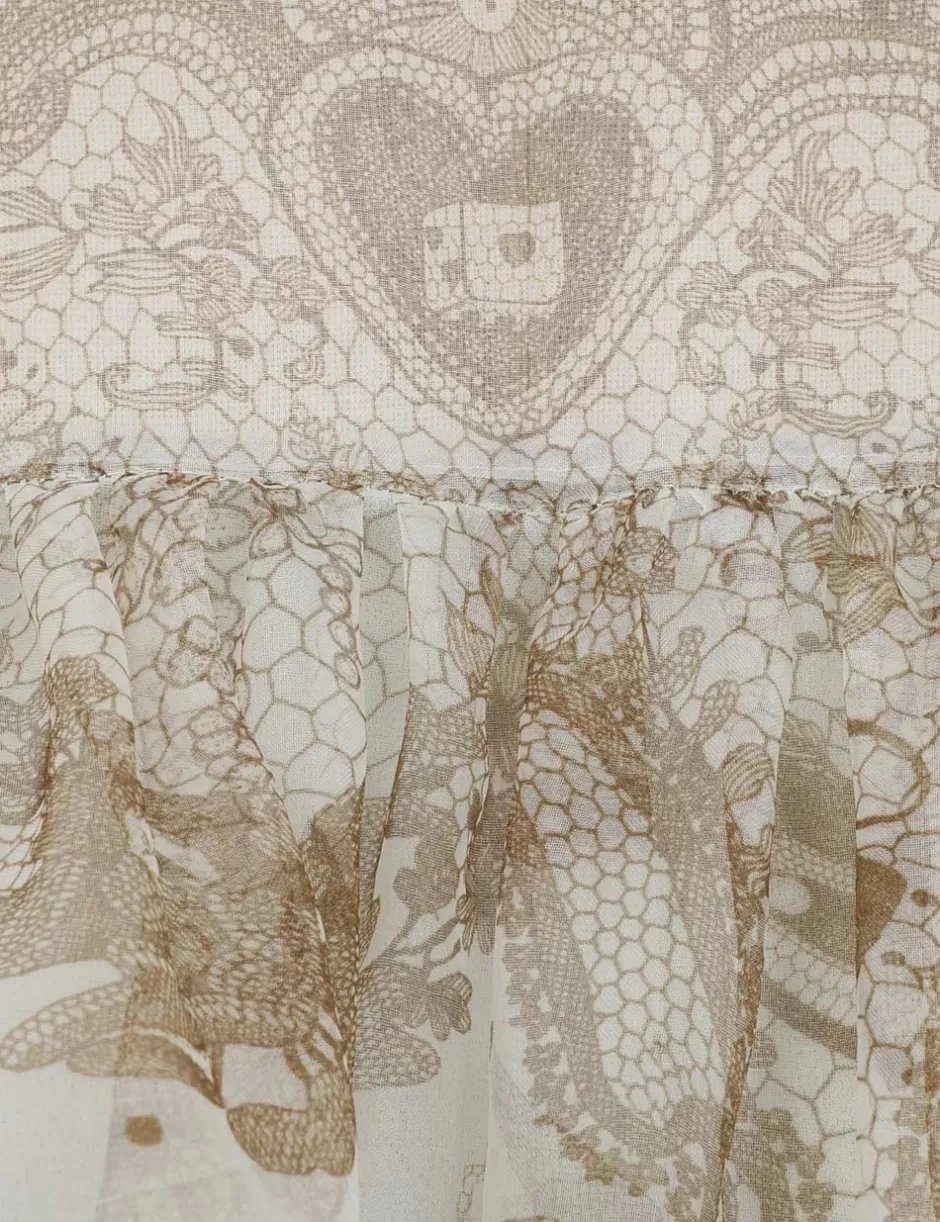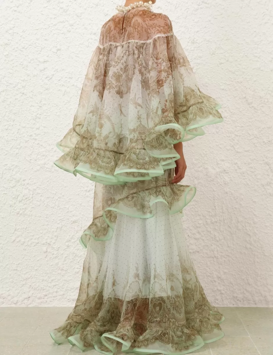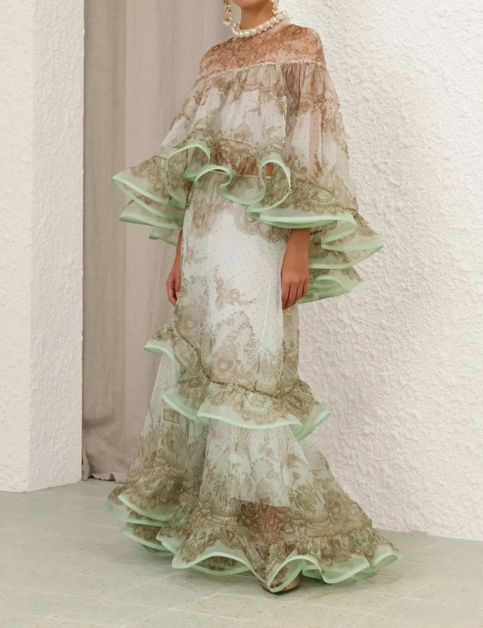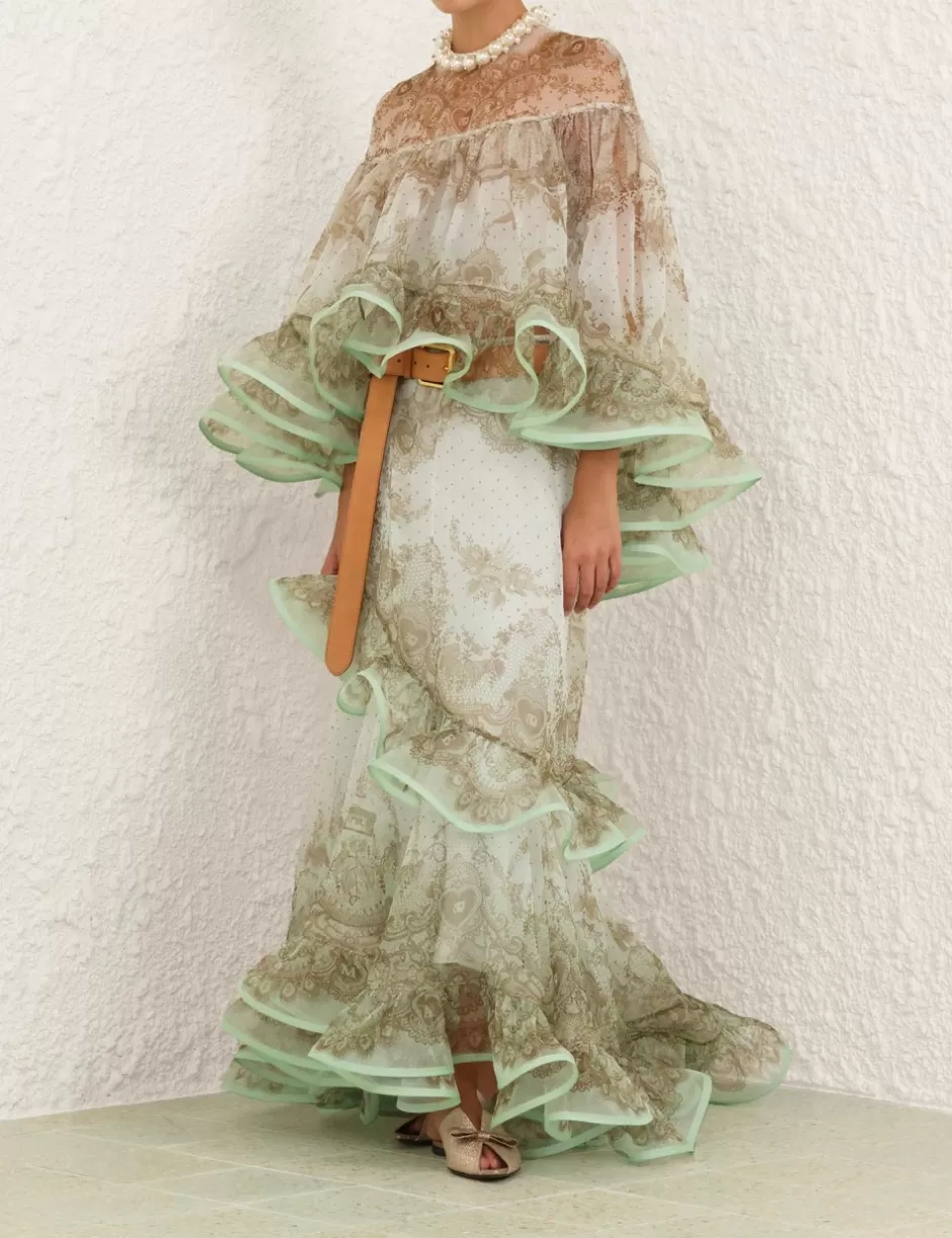 The Crush Embellished Blouse in Mint Lace Print from our Resort 2025 Collection, Crush. A silk organza long sleeve blouse featuring pearl and crystal detailing at the neckline, a placement print and heavy frill detailing throughout; finished with a contrast hemline of frills.