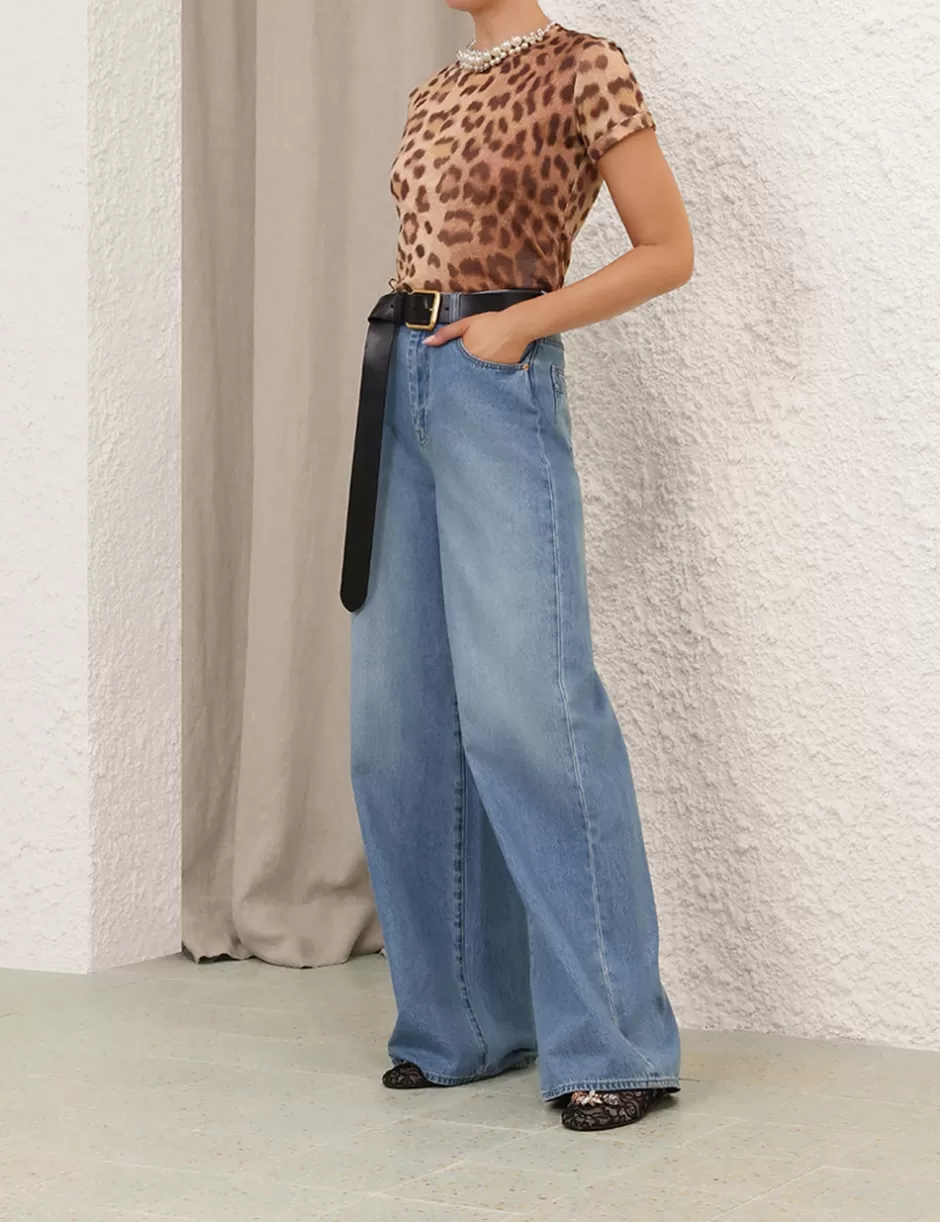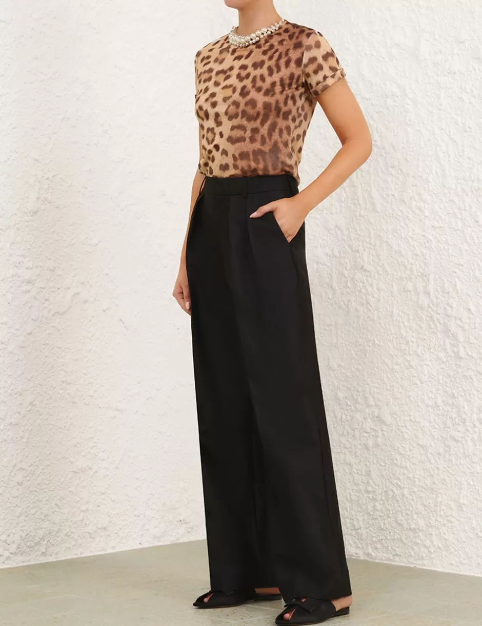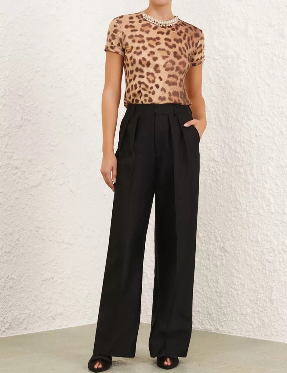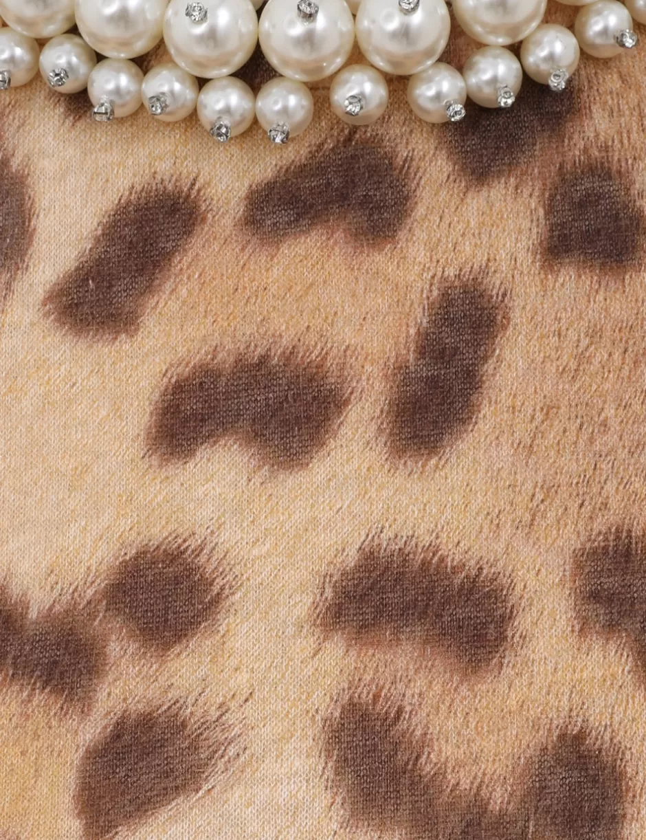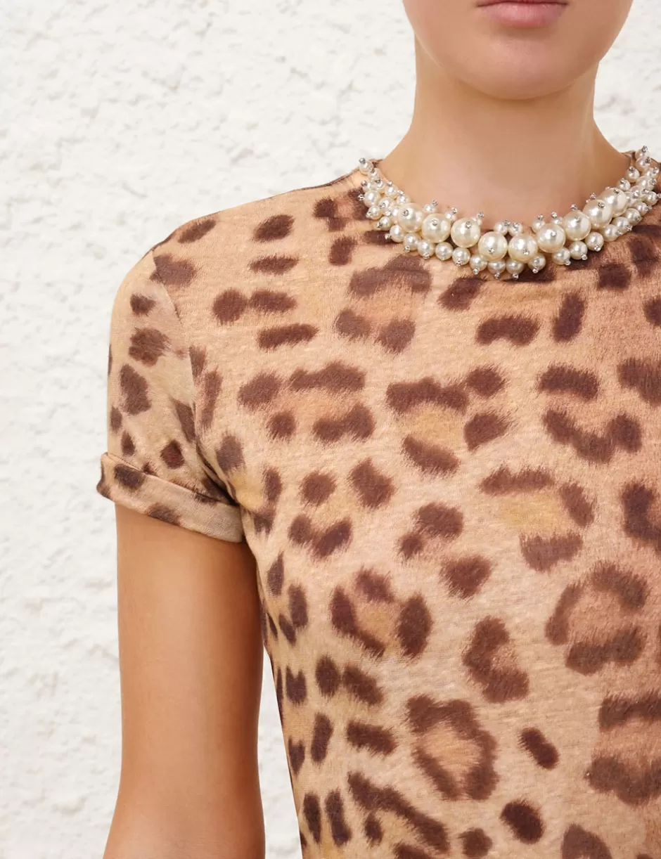 The Crush Embellished Tee in Dark Leopard from our Resort 2025 Collection, Crush. A linen tee featuring short sleeves and a crew neckline with pearl and crystal trim.