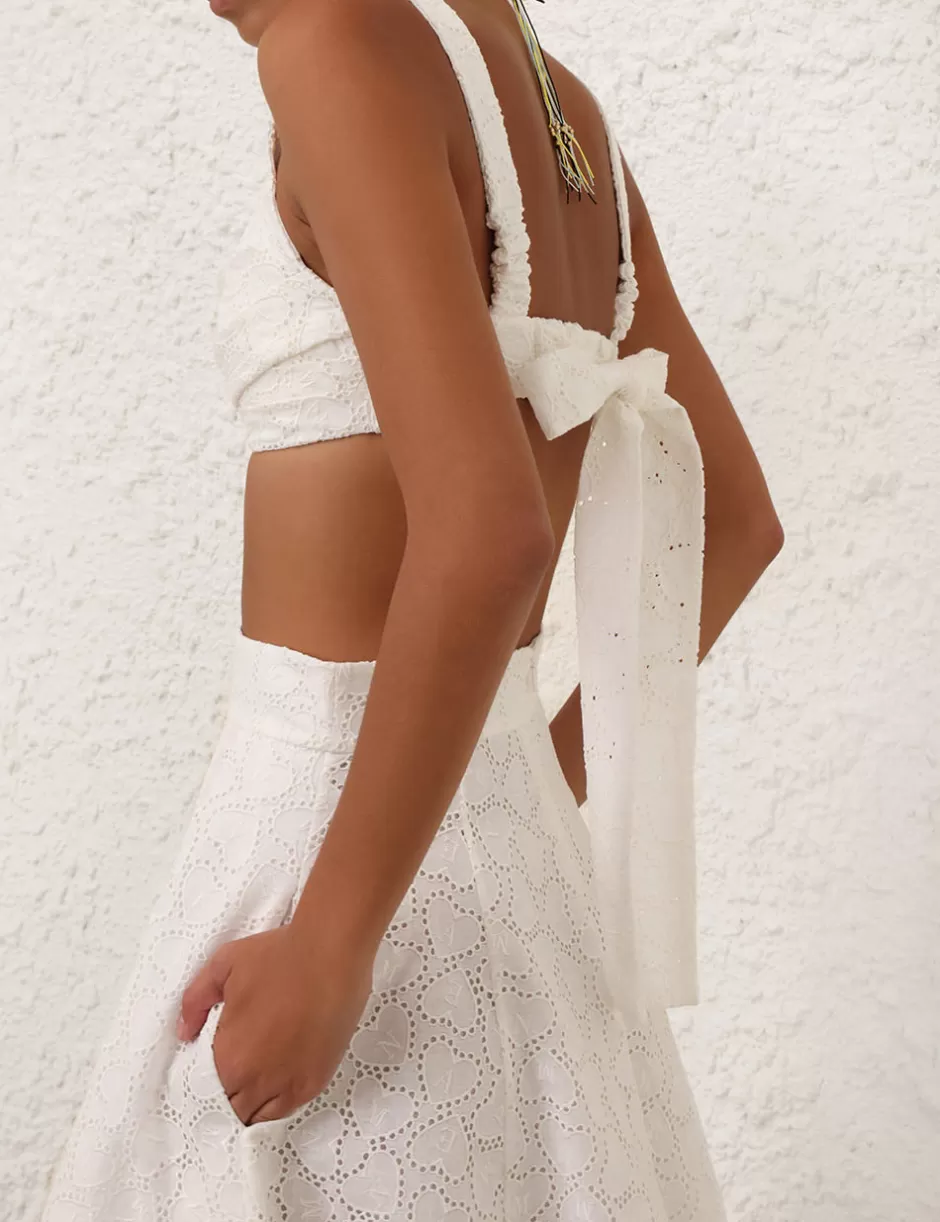 The Crush Embroidered Bralette in Ivory from our Resort 2025 Collection, Crush. A linen bralette with a twisted sweetheart neckline; finished with a self tie bow with a hook and eye closure at centre back.