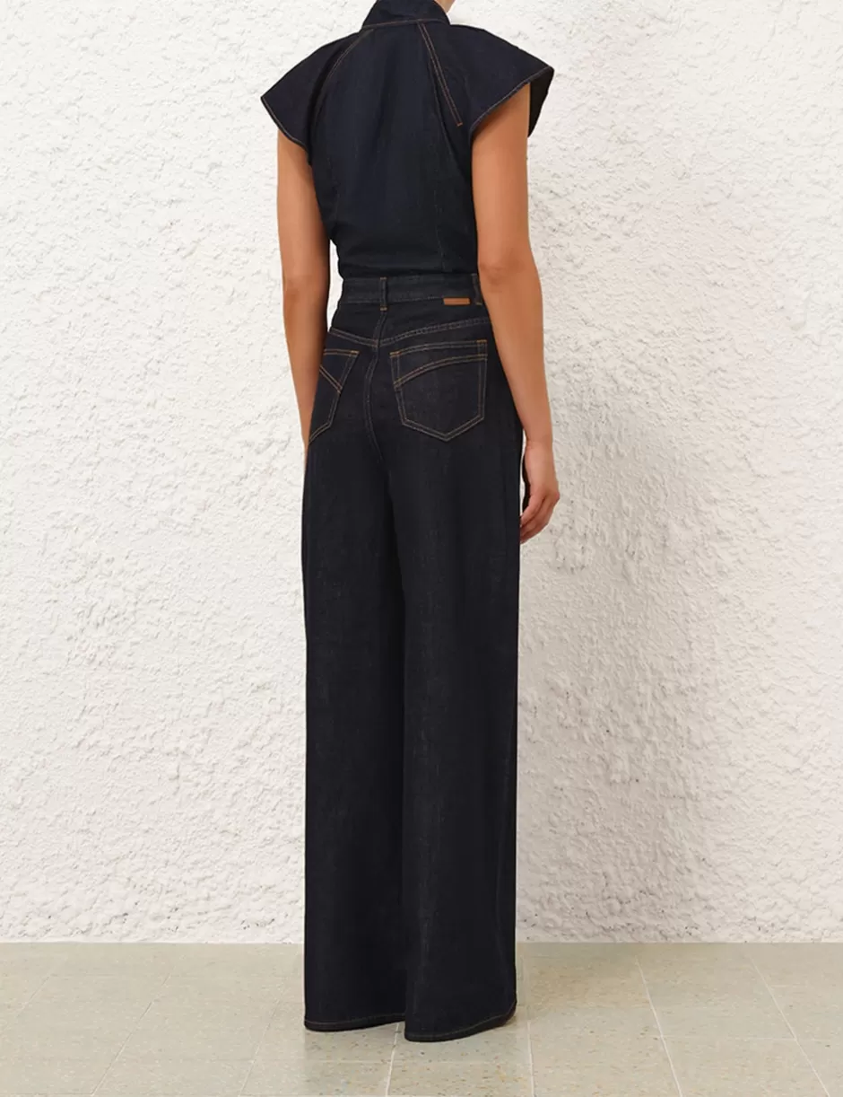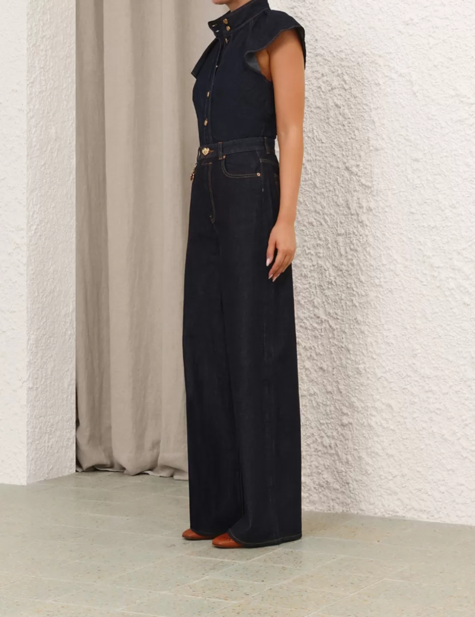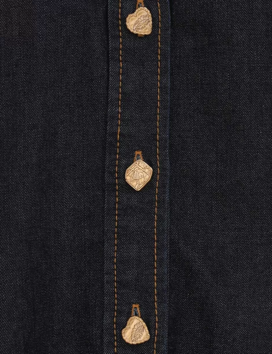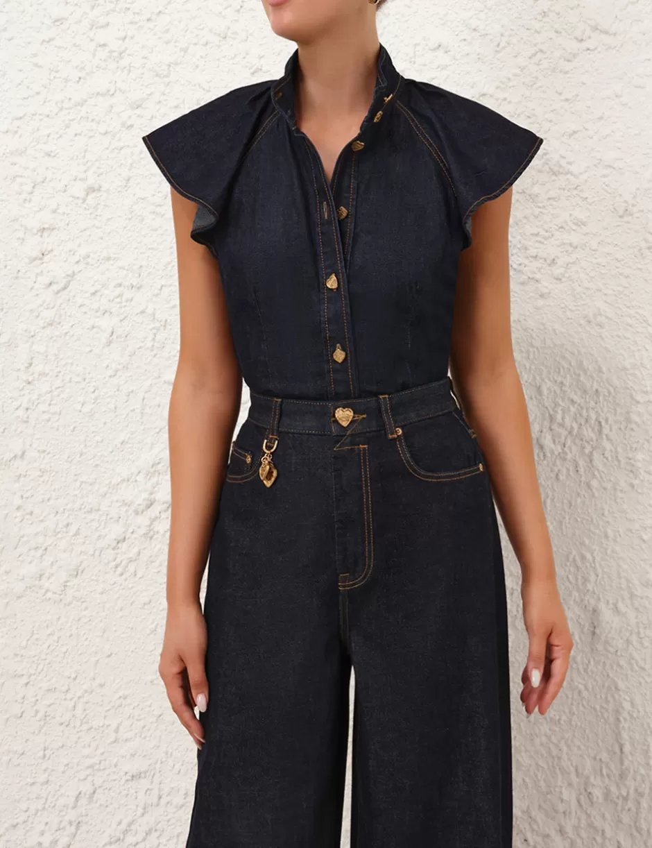 The Crush Flutter Sleeve Shirt in Night Sky from our Resort 2025 Collection, Crush. A denim shirt featuring a stand collar, buttons down the centre front and flutter ruffle sleeves.