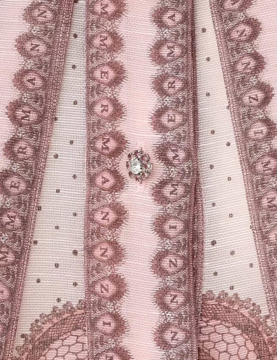 The Crush Frilled Fitted Blouse in Pink Lace Print from our Resort 2025 Collection, Crush. A silk linen organza blouse featuring short sleeves with double layered frills, a stand collar with a neck tie featuring velvet bow detailing; finished with crystal buttons down the centre front.
