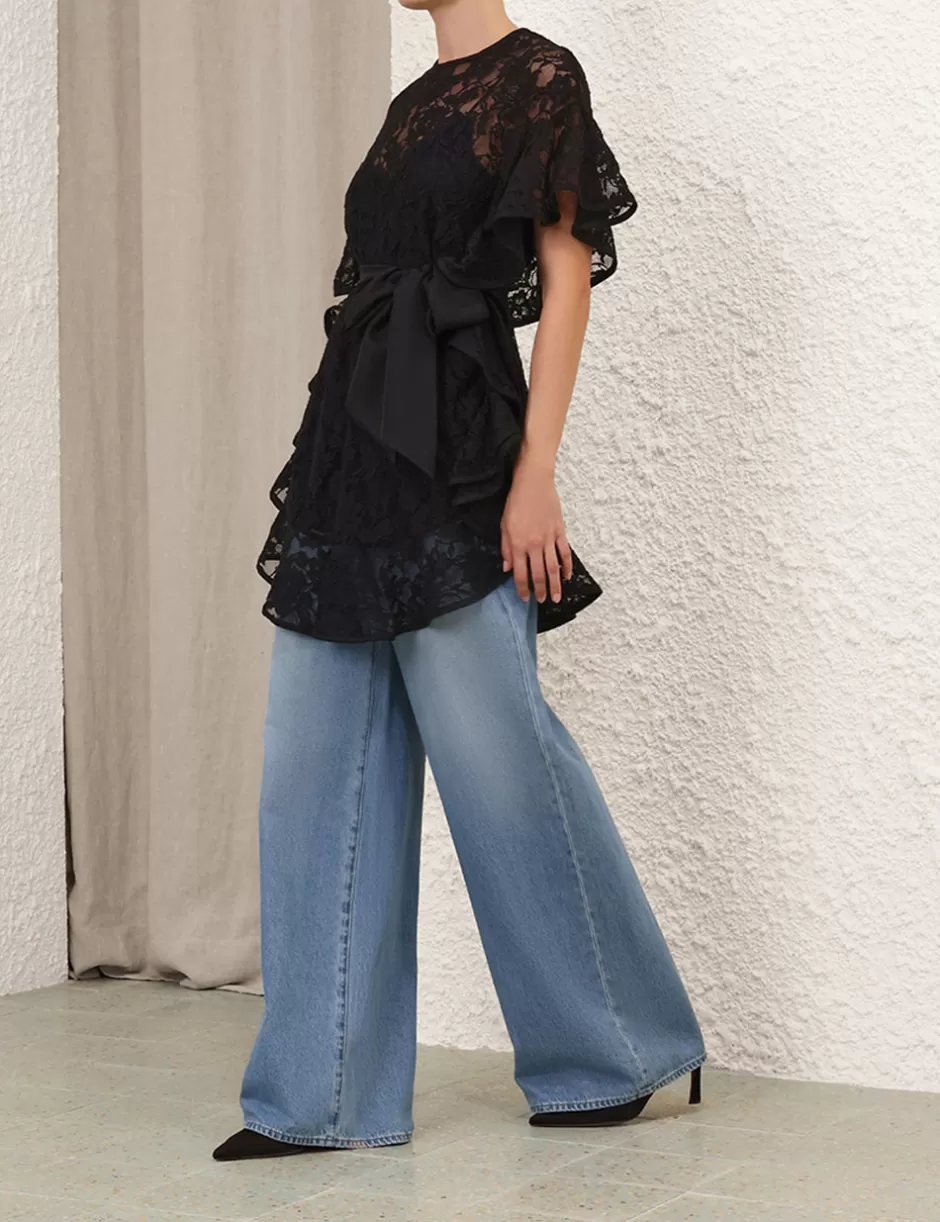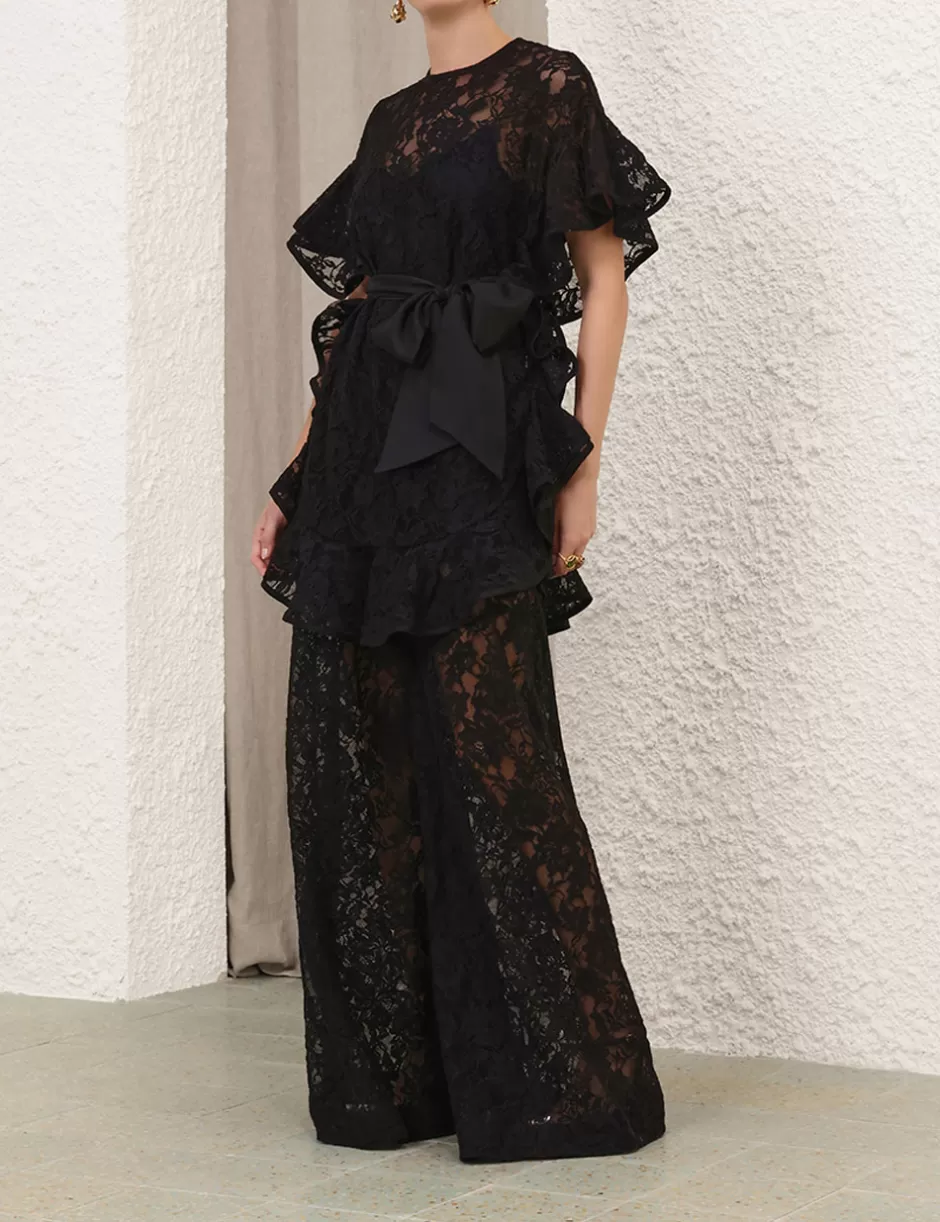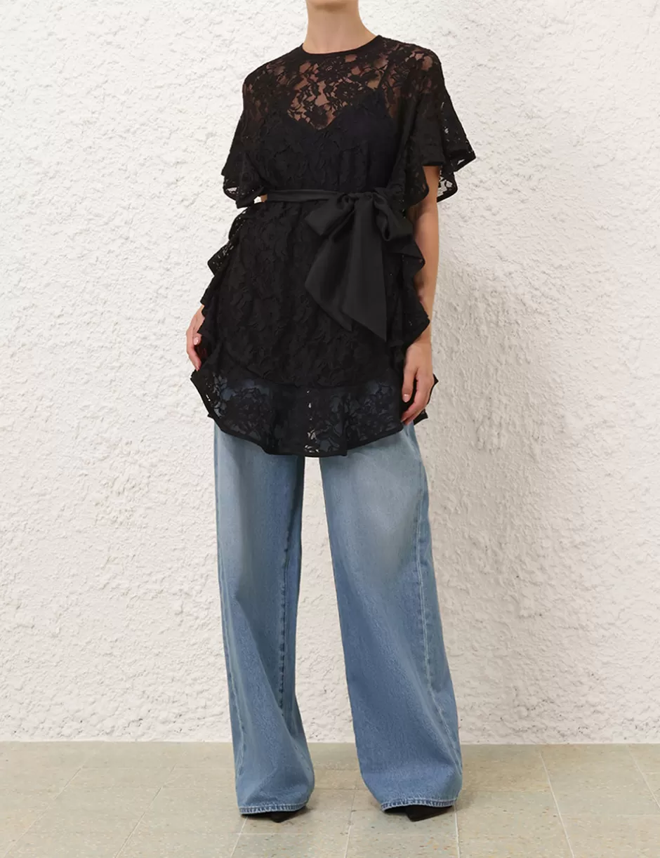 The Crush Lace Frill Tunic in Black from our Resort 2025 Collection, Crush. A lace tunic featuring a scoop neckline, ruffle detailing at the sleeves and body hem, and a removable silk waist tie.