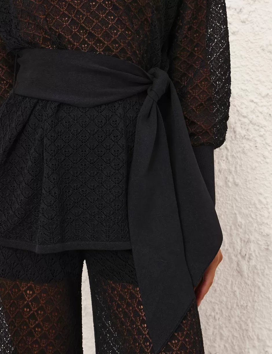 The Crush Pointelle Batwing Top in Black from our Resort 2025 Collection, Crush. A knit top featuring a high neckline, long batwing sleeves with exaggerated elasticated cuffs, and a removable waist belt.