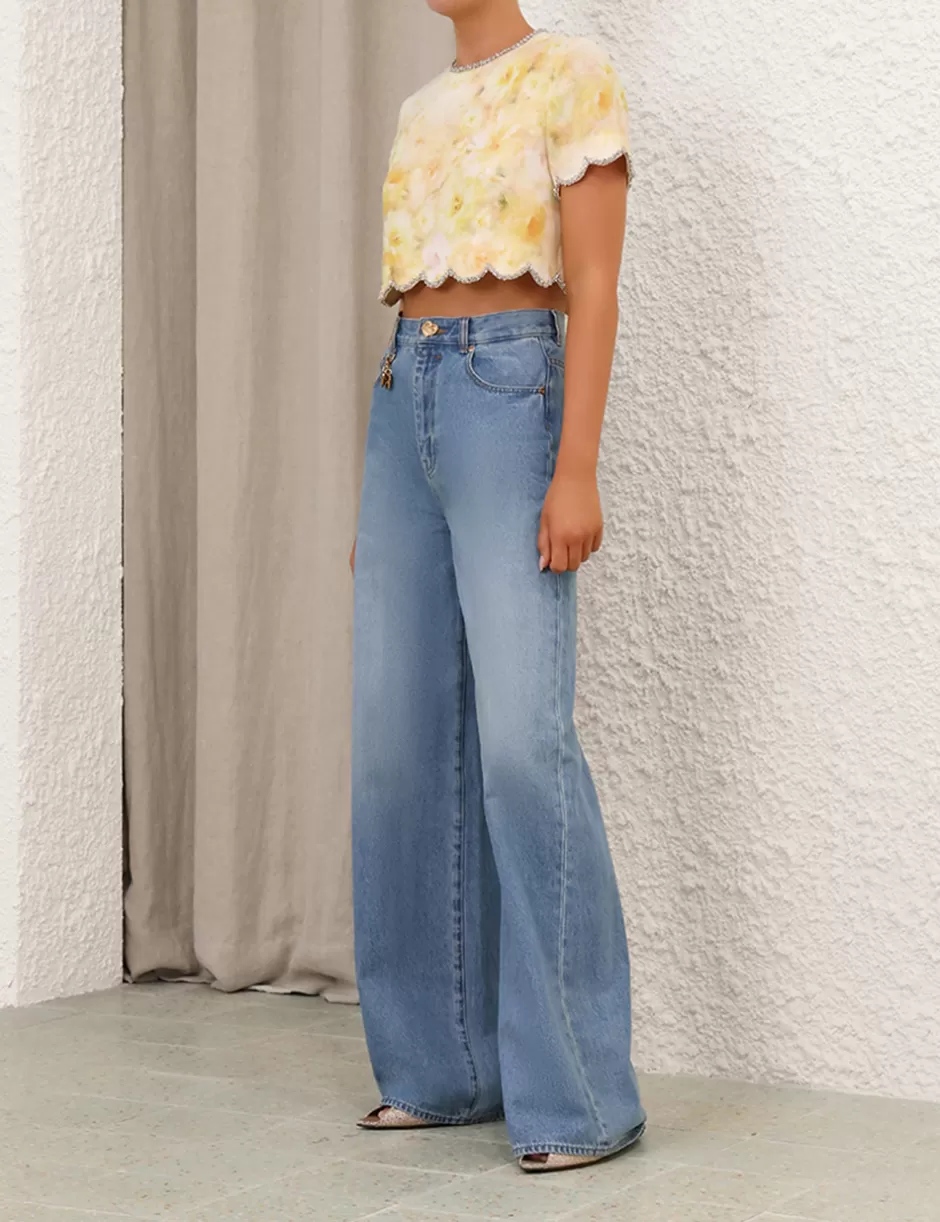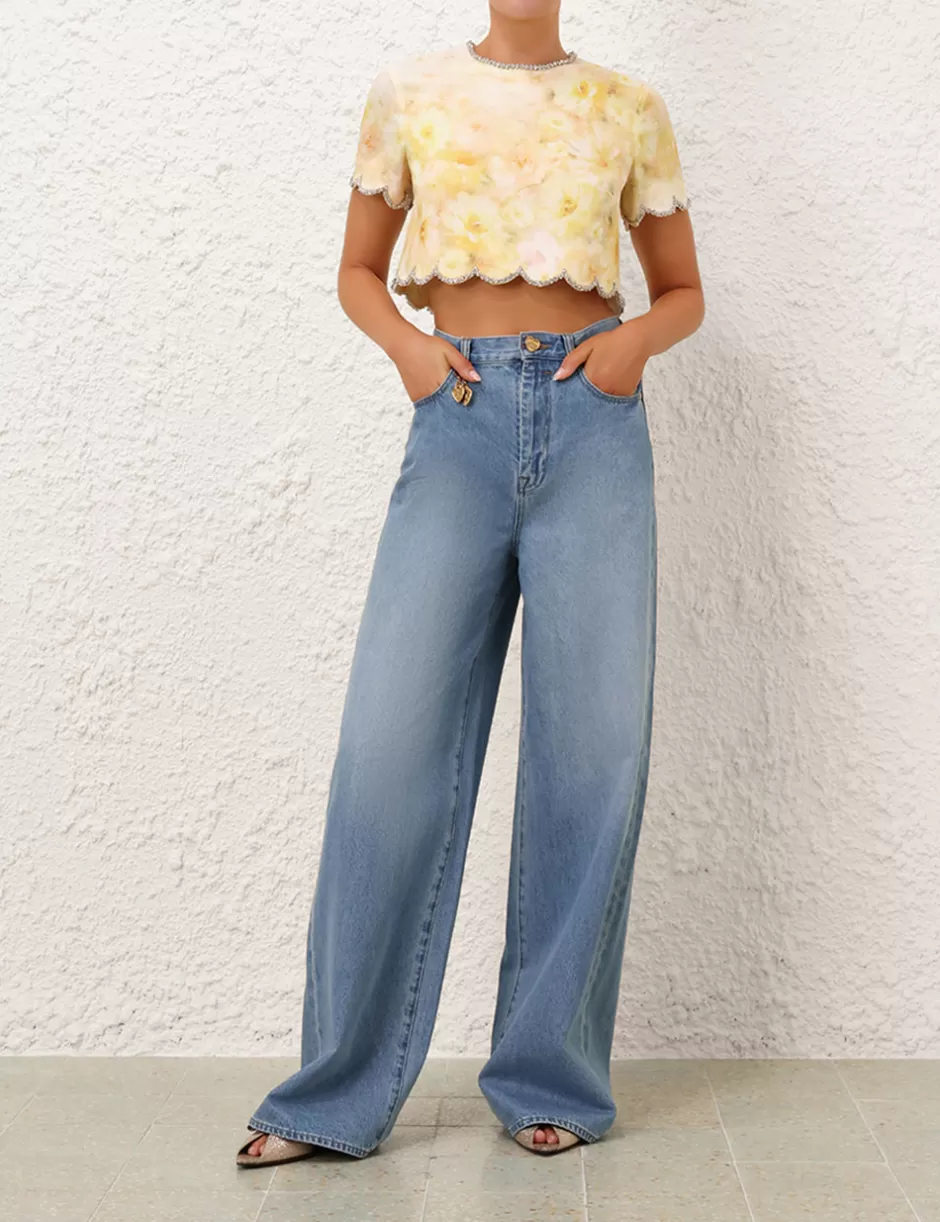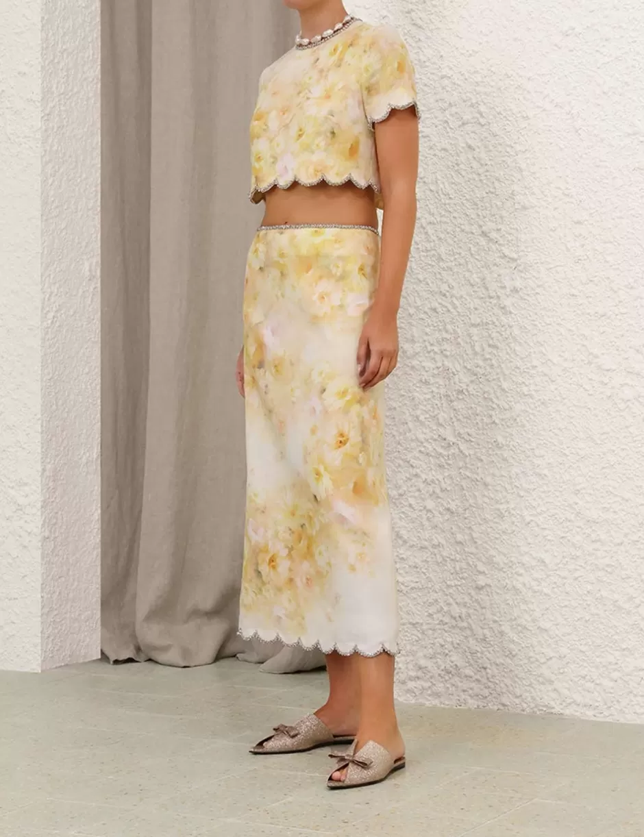 The Crush Scalloped Top in Yellow Floral from our Resort 2025 Collection, Crush. A linen crop top featuring a placement print with scalloped crystal trims around the sleeves and body hemline and a centre back invisible zip closure.