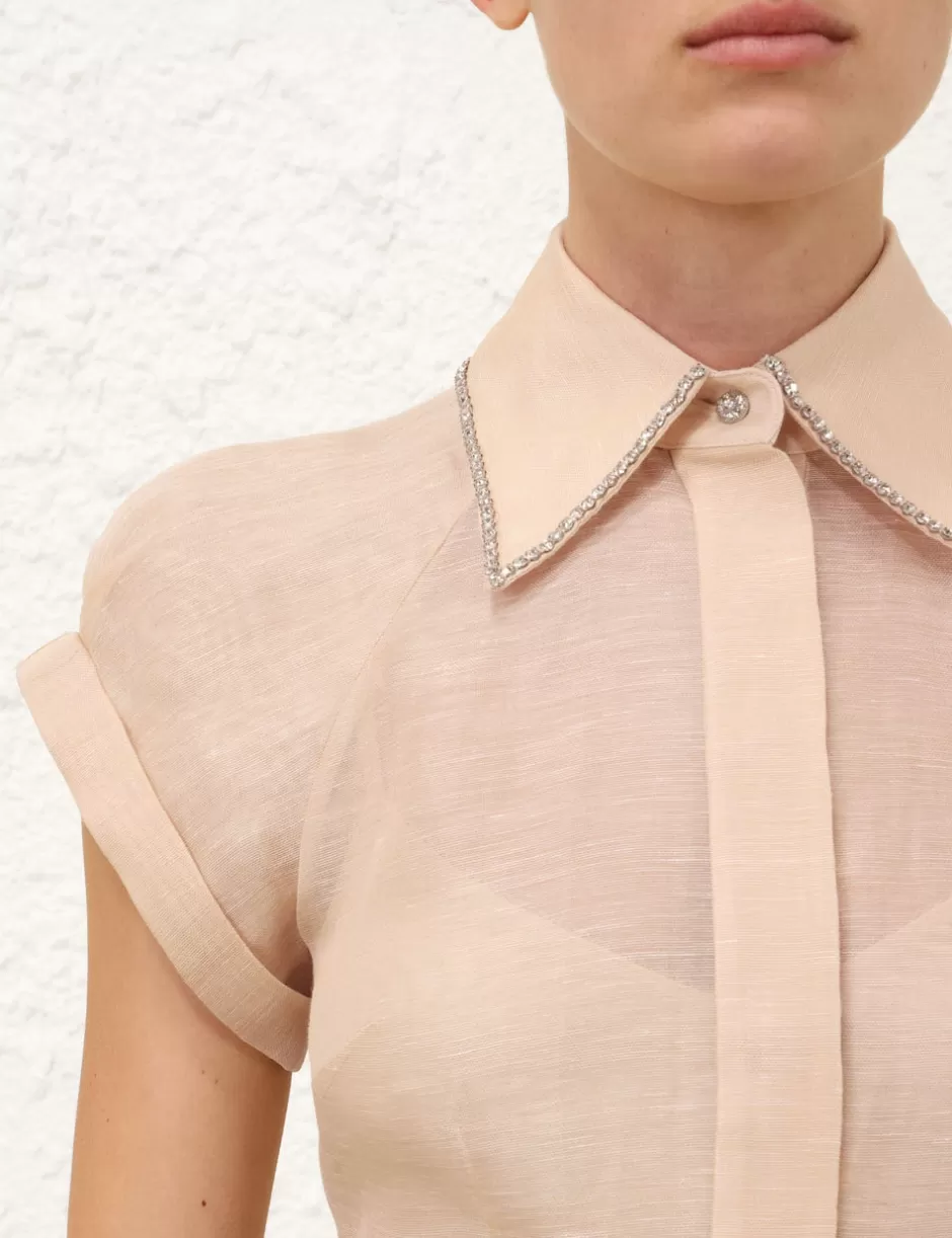 The Eden Fitted Blouse in Cream from our Fall 2024 Collection, In Illustration. A silk linen organza blouse featuring a classic shirt silhouette, cap sleeves and concealed buttons down the centre front.