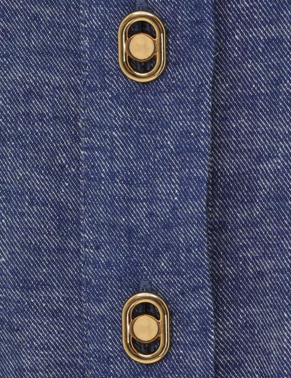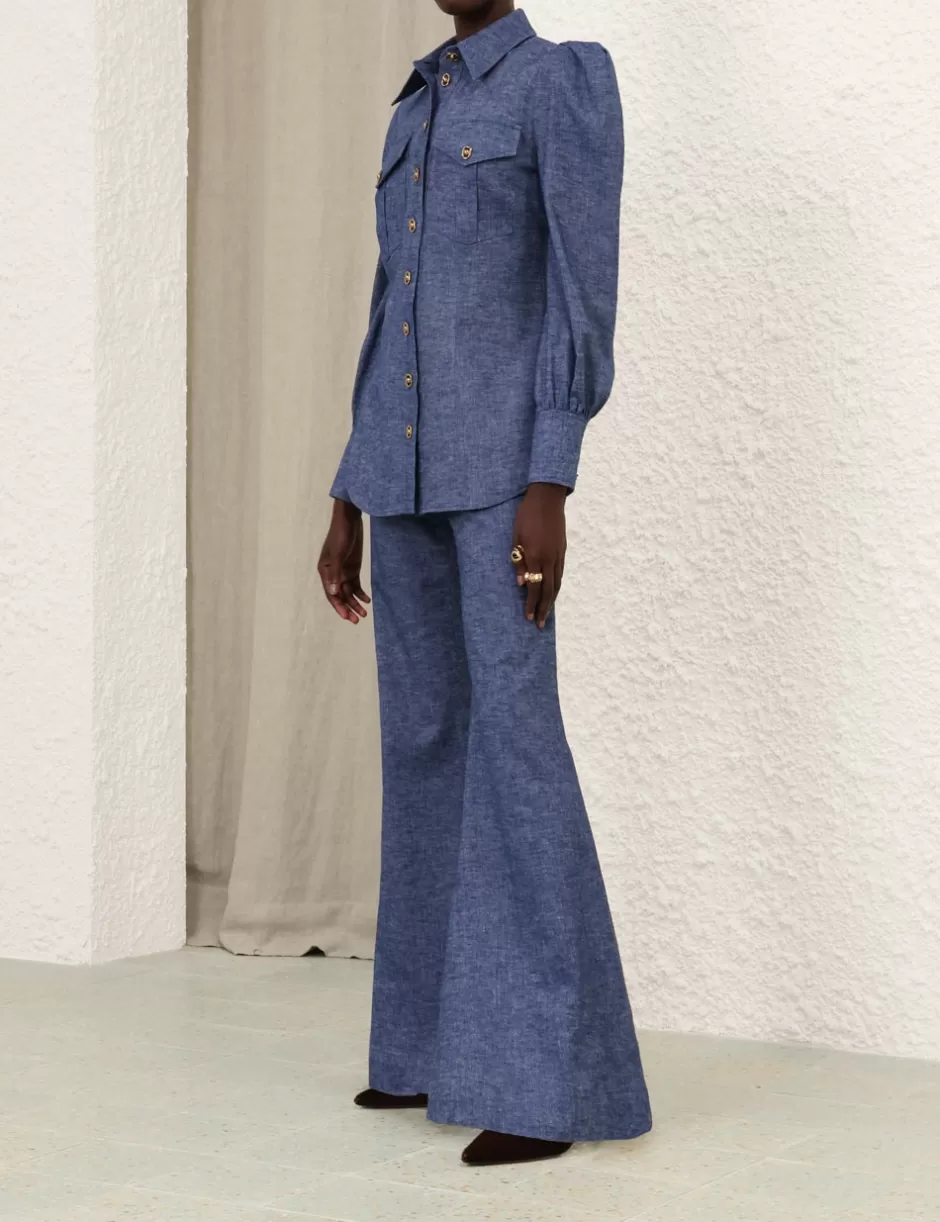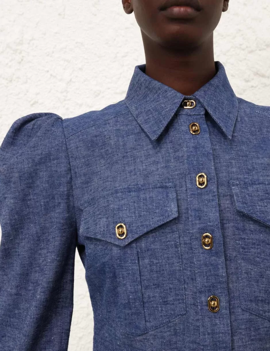 The Eden Chambray Tunic in Chambray from our Fall 2024 Collection, In Illustration. A denim blouse featuring a classic collar, buttons down the centre front and long blouson sleeves with elongated cuffs.