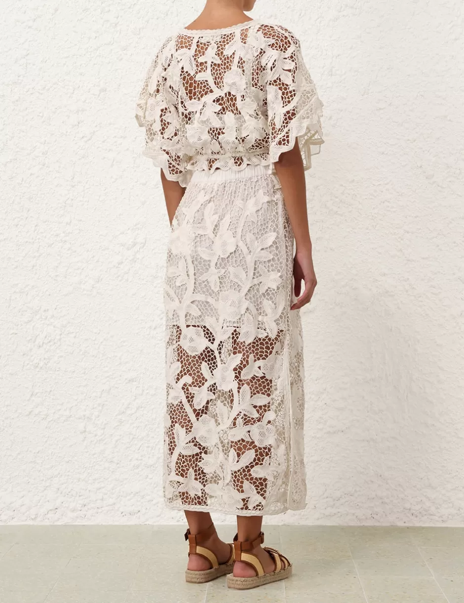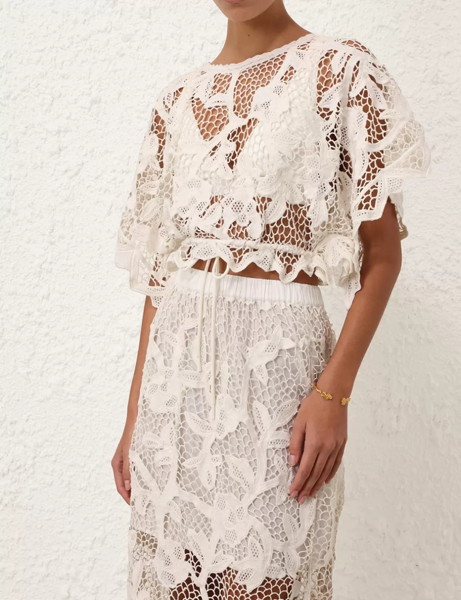The Golden Crochet Lace Top in Ivory from our Summer Swim 2024 Collection. A cropped short sleeve top featuring a crochet scallop trim around neckline and drawstring waistband with rope ties.