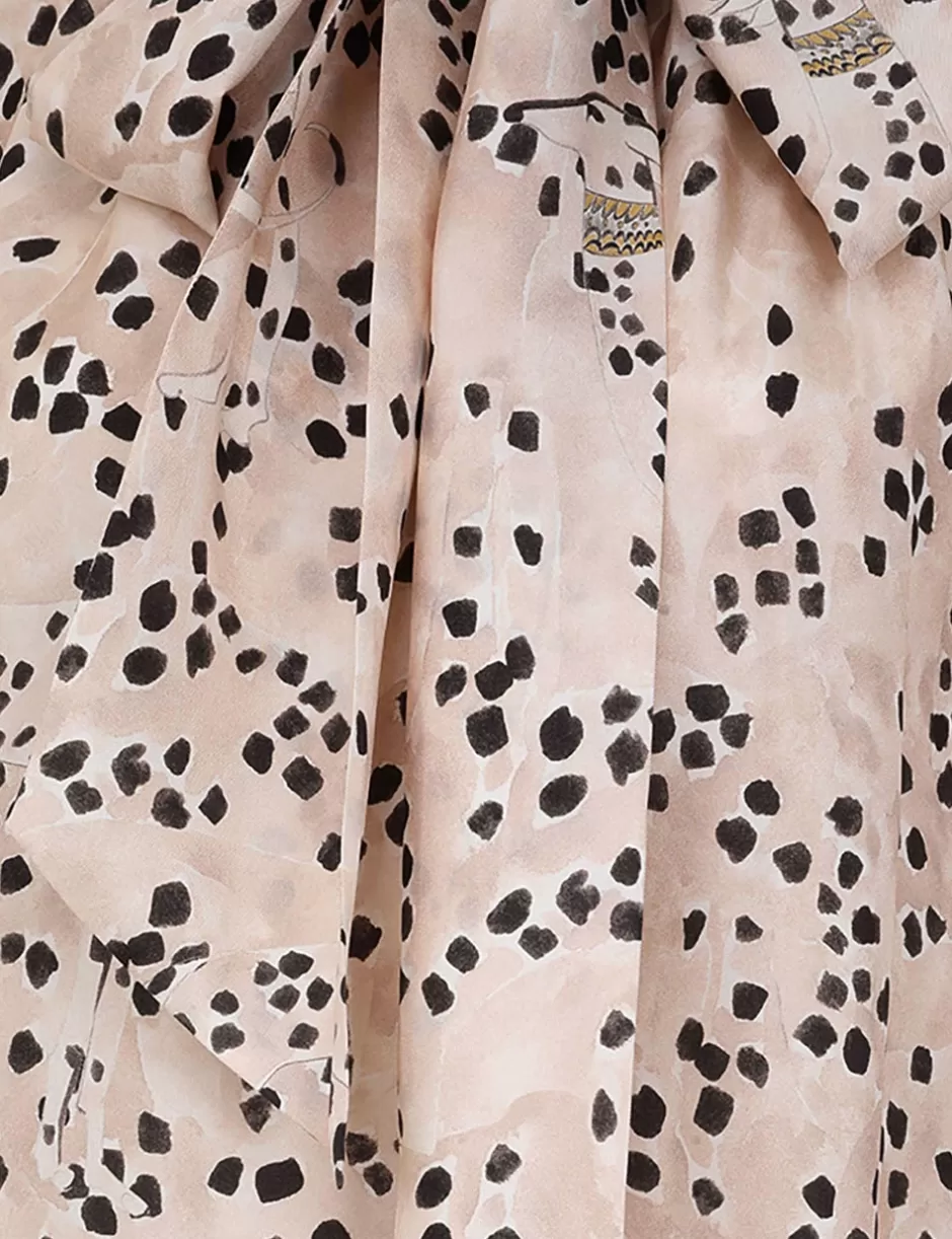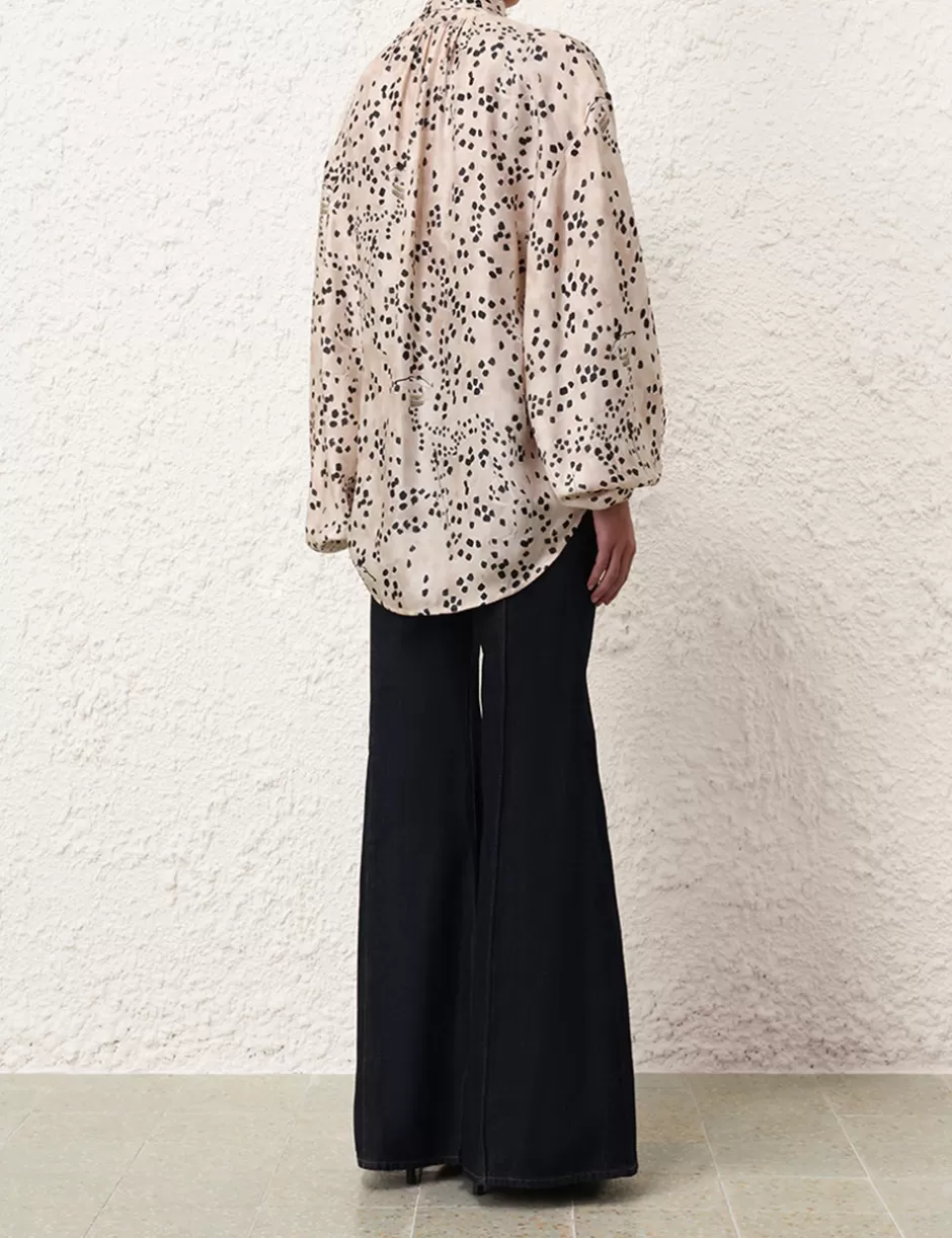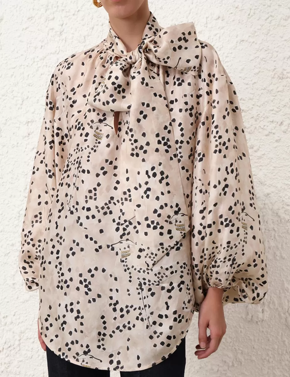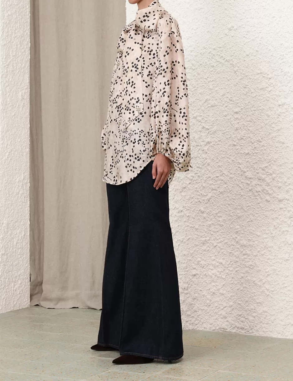 The Illustration Billow Blouse in Dalmatian Dot from our Fall 2024 Collection, In Illustration. A silk long sleeve blouse featuring a statement neck tie and optional V-neck opening.
