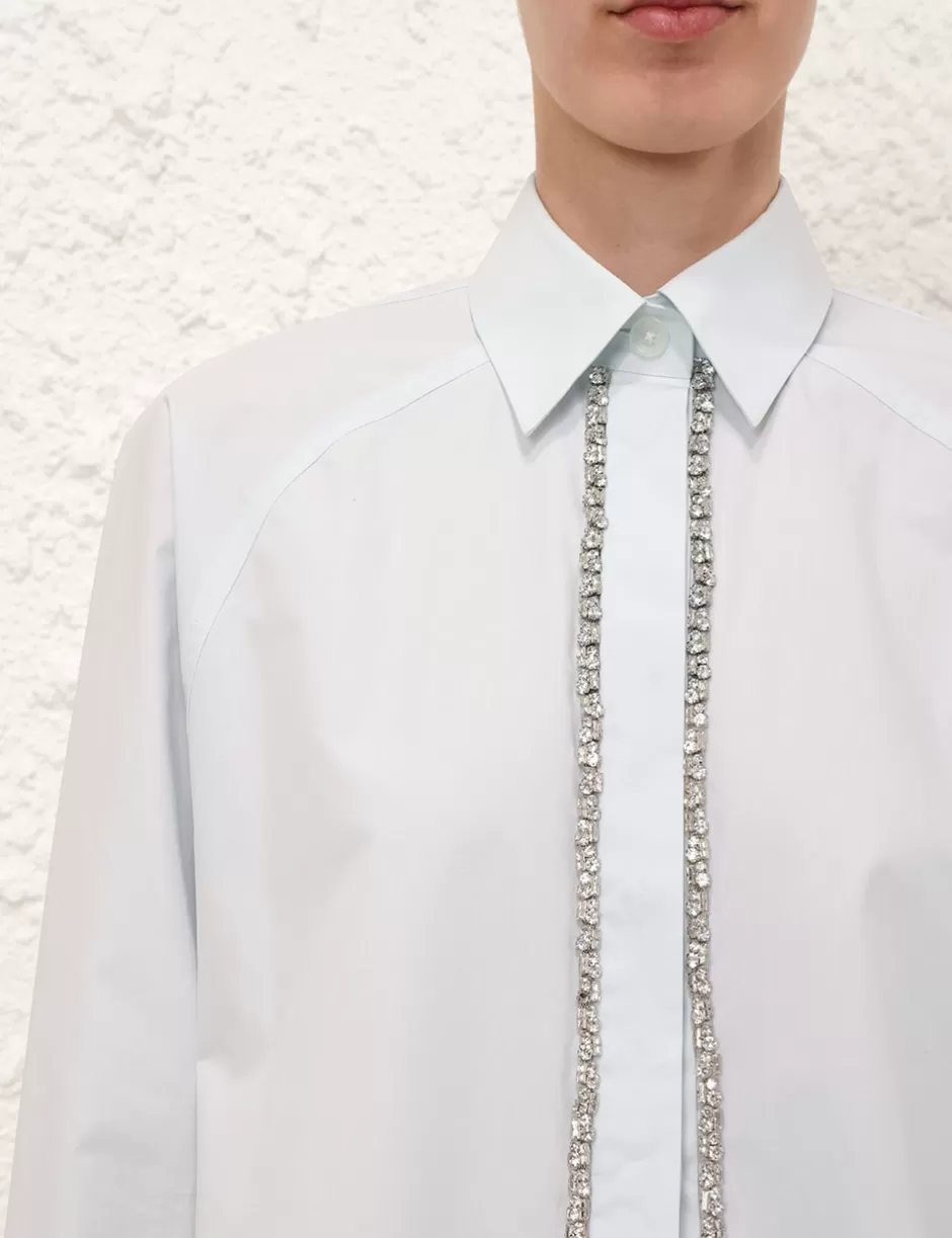 The Illustration Embellished Shirt in Mint from our Fall 2024 Collection, In Illustration. A cotton poplin shirt featuring concealed buttons with a diamante trim down the centre front placket; finished with tucks at sleeve hem and buttoned cuffs.