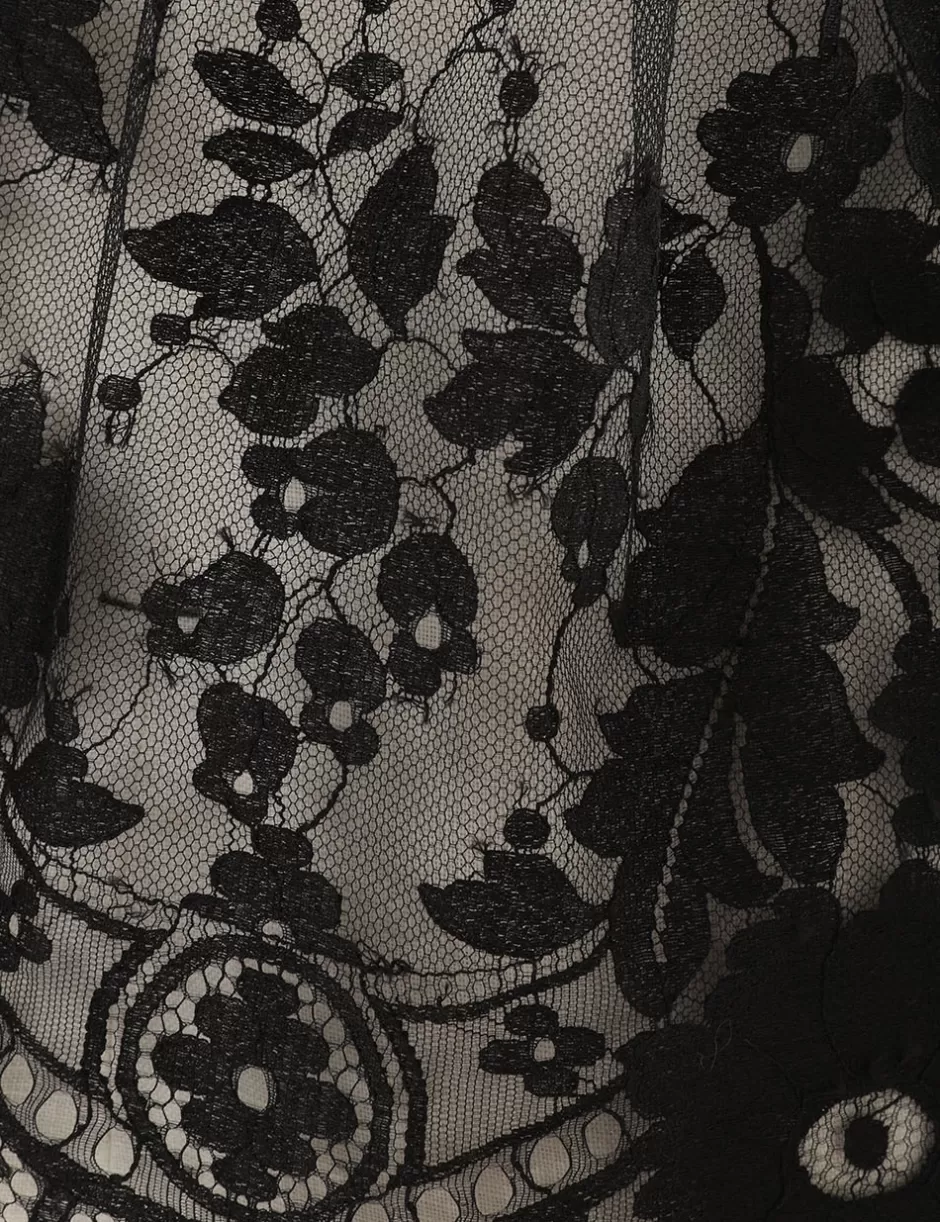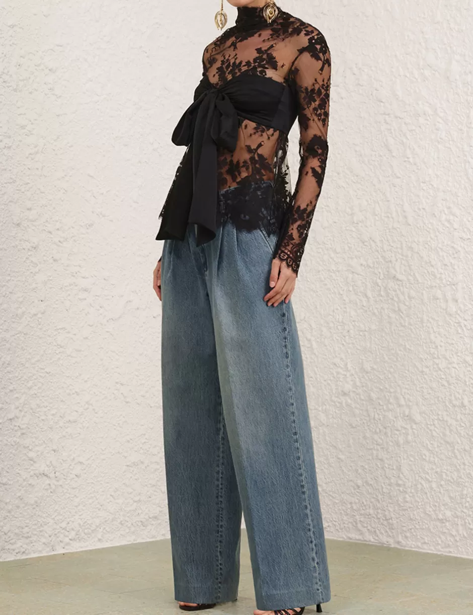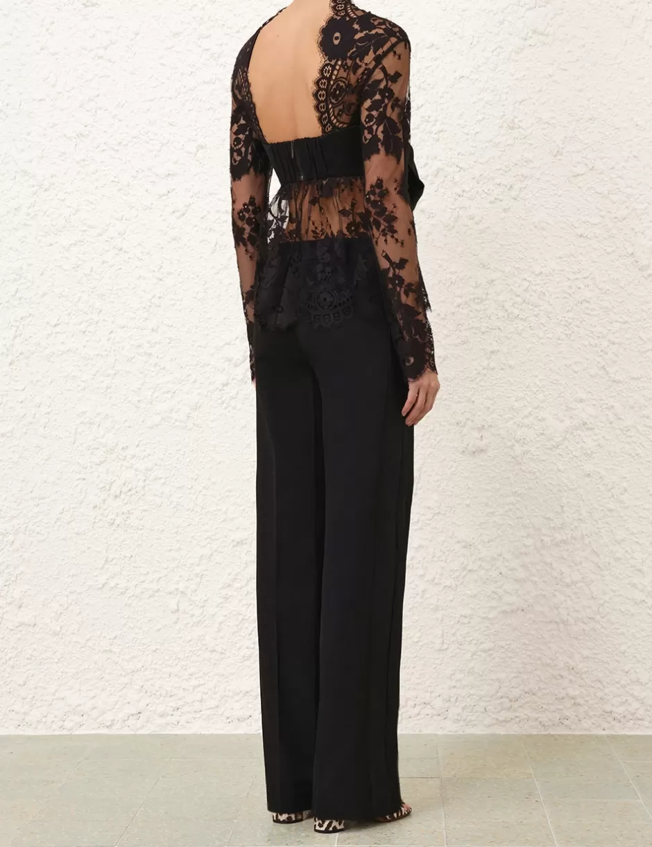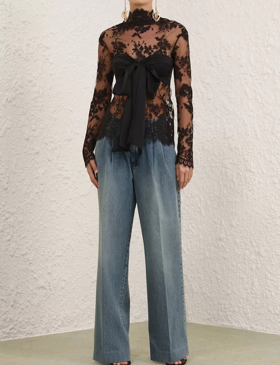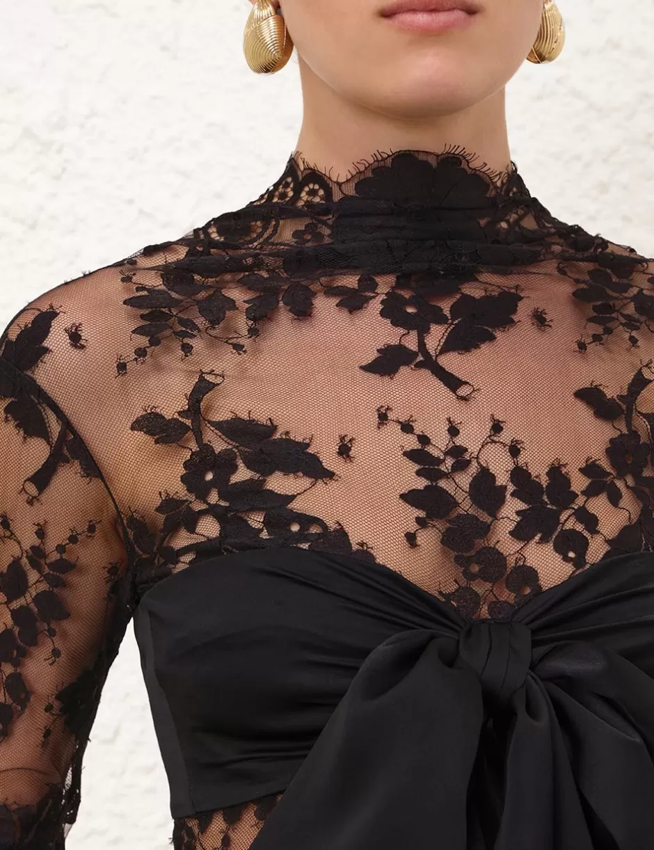 The Illustration Lace Bow Bodice in Black from our Fall 2024 Collection, In Illustration. A lace long sleeve bodice featuring a centre back zip with an elasticated panel, lace scallop edge trim on the hem and sleeves; finished with a detachable centre bust bow.