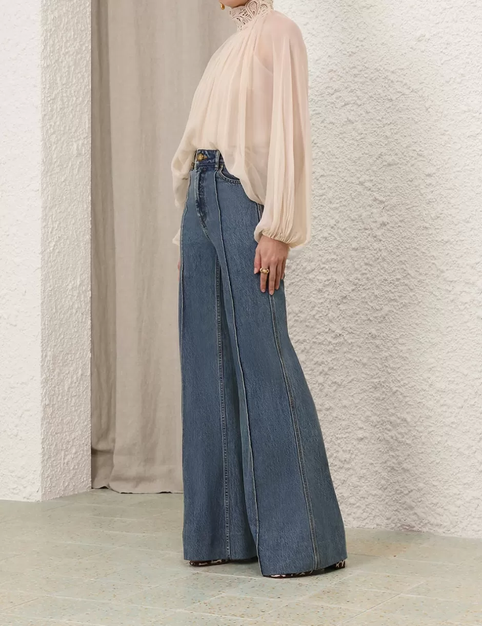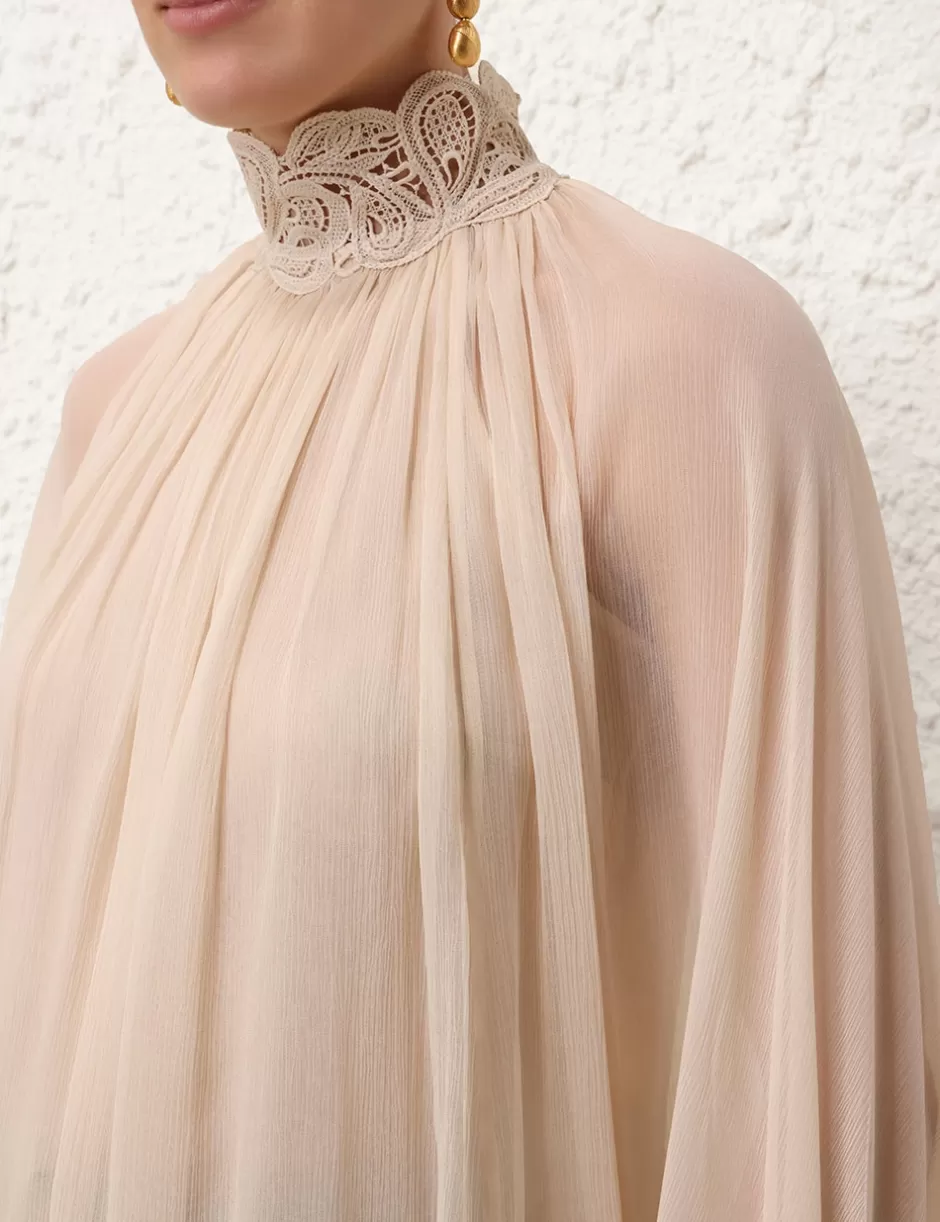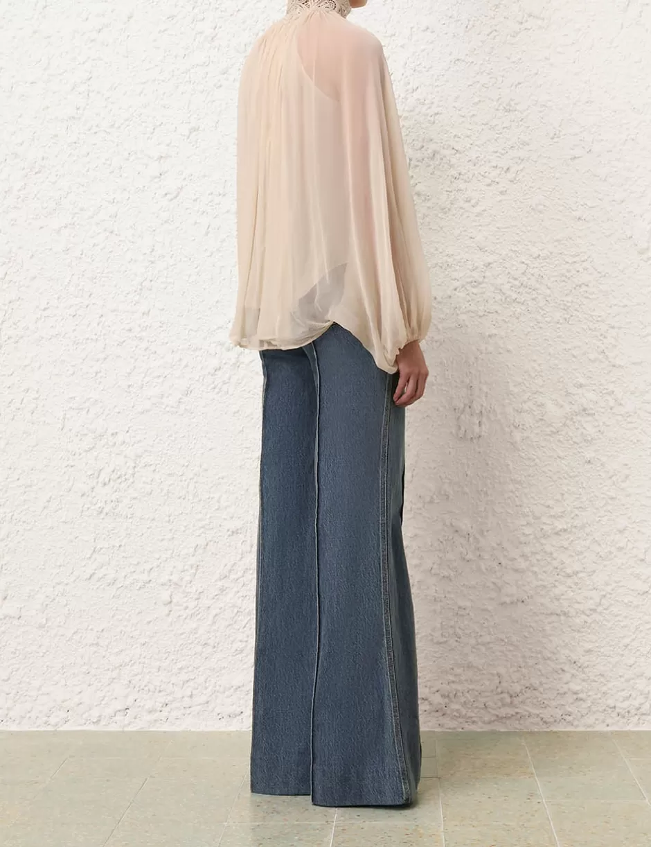 The Illustration Lace Edge Blouse in Cream from our Fall 2024 Collection, In Illustration. A relaxed fit blouse featuring lace trim around the neckline, elasticated cuffs and heavy gathering throughout.